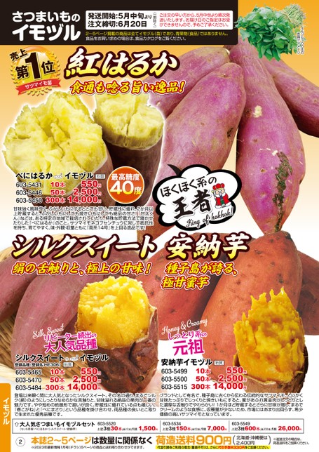 イモヅル100本のお届けイメージご注文の早い方から、5月中旬より順次発送いたします。お届け日のご指定はお受けできませんので、予めご了承ください。(一部除く)発送開始:5月中旬より注文締切:6月20日2〜5ページ掲載の商品は全てイモヅル(苗)であり、青果物(食品)ではありません。食品をお買い求めの場合は、食品カタログをご覧ください。さつまいものイモヅル売上1第サツマイモ苗位紅はるか食通も唸る旨い逸品!kilSetewSリピーター続出の大人気品種シルクスイートイモヅル※PVP登録品種(登録名:HE306)粘質10本50本550円2,500円300本14,000円603-5465603-5470603-5484登場以来瞬く間に大人気となったシルクスイート。その名の通り、まるでシルク(絹)のようにしっとりなめらかな舌触りと、甘味溢れる絶品の果肉が一番の魅力です。やや短めの紡錐形で揃いが良く、貯蔵性に優れている点も嬉しい。『春こがね』と『べにまさり』という品種を掛け合わせ、両品種の良いとこ取りで生まれた優秀品種です。HayCeerm&ynoしっとり系の元祖粘質550円2,500円300本14,000円安納芋イモヅル10本603-549950本603-5500603-5515ブランドとして有名で、種子島に古くから伝わる伝統的なサツマイモ。とにかく甘味たっぷりでじっくりと焼きいもにすると、蜜があふれ黄金肉がしっとりとした濃厚な舌触りでやわらかい!1か月ほど貯蔵するとさらに甘味が増し、まるでクリームのような食感に。収穫量が少ないため、市場にはあまり出回らず、希少価値の高いサツマイモとなっています。大人気さつまいもイモヅルセット(セット内容:べにはるか・シルクスイート・安納芋)603-5520上記3種30本(各10本)1組1,500円2本誌2〜5ページは数量に関係なく※2023年最新情報1月号(チラシ)5ページの商品と送料取り合わせができます。603-5534上記3種150本(各50本)1組7,000円荷造送料900円603-5549上記3種600本(各200本)1組()北海道・沖縄便は2,400円代金引換をご利用の場合(離島不可)は、さらに代引手数料330円をご加算ください。26,000円※追加注文の場合は、荷造送料をご加算ください。イモヅル※PVPべにはるかイモヅル603-5431603-5446603-5450550円2,500円300本14,000円10本50本粉質最高糖度甘味強く風味良く、ふかしいもにするととても甘い。貯蔵性に優れ、2か月以上貯蔵すると、ふかしいもにしても焼きいもにしても絶品の甘さ!『甘太くん』などは、ある特定の地域で栽培されていたり、特殊な貯蔵方法で寝かせたりした『べにはるか』のこと。サツマイモネコブセンチュウに対して抵抗性を持ち、育てやすく、味・外観・収量ともに『高系14号』を上回る逸品です!ほくほく系の王者hfogniK!kohkoシルクスイート安納芋絹の舌触りと、極上の甘味!種子島が誇る、極甘蜜芋