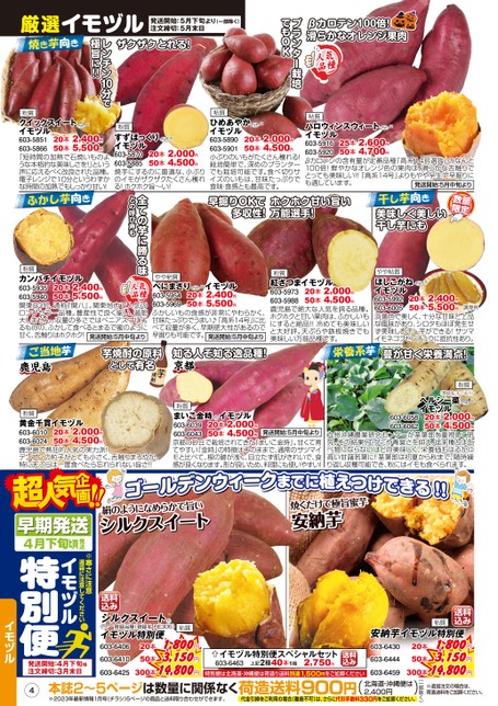 βカロテン100倍!滑らかなオレンジ果肉人気品種プランター栽培でもOK粘質※20本2,000円50本4,500円ひめあやかイモヅル603-5890603-5901小ぶりのいもがたくさん穫れる!栽培簡単で、深めのプランターでも栽培可能です。食べ切りサイズのいもは、甘味たっぷりで食味・食感とも最高です。※粘質ハロウィンスウィートイモヅル603-5916603-5920βカロテンの含有量が定番品種『高系14号選抜』のなんと100倍!鮮やかなオレンジ色の果肉は、滑らかな舌触りでとっても美味しい!!『高系14号』よりもやや早生で早掘りにも適しています。発送開始:5月中旬より25本2,600円50本4,700円厳選イモヅル発送開始:5月下旬より(一部除く)注文締切:5月末日ザクザクとれる!レンチン1極旨に!!0分で※粉質粉質クイックスイートイモヅル603-5851603-586620本2,400円50本5,500円「短時間の加熱で石焼いものような本格的な美味しさを!」という声に応えるべく改良された品種。電子レンジで10分というわずかな時間の加熱でもしっかり甘い!※すずほっくりイモヅル603-5870603-5885焼芋にするのに最適な、小ぶりのイモがザクザクたくさん穫れる!ホクホク旨〜い!20本2,000円50本4,500円粉質20本2,000円50本4,500円まいこ金時イモヅル603-6039発送開始:5月中旬より603-6043京都の砂丘で栽培されてきた『まいこ金時』。甘くて育てやすい『金時』の特徴はそのままで、通常のサツマイモと比べて、根の跡が浅く、目立たず肌がきれいで、食感が良くなります。形が良いため、料理にも使いやすい!(登録名:すいおう)へルシー菜イモヅル※603-6058603-606220本2,000円50本4,500円九州沖縄農業研究センターが茎葉部を重視して研究。その結果、エグミや青臭さを抑え、従来種とは比べ物にならないほどの美味しく、栄養価もはるかに高い甘藷若葉に!茎葉部は初夏から秋まで、随時繰り返し収穫可能でき、秋にはイモも食べられます。早掘りOKで多収性!ホクホク甘い旨い万能選手!美味しく美しい干し芋にも※やや粘質べにまさりイモヅル20本2,400円603-595450本5,500円603-5969ふかしいもの食感が非常にやわらかく、甘味たっぷりでうまい♪「高系14号」に比べて収量が多く、早期肥大性があるので早掘りも可能です。発送開始:5月中旬より20本2,000円50本4,500円粉質紅さつまイモヅル603-5973603-5988鹿児島で絶大な人気を誇る品種。ホクホクと甘い果肉は、ふかしいもにすると絶品!!冷めても美味しいと大好評。天ぷらや鉄板焼きでも美味しい万能品種です。※やや粘質ほしこがねイモヅル603-5992603-6005淡黄色で美しく、十分な甘味と上品な風味があり、シロタもほぼ発生せず美味しい干し芋ができる!サツマイモネコブセンチュウに抵抗性あり。20本2,400円50本5,500円調理例全ての芋に勝る味との呼び声も粉質20本2,400円50本5,500円カンパチイモヅル人気603-5935品種603-5940関東83号、通称『関八』。関東地方で人気のロングセラー品種。豊産性で良く揃い、過肥大しません。収量の多さではベニアズマに劣るものの、ふかして食べるとまるで蜜のように甘く、舌触りはホクホク!発送開始:5月中旬より鹿児島芋焼酎の原料として有名知る人ぞ知る逸品種!京都蔓が甘く栄養満点!粉質粉質20本2,000円50本4,500円黄金千貫イモヅル603-6010603-6024鹿児島で熱狂的人気の実力派!デンプンの粒子がとても小さく、舌触りまろやか。特に天ぷらは一度食べたら忘れられない旨さ!!画企画企気超人超人気絹のようになめらかで旨いシルクスイートシルクスイート焼くだけで極旨蜜芋安納芋安納芋送料込みシルクスイートイモヅル特別便※登録品種(登録名HE306)603-6406603-6410603-64251,800円20本3,150円50本300本14,800円粘質送料込み粘質安納芋イモヅル特別便イモヅル特別便スペシャルセット送料込み上記2種40本1組2,750円603-6463特別便は北海道・沖縄便は荷造り送料別途1,500円をご加算ください603-6430603-6444603-64591,800円20本3,150円50本300本14,800円※追加注文の場合は、荷造送料をご加算ください。(一部除く)荷造送料900円()北海道・沖縄便は2,400円代金引換をご利用の場合(離島不可)は、さらに代引手数料330円をご加算ください。4本誌2〜5ページは数量に関係なく※2023年最新情報1月号(チラシ)5ページの商品と送料取り合わせができます。※寒さに注意遅霜に注意してくださいイモヅル特別便イモヅル発送開始:4月下旬頃注文締切:3月末日