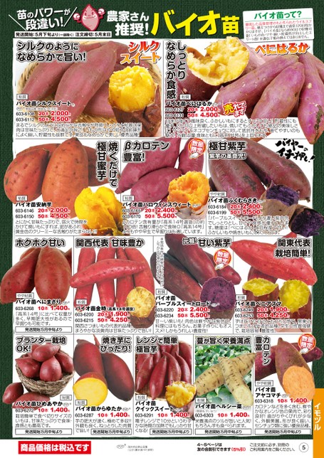 農家さん推奨!バイオ苗バイオ苗って?徹底した品質管理のもと作られたウイルスフリー苗。植えつけから収穫まで通常120日程かかりますが、「バイオ苗」なら約90日で収穫可能!いもの色・ツヤ・揃い・貯蔵性が向上したエリート苗!※遺伝子組み換えではありません。べにはるかβカロテン豊富!極甘紫芋紫芋の革命児!焼くだけで極甘蜜芋元祖!甘い紫芋関東代表栽培簡単!※栽培条件・天候条件により肉色にムラが出る場合があります。ホクホク甘い関西代表甘味豊か粉質バイオ苗金時(高系14号選抜)603-6200603-6215関西さつまいもの代表的品種。まろやかな淡黄肉は甘味たっぷりで旨い!20本1,900円50本4,250円粉質バイオ苗パープルスイートロード20本2,400円603-622050本5,500円603-6234甘〜い紫いも!肉色は鮮やかな紫色で、料理にはもちろん、お菓子作りにもオススメ!しかもうれしい豊産性!※粉質20本1,900円50本4,250円バイオ苗ベニアズマ603-6249603-6253ずば抜けた甘さとホクホク感で、関東さつまいもの代表的品種。早生で性質強健で、栽培容易!豊産性。カロテン豊富焼き芋にぴったり!レンジで簡単極旨芋蔓が旨く栄養満点やや粘質バイオ苗べにまさり603-626810本1,400円「高系14号」に比べて収量が多く、早期肥大性があるので早掘りも可能です。※発送開始:5月中旬よりプランター栽培OK!粘質20本2,000円50本4,500円バイオ苗安納芋603-6146603-6150とにかく甘味たっぷりで、弱火で時間をかけて焼いもにすれば、密があふれ、黄金色のクリーミーな舌触りがたまらない!!粘質20本2,400円50本5,500円バイオ苗ハロウィンスウィート603-6165603-6170βカロテン含有量が『高系14号選抜』の約100倍!舌触り滑らかで食味◎『高系14号』よりもやや早生で早掘りにも適しています。※やや粘質バイオ苗ふくむらさき603-6184603-619920本2,400円50本5,500円※「パープルスイートロード」より濃い紫肉色でしっとりとし、甘さや食感が優れています。糖度は「べにはるか」と同程度で甘い!ふかしいもや焼きいもにオススメです。イモヅル※やや粉質バイオ苗アヤコマチ10本1,400円603-6318カロテンなどを多く含む、鮮やかなオレンジ色の果肉で、彩り良好!曲がりやくびれが少なく、外観美麗。形が良く揃い、センチュウ類に強い優良品種。粘質バイオ苗ひめあやか10本1,400円603-6272栽培簡単で食べ切りサイズのいもは、甘味たっぷりで食味・食感とも最高です。※発送開始:5月中旬より粘質バイオ苗からゆたか10本1,400円603-6287芋の肥大が速く、極めて多収!!外観も良く、ねっとりした肉質で旨い!発送開始:5月中旬より※粉質バイオ苗クイックスイート10本1,400円603-6291電子レンジで10分というわずかな時間の加熱でもしっかり甘くなる!発送開始:5月中旬より※粉質バイオ苗ヘルシー菜※(登録名:すいおう)10本1,400円603-6303栄養満点のツルが旨いと人気!もちろん芋も食べられます。発送開始:5月中旬より発送開始:5月中旬より商品価格は税込ですPVP※…海外持出禁止品種(公示(農水省HP)参照)4〜5ページは友の会割引できます(5%引)ご注文前に必ず、別冊のご利用案内をご覧ください。5※登録品種(登録名:HE306)バイオ苗シルクスイート20本2,000円50本4,500円603-6108603-6112まるでシルクのようになめらかな舌触りが特徴!しっとりと粘質の果肉は甘味たっぷりで、大満足の旨さ!いもの形はやや短めの紡錘形によく揃い、貯蔵性も抜群です。果皮もなめらかで美しい優秀品種!※20本2,000円50本4,500円バイオ苗べにはるか603-6127603-6131甘味が強くて風味良く、ふかしいもにするとすっごく甘い!貯蔵性にも優れ、2か月以上貯蔵したいもは、焼いてもふかしても絶品の美味しさに!サツマイモネコブセンチュウに対して抵抗性をもち、育てやすいのも魅力!外観・収量・食味ともに「高系14号」を上回ります。しっとりなめらか食感粉質シルクスイート発送開始:5月下旬より(一部除く)注文締切:5月末日苗のパワーが段違い!シルクのようになめらかで旨い!粘質