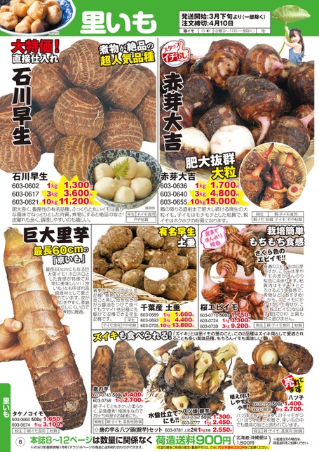 調理例発送開始:3月下旬より(一部除く)注文締切:4月10日種イモ収穫9〜11月(一部除く)畑石川早生1kg3kg1,300円3,600円10kg11,200円603-0602603-0617603-0621肥大良く、豊産性の有名品種。ふっくらと丸いイモは豊かな風味でねっとりとした肉質。煮物にすると絶品の旨さ!皮離れも良く、調理しやすいのも嬉しい。調理例子イモ食用早生やや粘質肥大抜群大粒赤芽大吉1kg3kg1,700円4,800円10kg15,000円603-0636603-0640603-0655霜の降りる直前まで肥大し続ける晩生の大粒イモ。子イモはモチモチとした粘質で、親イモはホクホクの粉質になります。でで皮ま皮まりりののんんほほ桜色桜色桜エビイモ603-0710603-0724603-0739500g1,750円1kg3,300円3kg9,200円千葉産土垂603-0689603-0693603-07051kg3kg1,600円4,400円10kg13,800円最長60cmにもなる巨大里イモ!ホロホロとした食感が特徴で非常に美味しい!!「京いも」とも呼ばれ高級食材として愛されています。皮がむきやすく、煮崩れしにくいので煮物に最適。青果が年中出回る人気品種!煮物はもちろん、皮ごと蒸し、皮をむきながら醤油をつけて食べてもウマイ!他品種に先駆けて収穫できる早生品種です。子イモ食用早生やや粘質晩生親・子イモ食用親イモ:粉質子イモ:やや粘質さくら色の!エビイモ!普通のエビイモは白芽ですが、こちらは芽やイモの皮がほんのり桜色に染まります。粘質肉はモチモチととろけるような食感で、煮物などにおすすめ!しかも、エビイモにかかせない土寄せが、この『桜エビイモ』ならほぼ1回でOK!土質も特に選びません。晩生親・子イモ食用粘質「ズイキ」とは里イモの茎のこと。この2品種はズイキ用として愛培されることも多い美味品種。もちろんイモも美味しい!本誌8〜12ページは数量に関係なく※2023年最新情報1月号(チラシ)6ページの商品と送料取り合わせができます。荷造送料900円()北海道・沖縄便は1,500円代金引換をご利用の場合(離島不可)は、さらに代引手数料330円をご加算ください。※追加注文の場合は、荷造送料をご加算ください。603-0796603-0808植え付け八ツ子しやすい500g1,400円小芋!1kg2,700円八ツ頭は親イモに多くの子イモがつく!!ほっくりした粉質で、里いもの中でも最高の旨さと言われています。粉質親・子イモ、茎食用晩生唐の芋500g1,400円603-07431kg2,700円603-0758親・子イモともホクッと柔らかく、品質優秀!極晩生なのでおせち料理やお雑煮にも。極晩生粉質親・子イモ、茎食用水盤仕立て!にも!603-0781上記2種1kg1組八ツ頭親芋603-0762603-0777500g1,300円1kg2,450円2,550円唐の芋&八ツ頭(親芋)セットタケノコイモ603-0660603-0674500g1,650円1kg3,100円親イモ食用粉質晩生8里いも