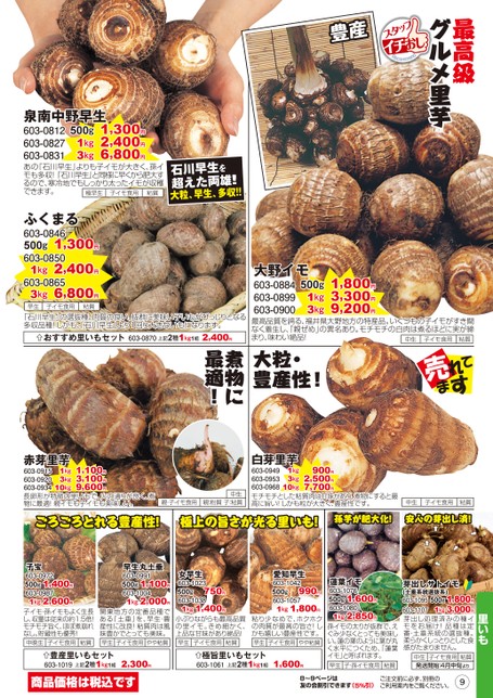 豊産石川早生を超えた両雄!!大粒、早生、多収!!泉南中野早生500g1kg3kg1,300円2,400円6,800円603-0812603-0827603-0831あの『石川早生』よりも子イモが大きく、孫イモも多収!『石川早生』と同様に早くから肥大するので、寒冷地でもしっかり太ったイモが収穫できます。子イモ食用極早生粘質ふくまる603-0846500g603-08501,300円2,400円6,800円603-08651kg3kg早生子イモ食用粘質「石川早生」の選抜種。肉質の良い、抜群に美味い子いもがびっしりとなる多収品種!しかも、石川早生」より1回り大きないもになります。おすすめ里いもセット603-0870上記2種1kg1組2,400円大野イモ500g1kg3kg1,800円3,300円9,200円603-0884603-0899603-0900最高品質を誇る、福井県大野地方の特産品。いくつもの子イモがすき間なく着生し、親ぜめ」の異名あり。モチモチの白肉は煮るほどに実が締まり、味わい絶品!子イモ食用粘質中生中生子イモ食用粘質里いも芽出しサトイモ(土垂系統選抜系)500g1,800円603-10951kg3,000円603-1107芽出し処理済みの種イモをお届け!品種は定番・土垂系統の選抜種。柔らかくしっとりとした食感がたまりません。子イモ食用中生粘質発送開始:4月中旬より8〜9ページは友の会割引できます(5%引)ご注文前に必ず、別冊のご利用案内をご覧ください。9赤芽里芋1kg3kg10kg603-0915603-0920603-0934長卵形が特徴の里いもで、火の通りが良く、煮物に最適!親イモも子イモも美味しい。1,100円3,100円9,600円白芽里芋1kg3kg10kg603-0949603-0953603-0968モチモチとした粘質肉は甘味があり、煮物にすると最高に旨い!しかも粒が大きく、豊産性です。900円2,500円7,700円親・子イモ食用親:粉質子:粘質中生子宝603-0972500g1,400円603-09871kg2,600円子イモ・孫イモもよく生長し、収量は従来の約1.5倍!モチモチ旨く、ほぼ煮崩れなし。貯蔵性も優秀!中晩生子イモ食用粘質早生丸土垂603-0991500g1,100円603-10041kg2,000円関東地方の定番品種である『土垂』を、早生・豊産性に改良!粘質肉は風味豊かでとっても美味。早生やや粘質子イモ食用豊産里いもセット上記2種1kg1組603-10192,300円商品価格は税込です女早生603-1023500g603-10381kg1,400円750円小ぶりながらも最高品質の里イモ。きめ細かく、上品な甘味があり絶品!早生子イモ食用粘質990円愛知早生603-1042500g603-10571kg1,800円粘り少なめで、ホクホクの肉質が最高の旨さ!しかも嬉しい豊産性です。早生やや粘質子イモ食用極旨里いもセット上記2種1kg1組603-10611,600円蓮葉イモ603-1076500g1,600円603-10801kg2,850円孫イモの太りが抜群で、えぐみ少なくとっても美味しい。蓮の葉のように葉が丸く水平につくため、蓮葉イモ」と呼ばれます。早生子・孫イモ食用粘質