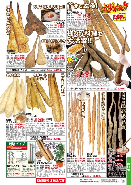 自然薯の最高級品質イメージ自然薯大地の子603-2074603-20893個6個1,600円3,000円13,500円603-209330個天然じねんじょの選抜・育成により誕生!一般種より葉が厚くがっちりしており、天候不順でも力強く育つ!皮ごととろろにでき、比類ない強い粘りと抜群の風味を楽しめます。山いも環境適応型自然薯粘りが強いイメージ首まで太る!長いも10個30個とっくり形長いも2,000円603-19515,200円603-1966100個15,000円603-1970従来の長いもに比べ、首部までしっかり肥大!耐病性に優れ作りやすい早生品種です。収穫時の長さ70〜80cm1個あたり150円(とっくり形いも100個の場合)様々な料理で大活躍!!調理例:長いものグラタン長いもトロロトロフィー1066603-1985603-1990603-20025個15個50個1,800円4,600円13,500円「トロフィー」の名に恥じない堂々とした長いも。粘りが非常に強く、従来の長いもよりも変色しにくので、すりおろしてとろろはもちろん、短冊切りにしてサラダにしても白くてキレイに仕上がります。収穫時の長さ50〜60cm人気の長いもセット603-2017上記2種15個1組(とっくり形長いも10個トロフィー10665個)3,400円調理例山芋の揚げ物山いもげんこつ次郎5個1,600円603-183010個2,900円603-1844肌は粗く黒褐色で、多くは塊状になります。肉質緻密で粘り強く、掘り上げも簡単!収穫時の長さ25〜35cm大きさ・香り・粘り良し!!調理例:とろろそばイチョウいも仏掌いも5個1,600円603-181010個2,900円603-1825仏様の手のような形をした約400gの巨大いも!香り高く粘り強く、極上です!!収穫時の長さ20〜30cm掘り上げラクラクイチョウいもバチいも5個1,600円603-179410個2,900円603-1806コクと旨味が豊かで、外観美麗!美しいムカゴもたくさん採れてお得です。収穫時の長さ20〜30cm風味豊かで品質優秀濃厚山いもセット603-1859上記3種15個1組4,250円長いもの決定版栽培簡単ねば〜る長いも商品価格は税込です10〜11ページは友の会割引できます(5%引)ご注文前に必ず、別冊のご利用案内をご覧ください。11自然薯白金とろろ2個1,300円603-20404個2,400円603-2055自然薯の中では比較的環境の変化に強く育てやすい品種です。アクも少なめで根強いファンが多く、高リピート率!!自然薯じねんじょ603-2021603-20362個2,000円4個3,600円『山菜の王者』と昔からいわれる自然薯。とにかく粘りが強く、風味とコクが素晴らしい!最高の「とろろ汁」が味わえます。自然薯セット鉢植えイメージ603-2060上記2種4個1組3,000円長いもムカゴ990円100g300g2,700円プチ長いも603-1932603-1947いもの長さが15〜20cmと短く、プランター栽培OK!!小さくても、味は超一流!つるはグリーンカーテンとしても楽しめます。プランター栽培OKお届け見本→イメージ普通栽培パイプ栽培栽培パイプ送料無料(北海道・沖縄便は別途1,500円)※送料の取り合わせ対象外長いもパイプ長さ105cm栽培の手引書付き()603-21105本1組4,400円じねんじょパイプ長さ135cm栽培の手引書付き()603-21055本1組4,800円※長芋パイプとじねんじょパイプは友の会割引できません。調理例長いも信州長いも5個1,200円603-186310個2,200円603-1878信州地域で栽培されている代表的品種。甘味があって粘り気が強いのが特徴。耐病性があり、早掘りも可能で育てやすい。収穫時の長さ70〜80cm長いもねばりいも5個1,200円603-188210個2,200円603-1897長いもの中でも、特に強い粘りをもつことが名の由来。甘味のあるきめ細やかな長いもです。とろろ汁にすると絶品!収穫時の長さ50〜70cm長いもN-105個1,300円603-190910個2,400円603-1913シャキッとした歯触りが特徴の長いも。生はもちろん、焼き物や煮物、色々な料理で大活躍!高級長いもセット603-1928上記2種10個1組2,300円