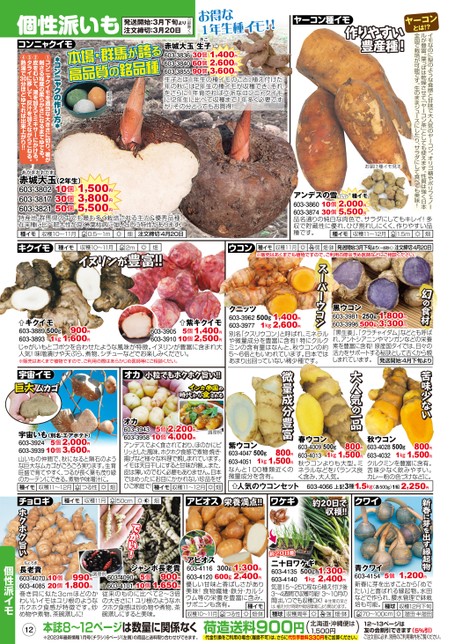 ヤーコンとは!?イモなのに梨のような食感と甘味で大人気のヤーコン。オリゴ糖やポリフェノールが豊富。葉っぱは乾燥させて「ヤーコン茶」としても使えます。性質は強く日本全国で栽培が可能です。生のままジュースにしたり、サラダにして食べても美味!ヤーコン種イモ作りやすい豊産種!お届け種イモ見本お得な1年生種イモ!!(一部除く)個性派いも発送開始:3月下旬より注文締切:3月20日きご30個1,400円60個2,600円90個3,600円赤城大玉生子603-3836603-3840603-3855生子とは1年生の種イモのこと。植え付けた年の秋には2年生の種イモが収穫でき、それをさらに1年育てれば立派なコンニャクイモに!2年生に比べて収穫まで1年多く必要ですが、その分とってもお買得!本場・群馬が誇る本場・群が誇る高品質の銘品種品質の銘品種調理例コンニャクイモ*コンニャクの作り方*①コンニャクイモを適当な大きさに切り、箸が刺さる程度の柔らかさになるまでゆでる。②皮をむいて、湯を加えてミキサーにかける。③タライに移して、灰汁を加えながらこねる。④熱湯で30分ほどゆでれば出来上がり!!※PVP種イモ10個2,000円30個5,500円アンデスの雪603-3860603-3874品名通りの純白な肉色で、サラダにしてもキレイ!多収で貯蔵性に優れ、ひび割れしにくく、作りやすい品種です。畑収穫11〜12月種イモ1.5mウコン収穫11月種イモ※販売はあくまでも植物ですので、ご利用の際は予め医師などにご相談ください。発送開始:3月下旬より(一部除く)注文締切:4月20日畑・鉢弱幻の食材幻の食材500g1,400円1kg2,600円クニッツ603-3962603-3977別名「クスリウコン」と呼ばれ、ミネラルや微量成分を豊富に含有!特にクルクミンの含有量はなんと、秋ウコンの約5〜6倍ともいわれています。日本ではあまり出回っていない稀少種です。黒ウコン603-3981603-3996250g1,800円500g3,300円「黒生姜」、クラチャイダム」などとも呼ばれ、アントシアニンやマンガンなどの栄養素を豊富に含有!原産国タイでは、日々の活力をサポートする秘訣として古くから親しまれています。発送開始:4月下旬よりスーパーウコンスーパーウン苦味少ない苦味少ない大人気の一品大人気の一品500g春ウコン800円603-40091kg1,500円603-4013秋ウコンよりも大型。ミネラルなどをバランス良く含み、大人気。500g秋ウコン800円603-40281kg1,500円603-4032クルクミンを豊富に含有。苦味少なく飲みやすい。カレー粉の色づけなどに。微量成分豊富微量成分豊富500g紫ウコン800円603-40471kg1,500円603-4051なんと100種類近くの微量成分を含有。人気のウコンセット603-4066上記3種1.5kg(各500g)1組2,250円アピオス栄養満点!!栄養満点!!ワケギ約20日で約20日で収穫!!収穫!!クワイあかぎおおだま10個1,500円30個3,800円50個5,500円赤城大玉(2年生)603-3802603-3817603-3821特産地・群馬県の中でも最も多く栽培される主力&優秀品種。在来種に比べ肥大性が良く、葉枯病に強いという特性があります。注文締切:4月20日種イモ収穫10〜11月0.5〜1m畑キクイモ種イモ収穫10〜11月2m畑イヌリンが豊富!!イヌリンが豊富!!500gキクイモ900円1kg1,600円紫キクイモ5個1,400円603-388910個2,500円603-3893じゃがいもとゴボウを合わせたような風味が特徴。イヌリンが豊富に含まれ大人気!味噌漬けや天ぷら、煮物、シチューなどでお楽しみください。※販売はあくまで植物ですので、ご利用の際はあらかじめ医師等にご相談くだい。603-3905603-3910宇宙イモ巨大巨大ムカゴムカゴオカ小粒でもホクホク旨い!!小粒でもホクホク旨い!!インカ帝国のインカ帝国の時代から食される時から食される宇宙いも(別名:エアポテト)5個2,000円603-392410個3,600円603-3939山いもの仲間で、秋になると隕石のような巨大なムカゴがごろごろ実ります。生育旺盛で育てやすく、つるが長く葉も茂り緑のカーテンにできる。煮物や味噌汁に。種イモ収穫11〜12月つる性畑調理例5個2,200円10個4,000円オカ603-3943603-3958アンデスでよく食されており、ほのかにピリッとした風味、ホクホク食感で煮物・焼き・揚げなど様々な料理で親しまれています。イモは天日干しにすると甘味が増し、また、皮は薄いのでむく必要もありません。日本ではめったにお目にかかれない珍品をぜひご家庭で!畑収穫11〜12月種イモチョロギ種イモ収穫11月50cm畑でかい!ホクホク旨いホクホク旨い新春に芽を出す縁起物新春に芽を出す縁起物12本誌8〜12ページは数量に関係なく※2023年最新情報1月号(チラシ)6ページ(左側)の商品と送料取り合わせができます。荷造送料900円()北海道・沖縄便は1,500円代金引換をご利用の場合(離島不可)は、さらに代引手数料330円をご加算ください。12〜13ページは友の会割引できます(5%引)ご注文前に必ず、別冊のご利用案内をご覧ください。アピオス300g1,300円603-4116600g2,400円603-4120優しい甘味と香ばしさがあり美味!食物繊維・鉄分・カルシウム等の栄養を豊富に含み、サポニンも含有。収穫10〜11月種イモ畑・鉢つる性約20日後二十日ワケギ500g1,300円603-41351kg2,400円603-4140気温15〜25℃程なら植え付け後3〜4週間で収穫可能!3〜10月の間はいつでも収穫OK!※生育の早さは、