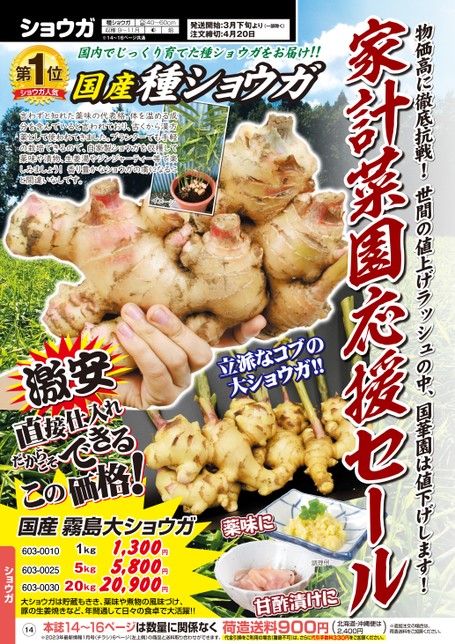 物価高に徹底抗戦!世間の値上げラッシュの中、国華園は値下げします!家計菜園応援セール14本誌14〜16ページは数量に関係なく※2023年最新情報1月号(チラシ)6ページ(左上側)の商品と送料取り合わせができます。荷造送料900円()北海道・沖縄便は2,400円代金引換をご利用の場合(離島不可)は、さらに代引手数料330円をご加算ください。※追加注文の場合は、荷造送料をご加算ください。国産霧島大ショウガ603-0010603-00251kg5kg1,300円5,800円20kg20,900円603-0030大ショウガは貯蔵もきき、薬味や煮物の風味づけ、豚の生姜焼きなど、年間通して日々の食卓で大活躍!!ショウガショウガ種ショウガ収穫9〜11月※14〜16ページ共通40〜60cm畑発送開始:3月下旬より注文締切:4月20日(一部除く)1第ショウガ人気位国内でじっくり育てた種ショウガをお届け!!国産種ショウガ言わずと知れた薬味の代表格。体を温める成分を含んでいると言われており、古くから漢方薬として使われてきました。プランターでも手軽の栽培できるので、自家製ショウガを収穫して薬味や漬物、生姜湯やジンジャーティー等で楽しみましょう!香り豊かなショウガの虜になること間違いなしです。イメージ激安激安激安激安立派なコブの立派なコブの大ショウガ!大ショウガ!!!薬味に薬味に調理例甘酢漬けに甘酢漬けに