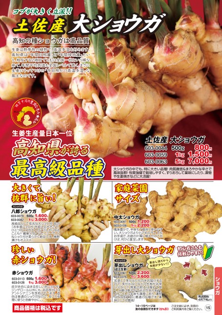 生姜生産量日本一位最高級品種土佐産大ショウガ603-0044603-0059603-0063500g1kg5kg800円1,500円7,000円大ショウガの中でも、特に大きい品種!肉質緻密&まろやかな辛さで風味抜群!性質強健で栽培しやすく、すりおろして薬味にしたり、漬物や生姜焼きなどに大活躍!中太ショウガ500g1,200円1kg2,200円603-0097603-0109風味豊かで、辛味も丁度良く使いやすい。大ショウガより小さめのサイズもお手頃で、お庭の片隅に植え付けておけば、何かと重宝します。芽出し大ショウガ初心者さんも心者さも挑戦しやすい!♪挑戦しやすい!♪ショウガ発送開始:4月下旬より大ショウガ芽出しショウガ芽出し済だから失敗が少ない!!500g2,200円1kg3,600円(近江生姜)603-0361603-0376加温して芽が出たものをお届けするので、芽が出ないなどの失敗が非常に少ない!!塊茎の肥大は極めて良く、外観は鮮やかで光沢があります。ピリッとした辛味も適度にあり、漬物などの加工用に最適の品種です。薬味としても最高!大ショウガ八郎ショウガ603-0078603-0082高級品として有名な大ショウガ!あの500g1,600円1kg3,000円「お多福ショウガ」を超える大きさで、ひとつのコブが大人のこぶし大になることも!!繊維少なくジューシーで、ひねショウガが柔らかく絶品です。梅酢漬けもオススメ。珍しい赤ショウガ!赤ショウガ500g1,600円1kg3,000円603-0113603-0128皮が赤色に染まる珍しい赤ショウガ!ジンゲロール以外にも、赤皮部分にはアントシアニンを含有しています。肉色は普通のショウガなので、皮ごと料理に使うと色鮮やかに。商品価格は税込です14〜15ページは友の会割引できます(5%引)ご注文前に必ず、別冊のご利用案内をご覧ください。大きくて抜群に旨い!家庭菜園サイズコブが大きく立派!!土佐産大ショウガ高知の種ショウガは高品質生姜は熱帯性の植物で、高温多湿を好みます。高知県は「年間日照量」と「年間降雨量」という、相反する2項目でともに全国一位という稀な県で、年間平均気温も全国レベルで高く、まさに生姜にうってつけの「多日照かつ高温多湿」な風土なのです。
