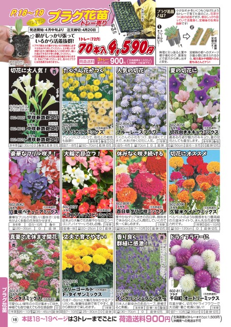 たくさん花がつく人気の切花夏の切花にイメージ花壇に直接定植OK!小さなポットをいくつもつなげたようなトレーで育てた苗のこと。花芽がつく前の幼苗ですが、根はしっかり回っていて活着良く、定植後の生育は抜群です!2トレーからそっと抜いて…1無理に引っ張ると葉や根が傷むので、割箸などで底穴から押し出すと安全。たくさん花がつく定植時の根へのダメージが最小限に抑えられるから、植え傷みや根腐れの心配もほとんどナシ!プラグ花苗とは?お届け見本28約cm54m約c根がしっかり張っているから活着抜群!※プラグ苗は土の量が少ないので定植前に必ず十分な水やりをしてください。土が乾いたまま取り出すと根を傷めることがあります。届いた苗はできるだけ早く定植してください。※花色無選別のため花色は偏る場合がありますが、予めご了承ください。また、各々のプラグには花色表示はありません。1トレー(72穴)70本入4,590j荷造送料3トレーまでごとに900円(北海道便は1,500円沖縄県への配達不可).P18〜19プレミアムプミムプラグ花苗プラグ花苗トレー売りトレー売り発送開始:4月中旬より注文締切:4月20日プラグイメージプラグの大きさ約3.5×3.×4.5cm[]切花に大人気!イメージ602-8058プラグ切花向きキキョウミックス(花色無選別)趣ある花姿が魅力のキキョウ。夏の切花としても重宝します。強6〜9月庭・鉢・切花50cm多年草602-8043プラグブルーレースフラワーたくさんの小花をつけ、茎は硬くて丈夫で、水あげ良く切花に人気。1年草庭・鉢5〜6月70cmイメージ602-8039プラグマトリカリアミックス(花色無選別)アレンジにぴったりで、他花との相性も抜群!!多年草強多年草130cm強庭・鉢・切花7〜8月50〜70cm庭・鉢・切花豪華なフリル咲き!大輪で目立つ!休みなく咲き続ける切花にオススメお盆やお彼岸の切花に最適!602-8005602-8010602-8024プラグ早咲新鉄砲ユリプラグ中咲新鉄砲ユリプラグ遅咲新鉄砲ユリ7月8月9月イメージ602-8096プラグ久留米ケイトウミックス(花色無選別)ベルベットのような質感をもつ最高級の久留米ケイトウ。まん丸な花姿が魅力的です。6〜10月1年草50〜120cm庭・鉢・切花イメージ602-8081プラグイメージ602-8077プラグ(花色無選別)ベゴニアトップスピンミックス従来より大輪で花色鮮やかな目立つベゴニア。バイヤーいちおし品種。春〜秋20〜25cm1年草庭・鉢(花色無選別)百日草ダリア咲ミックス華やかなダリア咲きの百日草。晩秋まで休みなくどんどん開花していくので長〜く楽しめます。1年草庭・鉢・切花イメージ602-8062プラグ八重咲ペチュニアミックス(花色無選別)豪華なフリルが可愛い八重咲き!分枝性がよく多数の花を咲かせます。多年草5〜10月20〜30cm中庭・鉢ドライフラワーにイメージ※暑さに弱いため、夏は涼しく乾燥気味に管理してください。90cm7〜10月香り良く群植に感激!602-8127プラグイングリッシュラベンダー602-8131プラグ千日紅オードリーミックス(花色無選別)日本人と馴染みのあるハーブ。群植すると素敵。強多年草春〜秋庭・鉢・切花30〜70cm荷造送料900円()花茎が硬く、切花やドライフラワーで大活躍!暑さ・乾燥に強い!!1年草7〜10月庭・鉢・切花北海道便は3トレーまでごとに1,500円沖縄県への発送は不可90cm真夏でも休まず開花丈夫で育てやすいイメージ602-8112プラグマリーゴールドF1タイザンミックス(花色無選別)花径7〜8cmと大輪花を咲かせるアフリカン系。耐暑性抜群で育てやすく、夏から晩秋まで楽しめます。25〜30cm1年草庭・鉢7〜10月イメージ602-8108プラグペンタスミックス(花色無選別)可愛らしい星形の小花が集まって咲き、単植でも寄せ植えでも存在感抜群!1年草35〜45cm5〜10月庭・鉢プラグ花苗18本誌18〜19ページは3トレーまでごとに