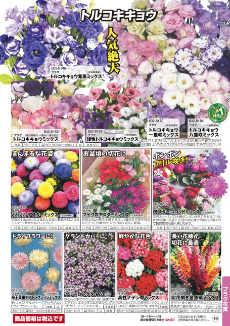 イメージトルコキキョウ人気絶大602-8146プラグトルコキキョウ紫系ミックス(花色無選別)プラグ602-8150トルコキキョウミックス(花色無選別、一重咲・八重咲混合)30〜40cm602-8165プラグ矮性トルコキキョウミックス(花色無選別)1年草7〜8月60〜80cm(一部除く)庭・鉢・切花まんまるな花姿お盆頃の切花に602-8170プラグ(花色無選別)トルコキキョウ一重咲ミックス602-8184プラグ(花色無選別)トルコキキョウ八重咲ミックス切花で人気のトルコキキョウですが、種から育てるのが少し難しいので、ぜひプラグから挑戦してみてください!!ポンポンフリル咲き!イメージアスターココットミックス(花色無選別)花径3cmほどの小輪ポンポン咲きで外弁はフリル状の可愛い花姿!!花冠の中心まで筒状花が開くので観賞期間も長く楽しめます。602-8215プラグイメージ(花色無選別)602-8200プラグマイクロアスターミックスイメージ(花色無選別)602-8199プラグポンポンアスターミックス花径約10cmにもなるまんまる大輪花を咲かせるアスター。華やかなアレンジに!!花径3.5cm程の小輪ですが、八重咲きで多花性なのでとっても華やか!花もち良く切花に最適。1年草7〜8月60〜70cm庭・鉢・切花1年草8〜9月50〜70cm庭・鉢・切花1年草7〜8月50〜70cm庭・鉢・切花ドライフラワーに!グランドカバーに鮮やかな花色長い花穂が切花に最適プラグ花苗イメージ602-8253プラグ切花向き金魚草ミックス(花色無選別)すらりと長く伸びた花穂はボリューム感満点!!茎が硬く丈夫。5〜7月庭・鉢・切花1年草60〜100cmイメージ602-8249プラグ高性ナデシコミックス(花色無選別)切花にもってこいの高性のナデシコ。ミックスなので、豊富な花色が楽しめます。多年草庭・鉢・切花4〜5月70cm強602-8234プラグクリーピングタイムほとんど手がかからない程、強健で育てやすい。ほふく性で広がるので、グランドカバーとしても大人気。5〜10月15cm多年草庭・鉢イメージ602-8220プラグ帝王貝細工アトラクションミックス(花色無選別)美しいパステルカラーで花もちがよくドライフラワーにも。1年草6〜7月60〜100cm庭・鉢・切花商品価格は税込です18〜19ページは友の会割引できます(5%引)ご注文前に必ず、別冊のご利用案内をご覧ください。19