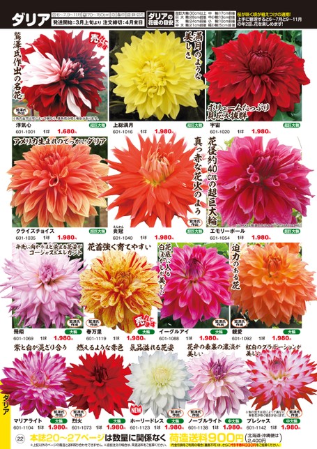 迫力のある花鷲澤氏作出0㎝の超巨大輪花径約4真っ赤な花火のよう大超巨大輪巨輪輪大中輪:30cm以上:28cm前後:24cm前後:21cm前後大中輪中小輪小輪極小輪17cm前後:13cm前後::10cm前後:5cm前後桜が咲く頃が植えつけの適期!上手に管理すると6〜7月と9〜11月の年2回、花を楽しめます!ボリュームたっぷり見応え抜群満月のような美しさ超巨大輪宇宙601-10201球1,980円超巨大輪ダリア発送開始:3月上旬より注文締切:4月末日6〜7、9〜11月70〜150cm庭・鉢・切花中ダリアの花径の目安※色の出方は花によって異なり、単色花が咲く場合があります。浮気心601-10011球1,680円超巨大輪上総満月601-1016アメリカ生まれのでっかいダリア1球1,980円鷲澤氏作出の名花鷲澤氏作出※こちらは鷲澤氏作出のダリアではありません。エモリーポール1球601-1054超巨大輪1,980円超巨大輪えんかん炎冠601-10401球1,980円鷲澤氏作出超巨大輪花底に入る白ぼかしが美しい花首強く育てやすいクライズチョイス601-10351球1,980円弁先に向かうほど染まる花姿がゴージャス&エレガント飛翔601-10691球鷲澤氏作出大輪1,980円鷲澤氏作出春万里601-1119大輪1,980円1球イーグルアイ601-1088紫と白が混ざり合う燃えるような赤色気品溢れる花姿鷲澤氏作出大輪1,980円1球花弁の表裏の濃淡が美しい親愛601-1092大輪1,980円1球紅白のグラデーションが美しいマリアライト1球601-1104鷲澤氏作出大輪1,980円鷲澤氏作出烈火601-1073大輪1球1,980円ホーリードレス601-11231球22本誌20〜27ページは数量に関係なく※上記以外のページの商品と送料取り合わせできません。※追加注文の場合は、荷造送料をご加算ください。鷲澤氏作出鷲澤氏作出大輪1,980円ノーブルライト601-11381球中大輪1,980円荷造送料900円※色の出方は花によって異なり、単色花が咲く場合があります。プレシャス601-11421球北海道・沖縄便は2,400円()鷲澤氏作出中大輪1,980円代金引換をご利用の場合(離島不可)は、さらに代引手数料330円をご加算ください。ダリア