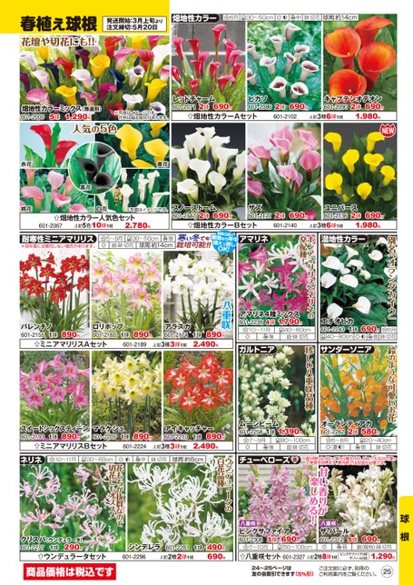 別名「オランダカイウ」鈴のような可愛いお花ホンアマリリスとネリネの交配種!珍しい八重咲品種庭・鉢・切花春植え球根花壇や切花にも!!発送開始:3月上旬より注文締切:5月20日畑地性カラー6月30〜50cm中鉢・切花球周:約14cm畑地性カラーミックス(無選別)601-20001,290円5球人気の5色レッドチャーム601-20712球690円ピカソ601-2086※写真はイメージです。花色は偏る場合があります。畑地性カラーAセット赤花桃花黄花黒花白花※写真はイメージです。畑地性カラー人気色セット上記5色10球1組2,780円601-2067スノーストーム601-21172球690円ザズ601-2121畑地性カラーBセット耐寒性ミニアマリリス※初年度には開花しない場合があります。5〜9月庭・鉢・切花30〜50cm強球周:約14cm寒い冬でも栽培可能!!関東以西の暖地なら年中植えっ放しOK!アマリネ690円2球601-2102690円2球601-2140キャプテンオデオン690円601-20901,980円2球上記3種6球1組ユニバース601-21362球690円1,980円上記3種6球1組湿地性カラーアマリネ4種ミックス,790円601-22394球110〜11月40〜60cm強ガルトニアエチオピカ601-22431球40〜80cm690円弱6月鉢・切花サンダーソニア球根チューベローズ※霜が降りなくなってから植え付け、ビニールなどで覆って発芽を促します。寒冷地では加温が必要です。甘い香りが楽しめる!八重咲ピンクサファイア601-23083球690円7〜10月50〜100cm八重咲ザ・パール601-23125球690円弱庭(暖地)鉢・切花八重咲セット601-2327上記2種8球1組()ピンクサファイア3球ザ・パール5球1,290円ムーンビーム601-22581球7〜9月1,390円80〜100cm庭・鉢・切花強オーランティアカ601-22622球580円6〜8月(夏)20〜40cm鉢・切花弱八重咲890円1球2,490円アラスカ601-2174上記3種3球1組アイキャッチャー601-2210上記3種3球1組1球2,490円890円バレンチノ601-21551球890円ロリポップ601-2160ミニアマリリスAセット890円1球601-2189スイートシックスティーン601-2193890円1球マラケシュ601-2205ミニアマリリスBセット890円1球601-2224ウンデュラータの白花品種!10〜11月30〜60cm中鉢・切花球周:約8cm花もちが抜群なので切花にもオススメネリネクリスパ(ウンデュラータ)290円601-22771球ウンデュラータセットシンデレラ601-2281601-2296上記2種2球1組1球490円690円商品価格は税込です24〜25ページは友の会割引できます(5%引)ご注文前に必ず、別冊のご利用案内をご覧ください。25