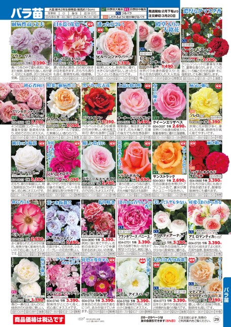 病気に強い女王の輝きバラ苗大苗:接木2年生根巻苗(樹高約15cm)落葉樹四季咲:春〜秋に開花庭・鉢・切花強返り咲:春と秋に開花四季咲大輪系四季咲中輪系つるバラしだれるように枝が伸びるバラ発送開始:2月下旬より注文締切:3月20日濃厚なダマスク香Ckeisei殿堂入りの大銘花耐病性高く丈夫目を惹く花色迷ったらコレ!返り咲ピエールドゥロンサール604-0530世界バラ会連合殿堂入り!花形と花色が調和した大人気品種。微香1,490円10〜12cm1株3m四季咲ルージュピエールドゥロンサール※(登録名:MEIDRASON)1株3,390円604-0544クリムゾンレッドの豪華な大輪で、濃厚な香りがします。1つの茎に1〜5輪と花付き抜群!冬に強剪定しても春に開花します。強香.8〜2m10cm1Ckeisei※メルヘンツァウバー(登録名:KORMARZAU)1株3,390円604-0525結実しにくく、耐病性に優れ、大きくなり過ぎない。迷ったらコレ!という逸品バラです。8〜10cm1〜1.2m中香1株2,490円モーリスユトリロ604-0510濃い赤色と黄色、白の絞り咲きが目を惹きます。花もちも香りも良く、耐病性も高い強健種。中香0.9〜1.2m8〜10cmCkeiseiノヴァーリス(登録名:KORFRIEDHAR)1株3,390円604-0506青バラ系の中で最も病気に強く、また樹勢、耐寒性も強い。枝が硬く、切花にも抜群。2013年ADR受賞。中香1.5m9cm初心者向け照葉で耐病性◎黒バラの代表花上品な抱え咲Ckeisei※ソレロ四季咲(登録名:KORGELEFLO)1株3,390円604-0609非常に花弁数が多く、凛とした印象。耐病性が高く育てやすいです。.5m7〜8cm中香1雨に強い四季咲レッドレオナルドダビンチ1株3,390円604-0666花もちが良く雨にも負けず咲き続けます。耐寒性・耐病性にも優れます。8〜9cm1.5m微香Ckeiseiユニークな色合いクイーンエリザベス1株2,690円604-0597世界バラ会連合殿堂入り。耐暑・耐寒性に優れた強健種。10〜11cm1.5〜1.8m微香サンストラック1株2,690円604-0651花色は黄金色を帯びたアプリコット色で、裏弁が黄色とユニークな色合い。中香12〜13cm1〜1.2mオーナードゥバルザック1株2,490円604-0582樹勢強く、株はまっすぐ伸びます。花も大輪で、花壇の後方でも存在感抜群!!中香1.5〜2m13cm花姿も香りも良しパパメイアン1株3,390円604-0578ベルベットのような質感の花弁が美しい剣弁高芯咲花!香りも抜群!!強香1.5m13〜15cm優しい色合いスヴニールドゥボイス1株2,490円604-0632樹勢強く、枝の伸びが良いので切花にもオススメです。ドゥフトボルケ604-06471株2,690円「香りの雲」という名の通り、フルーティーな香りがします。花も大輪で見応えも抜群!!CkeiseiG.D.ルイーズ(品種登録出願中:KORBROCAZE)1株3,390円604-0563数々のコンクールで受賞した素晴らしい香りのバラ。強香1.2m9cm※(登録名:MEIDYSOUK)プリンセスシャルレーヌドゥモナコ1株3,390円604-05594つの国際コンクールで芳香賞を受賞!耐病性があり、初めての方にオススメ。11cm1.6m強香Ckeisei花と香りが奏でるメロディー純白の大輪花Ckeiseiジョリーメロディー(品種登録出願予定)1株3,390円604-0628濃いマゼンタ色で華やかな印象の大輪花。ベリー系を含む濃厚な香りが特長です。Ckeiseiビブ・ラ・マリエ!(登録名:MEICALANQ)※1株3,390円604-0613花もち、香りが素晴らしく、特に耐病性はピカイチ!!樹勢も強く、初心者にオススメです。強香12〜14cm1.6m美しくてトゲも少ない可愛くほのかに香る絞り咲きほのかな青りんごの香りCkeisei初心者にも花つき抜群!!9〜12cm1〜1.2m強香10〜11cm1〜1.2m中香10〜13cm1.2m強香Ckeisei1株3,390円604-0716カップ咲きの淡桃花。トゲが少なく耐病性に優れる。8cm1.8〜2m強香1株3,390円604-0720枝元から枝先までよく咲き、花持ち抜群。耐病性が高い。7〜8cm2m中香※栽培条件によっては単色花が咲く場合がございます。アミロマンティカ(登録名:MEISSELPIER)※Ckeisei※クリスティアーナ※(登録名:KORGEOWIM)クリームのようCkeiseiCkeisei見た目も香りも抜群!暑さに強いCkeisei1株ベティブープ2,690円604-0670赤く縁取られた花弁が印象的。樹勢が強く耐病性も高いので初心者にもオススメです。中香10cm1m1株ノーブルシャイン3,490円604-0685花数が多く、切花向き。シルバーグレーの花色が美しい。微香0.6〜0.8m4cmトイトイトイ!(登録名:KORAMSARO)1株3,390円604-0690病気に強く育てやすい。名前の由来はドイツで幸運を祈るおまじないの言葉。微香7〜8cm1.6m(登録名:MEITERATOL)フランボワーズバニーユ1株3,390円604-0701花もち抜群で株元〜枝先まで開花!!トゲ少なく、病気に強い。9〜11cm2.5〜3m微香※返り咲Ckeiseiグラデーションがかわいらしい花色が変化するCkeisei病気に強いCkeiseiバラ苗(品種登録出願予定)四季咲返り咲ライムライトグランディローサ3,390円604-0773目を引く鮮やかな黄色の花と特徴的な香りが魅力です。1株(品種登録出願予定)マティアスクラウディウスローズ3,390円604-0788優しい香りと色味が特長。耐病性も高いです。1株8〜10cm2m強香6〜9cm2m中香(品種登録出願予定)ベビーアイスバーグ3,390円604-0769耐暑性・耐病性が高く、株が小さく鉢植えにオススメ。微香0.7〜0.8m5〜7cm1株Ckeiseiブラッシングノックアウト※(登録名:ラドヨド)サングリアナイト(品種登録出願中:SPROSUL)1株3,390円604-0740耐病性がとにかく高く、初心