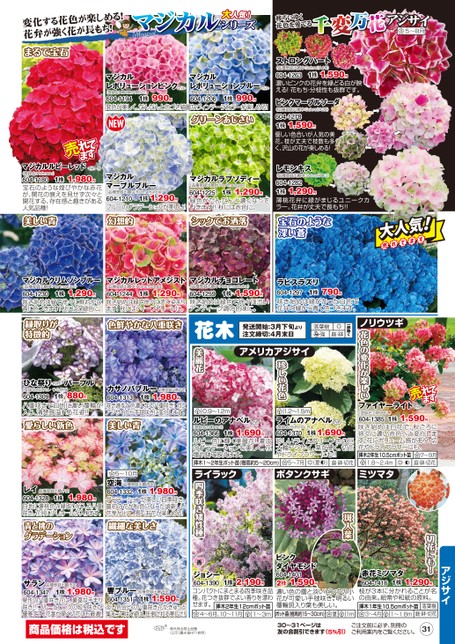 変化する花色が楽しめる!花弁が強く花が長もち!まるで宝石マジカルMagical大人気!シリーズ移ろいゆく花色を愛でる千変万アジサイ5〜8月マジカルレボリューションピンク(登録名:HOKOMAREVO)マジカルレボリューションブルー(登録名:HOKOMAREVO)604-1194発色が美しく、だんだんと色づき綺麗なヴィンテージカラーが楽しめる!604-12061株1株990円990円ストロングハート(品種登録出願中:SchrollA10)1株1,590円604-1263濃いピンクの花弁を縁どる白が映える!花もち・分枝性も抜群です。ピンクマーブルソーダ(品種登録出願中:SchrollA20)ファイヤーライト(登録名:SMHPFL)1株1,590円604-1385咲き始めは白花で、秋ごろに徐々に濃い赤色へと変化します。花にボリューム感があり、切花やドライフラワーにも。挿木2年生10.5cmポット苗7〜9月庭・鉢・切花1.8〜2.4mミツマタノリウツギ花色の変化が楽しいアジサイ切花にも!赤花ミツマタ1株604-14161,290円枝が3本に分かれることが名の由来。紙幣や和紙の原料。落葉樹挿木1年生10.5cmポット苗庭・鉢・切花1〜1.8m3〜4月一部除く落葉樹強庭・鉢花木発送開始:3月下旬より注文締切:4月末日色鮮やかな八重咲き縁取りが特徴的ルビーのアナベル(登録名:NCHA3)ライムのアナベル1株1,690円604-1366ルビー色に輝く美麗花!濃淡のグラデーションも美しく、花壇や鉢で映えます。挿木1〜2年生ポット苗(樹高約5〜20cm)(登録名:SMNHALR)1株1,690円604-1370珍しいライムグリーン色の巨大輪アジサイ。茎が硬く、切花やドライフラワーにも!!5〜7月(夏)庭・鉢・切花珍しい花色アメリカアジサイ美麗花ひな祭りパープル※(登録名:加茂セレひな祭り)880円1株604-1309八重咲きで白地に濃い覆輪が入り、清楚感溢れる花姿!!愛らしい新色1株1,980円カサノバブルー品種登録出願予定604-1313咲き進むと色濃くなる八重咲き!ガクアジサイから手毬咲きに変化します。美しい青斑入葉ライラックボタンクサギ四季咲き矮性種5〜10月1株1,980円空海品種登録出願予定604-1332グラデーションが美しい四季咲き。最初の花が秋色になった頃新しい花芽が出て、長くお花が楽しめる!繊細な美しさ1株1,980円レイ品種登録出願予定604-1328白地に濃桃色の縁取りが入る八重咲き。花弁に少しカールが入ります。青と桃のグラデーション1株1,980円サラン品種登録出願予定604-1347星形の八重咲き花は、豪華な手まり咲き!!ブルーとピンクの絞り咲きが優雅です。花茎が硬く切花にも最適!響ブルー品種登録出願予定604-1351淡い色合いの八重咲き花がぎゅっと集まって咲く姿は、圧倒される美しさ!1株1,590円1株ジョシー604-1390コンパクトにまとまる四季咲き品種。花つき抜群でよい香りを漂わせます。2,190円挿木2年生12cmポット苗1〜3m4〜6月、10〜11月1,590円ピンクダイヤモンド604-14012株濃い色の蕾と淡いピンクの小花が可愛い手毬咲き。明るい覆輪斑入り葉も美しい。ポット苗(樹高約15〜30cm)夏1m商品価格は税込ですPVP※…海外持出禁止品種(公示(農水省HP)参照)30〜31ページは友の会割引できます(5%引)ご注文前に必ず、別冊のご利用案内をご覧ください。31グリーンあじさい(品種登録出願中:Hortmarhaso)マジカルラプソディー1,290円604-1225緑色がだんだんと濃くなっていきます!!秋には赤色に。1株マジカルマーブルブルー(品種登録出願中:Kolmamarble)604-1210ブルーのグラデーションが美しい!1株1,290円幻想的シックでお洒落マジカルレッドアメジスト(品種登録出願中:Hokomareda)1株604-1244咲き始めは緑で徐々に赤く染まります!秋にはディープグリーンに。1,290円マジカルチョコレート(品種登録出願中:Hokomachoko)1株1,590円604-1259咲き始めは緑色で徐々に渋いアンティーク調の色味に。604-12781株1,590円優しい色合いが人気の美花。枝が丈夫で枝数も多く、沢山の花が楽しめる!レモンキス(品種登録出願中:SchrollA13)604-12821株1,290円薄桃花弁に緑がまじるユニークカラー。花弁が丈夫で長もち!!宝石のような深い蒼ラピスラズリ1株604-1297咲き始めは緑がかった白色で花弁の縁から青く色づきます。790円マジカルルビーレッド(登録名:Kolmaru)1株1,980円604-1180宝石のような煌びやかな赤花が、開花の衰えを見せず次々と開花する、存在感と趣きがある人気品種!美しい青マジカルクリムゾンブルー(品種登録出願中:Hortmagicri)1株1,290円604-1230咲き始めは緑で徐々に鮮やかな青に色づきます!秋には深緑色に。