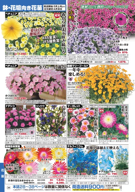 粋な小町602-03082株870円PОINT花付き抜群まとまりの良い草姿変わり咲きペチュニア小町シリーズ春から秋まで咲き続ける夏は白の覆輪花に!ASS金賞!JFS優秀賞!鉢・花壇向き花苗発送開始:3月上旬より注文締切:4月末日ペチュニアポット苗春〜秋多年草20〜30cm庭・鉢・吊鉢中(0℃)地植えで圧倒的パフォーマンス!!ビーズニーズ品種登録出願中(出願名:Balcobees)海外持出禁止品種(公示(農水省HP)参照)1,090円2株602-0210鮮やかで濃イエローの花色が、お庭で映えとても綺麗。多花性で耐暑性にも優れているので、春から秋まで連続して花が咲き続けます!AAS(オールアメリカセレクション)金賞・JFS(ジャパンフラワーセレクション)優秀賞を受賞した珠玉のペチュニア。この機会に是非、あなたのお庭で咲かせてください。ペチュニアボリューム満点藤色小町870円変わり咲きペチュニア「小町シリーズ」。花付き抜群で、密集して咲く姿は圧倒的!まとまりの良い草姿に、個性的な花色が映えます。1株でとっても広がるので、地植えに最適です。もちろん鉢植えでも満足いくボリューム感をお楽しみいただけます♪1,670円ペチュニア小町セット上記2種4株1組602-0312602-03272株花火のような花形!多花性!花期が長い!2株980円ローリーズマシュマロ602-0370コンパクトにまとまる草姿に、花つき抜群でボリューム満点で見栄え最高!花期が長い大満足マーガレット。デルフィニウムパープルスプラッシュ602-0384花火のように美しい、高性変わり咲きマーガレット。980円2株花壇や鉢植えで映える宿根マリーゴールド一年中楽しめる!ゴールドメダル(登録名:09TAG1002)3株1,290円602-03461年中咲き続けるマリーゴールド!夏を除けば花数も多く、濃厚なシトラスミントの香りが♪毎日の切花にも使える毎年大好評の品種です。周年50〜80cm強(-3℃)庭・鉢・切花マーガレット春〜秋20〜30cm強庭・鉢大人気!1,290円さくらさくら3株602-0331ほふく性で分枝よく、乱れることなく咲き誇ります。病害虫に強く、雨や高温にも強いので育てやすい!多数の受賞歴を持つ優秀品種。ナデシコリンドウトパーズガーネットペリドットイメージリンドウ3色セット602-0365紫・白・桃の3色セット。可愛い花が3色揃うととってもきれいです。8〜11月庭・鉢・切花強1,640円40〜60cm3株3〜11月5〜10cm強庭・鉢スウィートティアラ品種登録出願予定2株1,050円602-0350濃いピンク色の愛らしい丸弁バラ咲きナデシコ。強健で育てやすく、甘い香りも魅力です。春〜秋10〜15cm強庭・鉢耐寒性松葉菊株いっぱいに広がる!!多年草チアブルー2株602-0415鮮やかな青色が目を惹きます。上向き咲きの花がまとまって咲くので見栄えも抜群です!!790円2株チアライトブルー602-0420涼し気で柔らかな雰囲気と色合い、そして花姿が美しい。上向きに咲くので、花壇や鉢植えにオススメ。790円中庭・鉢・切花(一部除く)荷造送料900円()北海道・沖縄便は1,500円代金引換をご利用の場合(離島不可)は、さらに代引手数料330円をご加算ください。4〜6月60〜70cm多年草砂漠の宝石おまかせセット(無選別・名称付き)602-0399602-04004株12株1,640円4,390円34本誌28〜38ページは数量に関係なく※上記以外のページの商品と送料取り合わせできません。※追加注文の場合は、荷造送料をご加算ください。ローズクォーツルビー横に広がる草姿で開花時期が長い!急激に広がらないので土の浅い場所やロックガーデンに最適!6品種の中からおまかせでお届けします。※花色は偏る場合があります。ムーンストーン花苗四季咲き性乾燥に強い