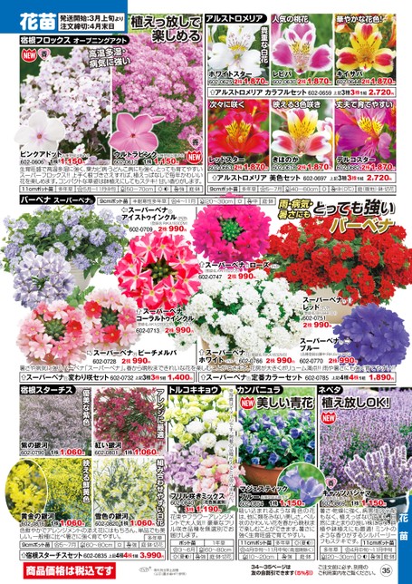 1,400円トルコキキョウスーパーベナ定番カラーセット602-0785上記4種4株1組1,890円アルストロメリアカラフルセット602-0659上記3種3株1組次々に咲く映える3色咲きキイサバ602-06442株1,870円2,720円丈夫で育てやすい貴重な白花ホワイトスター602-06252株1,870円レビバ602-06302株1,870円アルストロメリア人気の桃花華やかな花色!花苗発送開始:3月上旬より注文締切:4月末日宿根フロックスオープニングアクト高温多湿・病気に強い植えっ放しで楽しめる品種登録出願予定1株1,150円ピンクアドット602-0606生育旺盛で高温多湿に強く、葉カビ病・うどんこ病にも強く、とっても育てやすいスーパーフロックス!!上手く根づきさえすれば、植えっぱなしで毎年かわいい花を楽しめます。コンパクトな草姿は鉢植えにしてもステキ!甘い香りがします。11cmポット苗ウルトラピンク602-06101株1,150円5月〜11月中旬50〜70cm品種登録出願予定多年草庭・鉢強レッドスター602-06632株1,870円きほのか602-06782株1,870円デルコスター602-06822株1,870円アルストロメリア美色セット602-0697上記3種3株1組2,720円9cmポット苗多年草5〜7月40〜60cm中(0℃)庭(暖地)・鉢・切花バーベナスーパーベナR9cmポット苗半耐寒性多年草4〜11月20〜30cm中庭・鉢スーパーベナアイストゥインクルR602-0709(登録名:RIKA18302M)2株990円スーパーベナローズR(登録名:AKIV82205)602-07472株990円スーパーベナコーラルトゥインクル2株990円602-0713(登録名:AKIV28902M)R雨・病気・暑さにもとっても強いバーベナRスーパーベナレッド602-07512株990円(登録名:RIKA44101)暑さや病気に強いバーベナ「スーパーベナ」。春から晩秋まできれいな花を楽しむことができます。花房が大きくボリューム満点!!雨や暑さにも強く育てやすい!!スーパーベナピーチメルバ602-07282株990円Rスーパーベナホワイト602-0766R(登録名:RIKA1832M3)(品種登録出願中:RIKAV50003)2株990円602-07702株990円スーパーベナブルーRスーパーベナ変わり咲セット602-0732上記3種3株1組アレンジに最適優美な紫色宿根スターチス紫の銀河602-07901株1,060円紅い銀河602-08011株1,060円黄金の銀河602-0816色鮮やかでアレンジメントの添え花にはもちろん、単品でも美しい。一般種に比べ暑さに強く育てやすい。雪色の銀河602-08201株1,060円1株1,060円9cmポット苗5〜7月60〜80cm強宿根スターチスセット商品価格は税込です602-0835上記4種4株1組カンパニュラ美しい青花ネペタ植え放しOK!花苗品種登録出願予定1株1,150円キャッツパジャマ602-0869暑さ・乾燥に強く、病害虫の心配もなく、植えっぱなしでOK。自然にまとまりの良い株になり、群植や鉢植えにも最適!ミントのような香りがするシルバーリーフもステキです。多年草20〜30cm4月中旬〜11月中旬庭・鉢強品種登録出願予定1株1,150円マジェスティックブルー602-0854吸い込まれるような青色の花は、他に類をみない美しさ。ベル状のかわいい花を春から晩秋まで楽しむことができます。暑さに強く生育旺盛で育てやすい。11cmポット苗(夏)4月中旬〜11月中旬(高温期除く)多年草10〜20cm強庭・鉢※写真はイメージです。掲載の品種が入るとは限りません。フリル咲きミックス602-0840(花色無選別)3株1,190円花束やフラワーアレンジメントで大人気!!豪華なフリル咲き品種を無選別でお届けします。ポット苗3〜6月(夏)1年草60〜80cm庭・鉢・切花強組み合わせやすい白花多年草庭・鉢・切花3,990円映える鮮黄色PVP※…海外持出禁止品種(公示(農水省HP)参照)34〜35ページは友の会割引できます(5%引)ご注文前に必ず、別冊のご利用案内をご覧ください。35