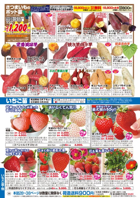 3株6株(登録名:新白鳥4号)夏っちゃん603-7056603-7060四季なりイチゴ最大級の最大50g!最高糖度14度にもなる甘さ!10℃以上に保てば冬も結実します。よく実をつけ、無駄な小粒をつけにくい点も嬉しい。3,000円5,600円四季なり花も実も楽しい♬※果実の種子部分は通常白もしくは淡いピンク色ですが、栽培状況により異なります。※許可なく収穫した実を販売すること、苗の増殖をすることは禁止されております。荷造送料800円(北海道・沖縄便は2,400円)の場合8,800円未満税込の場合(北海道・沖縄便は1,600円)荷造送料無料8,800円以上税込さつまいものポット苗及び2023年最新情報1月号(チラシ)1・3・4ページと2ページ右側の野菜苗とのご注文金額が※上記ページの商品以外とは送料取り合わせできません。ポット苗のおすすめポイント!・イモヅルで販売のない珍品種も!・少しずつイモヅルを収穫し、少しずつ定植でき、自分のペースで作業ができる!極甘紫いもシルクのようになめらか食通も唸る絶品いも※登録品種(登録名:HE306)昨年人気NO.2シルクスイートポット苗603-65132株舌触りはシルクのように滑らかで甘さたっぷり!紡錘形で揃いよく、貯蔵性も抜群!※昨年人気NO.3べにはるかポット苗603-65282株甘味強く風味良く、貯蔵性に優れ、貯蔵すると、蒸し・焼芋にしても絶品の甘さ!※603-65322株ふくむらさきポット苗糖度が高く「べにはるか」と同等に甘い、濃い紫色のさつまいも。とても美味。最高糖度19度以上ポット苗限定昨年人気NO.1フルーツこがねポット苗603-65092株糖度は一般的なさつまいもの約2.5倍の19.87度を記録したほど甘い!!※メリクロン苗ではありません。さつまいものポット苗苗イメージ※親株ポット苗でお届け発送開始:4月中旬より注文締切:4月20日どれでもポット苗1株からイモヅルおよそ10〜20本採れますメリクロン苗でお届けします(一部除く)1,200円1,200円2株※「メリクロン苗」とは生長点を無菌培養して育成された苗のことです。定番美味芋焼き芋向き芋ポット苗限定健康志向芋安納芋ポット苗603-65472株じっくり焼芋にすると、蜜が溢れ出し美味しい!甘さと食感で大人気!※パープルスイートロードポット苗603-65512株甘くて美味しい紫芋。※栽培環境・天候条件により肉色にむらが出ることがあります。※ハロウィンスウィートポット苗2株β‐カロテンを高含有!滑らかな舌触りでとても美味しい!603-6585※クイックスイートポット苗603-65902株短時間の加熱で甘くなるのが特長で、レンジ調理10分で焼芋級の甘さ!!鹿屋パープルポット苗603-66012株甘味が強く、粘質で美味。アントシアニン、ビタミンC・E等豊富。※(登録名:すいおう)ヘルシー菜ポット苗603-66732株栄養満点のツルが美味と人気!もちろん芋も食べられます。ふかし芋向き芋懐かし芋ポット苗限定ポット苗限定ベニアズマポット苗603-65662株肉質は粉質でホクホク旨い。甘味たっぷりの早生品種。金時(高系14号選抜)ポット苗603-65702株栽培しやすく甘味が強い。絶品焼芋の他、きんとんにも最適。※アヤコマチポット苗603-66202株オレンジ色の果肉で彩り良好!色ムラ、変色が比較的少なく、サラダに最適!ポット苗太白ポット苗603-66402株昭和30年頃まで主流。甘さ控えめでしっとり優しい味わい。冷めても美味。限定隼人いもポット苗603-66542株人参芋と呼ばれる橙色の果肉は、甘くβカロテンたっぷり!干し芋にも。シモン1号ポット苗603-66882株ビタミンK、葉酸等が多く含まれます。葉茎部は苦味少なく食べやすい。いちご苗発送開始:3月下旬より注文締切:3月20日ポット苗多年草15〜30cm5〜6月(四季なり:5〜11月)強●お届けする苗は親株になります。今春に果実の収穫はできませんが、親株1株から10〜20株もの子株がとれるので、これを秋に実取り用の苗として定植します。翌春には美味しいイチゴが楽しめる予定です。従来のイチゴとは違った香りと風味おいしくて人気!!四季なりイチゴ最大級の50g!!とうくん※3株2,200円6株4,000円桃薫603-7003603-7018桃のように甘く芳醇な香りと風味の高級品種!最大約45gと大粒で、果実の揃い抜群、豊産性と文句なし!他のイチゴとは全く違う存在感を放ちます。スペシャルイチゴセット天使のいちごAE※3株2,200円6株4,000円(登録名:ももいろほっぺ8号)603-7022603-7037ほんのりピンク色を帯びる白イチゴ。甘味と酸味のバランスが良く美味!プランター栽培可能で、うどんこ病等にもかかりにくく、初心者の方でも育てやすい!603-7041四季なり上記2種6株1組4,000円夏から秋にかけて収穫できる!芯まで赤い美形大果38〜39ページは友の会割引できます(5%引)ご注文前に必ず、別冊のご利用案内をご覧ください。(一部除く)荷造送料900円()北海道・沖縄便は1,500円代金引換をご利用の場合(離島不可)は、さらに代引手数料330円をご加算ください。38本誌28〜38ページは数量に関係なく※上記以外のページの商品と送料取り合わせできません。※追加注文の場合は、荷造送料をご加算ください。3株6株四季なりトスカーナ603-7125603-7130真っ赤な甘酸っぱい果実と、珍しい濃いピンク色の花が同時に楽