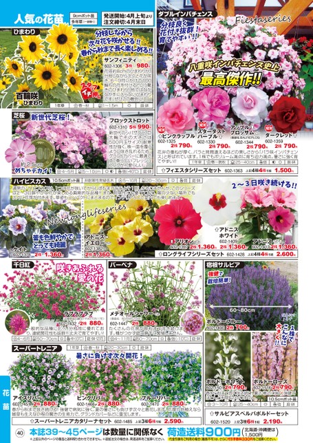 人気の花苗9cmポット苗多年草(一部除く)発送開始:4月上旬より注文締切:4月末日ひまわりダブルインパチェンス分枝良く花付き抜群!育てやすい!!F�esta����e�3株980円サンフィニティ602-1306花径約8cmのひまわりが、分枝しながら次々と花が咲き、6〜9月にかけて100輪もの花を付けるという驚きのひまわり!他ではなかなか手に入らないひまわりです。ぜひこの機会に!1年草春〜秋1〜1.5m庭・鉢百輪咲ひまわり芝桜新世代芝桜!5株フロックストロット990円602-1310新世代のシバザクラ。巨大輪でその大きさは500円玉サイズ!耐寒性が強く、株一面を覆うように咲き乱れるため、グランドカバーに最適です。春らしいフレッシュピンクが可愛らしい。ピンクラッフル602-1325スターダストパープル602-13302株アップルブロッサム(登録名:BALFIEPLOS)602-13442株ダークレッド602-13592株2株790円790円花弁の重ねが厚く、バラと見間違えるほどの美しさから「バラ咲インパチェンス」と呼ばれています。1株でもボリューム満点に育ち迫力満点。暑さに強く育てやすい!!790円790円25〜40cm春〜晩秋1年草庭・鉢弱フィエスタシリーズセット602-1363上記4種4株1組1,500円約2.5cm4〜5月5〜10cmめちゃデカイ!!ハイビスカス通常のハイビスカスは、1つの花が咲いてからしぼむまでおおよそ1日しかありませんが、このシリーズは2〜3日鮮やかな花が楽しめる画期的な品種!!また、耐陰性にも優れており、陽の少ない場所でも次々に花芽が付きます。草姿もコンパクトにまとまるのでインテリアとして室内でも楽しめます。非耐寒性常緑低木10.5cmポット苗20〜30cm強(-40℃)5〜10月庭・鉢弱庭・鉢�e����e�i��n�l��N蕾も色鮮やかでとっても綺麗1,360円2株アドニスイエロー602-13822株1,360円咲きあふれる愛の花バーベナケイト602-1378千日紅植え付け1年で1株でこんなに大きく!!宿根サルビア強健で栽培簡単!60〜80cmボルドーブルー602-14902株790円2株ボルドーローズ602-1516ボルドーホワイト790円790円602-1501春から秋まで長く咲き続け、暑さ・寒さに強く、強健でほとんど手間もかかりません。10.5cmポット苗25〜40cm庭・鉢3〜10月2株強サルビアスペルバボルドーセットアリオン602-13972株1,360円ロングライフシリーズセットアドニスホワイト602-14092株1,360円602-1428アドニス602-14132株上記4種4株1組1,360円2,600円スーパートレニアカタリーナセット602-1485上記3種6株1組2,590円40本誌39〜45ページは数量に関係なく※上記以外のページの商品と送料取り合わせできません。※追加注文の場合は、荷造送料をご加算ください。602-1520荷造送料900円上記3種6株1組2,190円()北海道・沖縄便は1,500円代金引換をご利用の場合(離島不可)は、さらに代引手数料330円をご加算ください。ラブラブラブメテオールシャワー(品種登録出願中:PAST0517E)(登録名:INVEBPUTOW)602-1432880円一般的な品種に比べ、分枝性に優れており、連続開花性も抜群!!丈夫で育てやすい!庭・鉢・切花50〜70cm中(0℃)2株4〜6月2株602-1447たくさんの花房が晩秋まで咲き続けます。種がつかず庭で勝手に繁殖しません。880円4〜11月50〜70cm強(-10℃)庭・鉢アイスリバー2株602-1451春から秋まで咲き続ける!強健で病気に強く、夏の暑さにも負けず次々と着花します。花壇や地植えなら雑草も生えない程の驚きの生育力で、グランドカバーなどに重宝します。ブルーリバー2株602-1470ピンクリバー2株602-1466880円880円880円花苗スーパートレニア1年草春〜秋20〜30cm庭・鉢暑さに負けず次々開花!