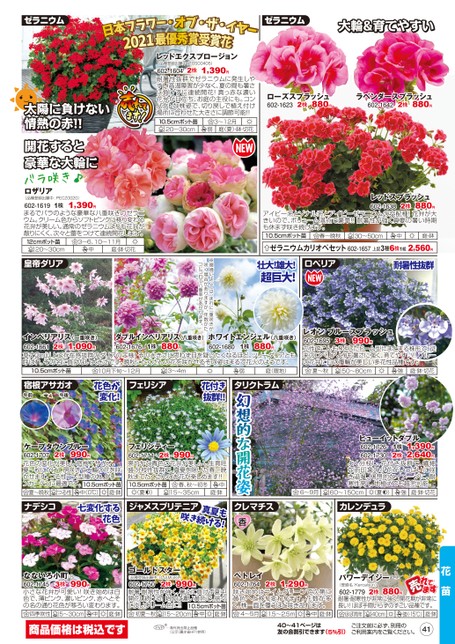 ローズスプラッシュ880円602-16232株ラベンダースプラッシュ880円602-16422株レッドスプラッシュ602-1638880円アイビー系とゾナル系とアイビーゼラニウムの交配種!花弁が大きいので、ボリューム満点で豪華!!耐暑性が強く真夏の暑い時期も休まず咲き続けます。10.5cmポット苗30〜50cm春〜晩秋2株庭・鉢中ゼラニウムカリオペセット602-1657上記3種6株1組2,560円ロベリア壮大!雄大!超巨大!耐暑性抜群レッドエクスプロージョン(品種登録出願中:TOSC0405)2株1,390円602-1604耐暑性抜群でゼラニウムに発生しやすい高温障害が少なく、夏の間も暑さに負けずに連続開花!真っ赤な濃い花弁が目立ち、お庭の主役にも。コンパクトな株姿で、切り戻しで植え付け場所に合わせた大きさに調節可能!!10.5cmポット苗3〜12月20〜30cm弱庭(夏)・鉢・切花太陽に負けない情熱の赤!!※環境によっては、まれに一重咲きが咲く場合がありますが、年数がたつにつれて八重率があがります。皇帝ダリア開花すると豪華な大輪にバラ咲き♪ラき♪ロザリア(品種登録出願中:PECZ0020)1株1,390円602-1619まるでバラのような豪華な八重咲きのゼラニウム。クリーム色からソフトピンクに移り変わる花弁が美しい。通常のゼラニウムよりも花弁が散りにくく、次々と蕾をつけて連続開花します。12cmポット苗3〜6、10〜11月20〜30cm中庭・鉢・切花インペリアリス(一重咲き)602-1661草丈3m以上で存在感抜群のダリアの王様!その大きさに思わず目を疑いたくなるほど。ツリーダリアとも呼ばれ、その名に負けない大きさです。晩秋にたくさんの花を咲かせるその姿はまるで花火のようです。ダブルインペリアリス(八重咲き)602-1676ホワイトエンジェル(八重咲き)602-16801,090円880円880円2株1株1株レオンブルースプラッシュ602-1695立性でこんもりとしたドーム型にまとまる株形で、従来のロベリアよりも暑さに強く、育てやすい!!ブルーの花弁に白の覆輪が美しい多花性品種です。990円3株10.5cmポット苗10月下旬〜12月3〜4m弱庭(暖地)夏〜秋50〜80cm強庭・鉢・切花宿根アサガオ午前午後フェリシア花色が変化!タリクトラム花付き抜群!!2株ケープタウンブルー990円602-1707花色の変化が美しい宿根アサガオ。夏〜秋にかけて房咲きで大輪の花を咲かせます。つる性で大型種の為、グリーンカーテンに最適です。10.cmポット苗中(0℃)庭・鉢夏〜晩秋つる性2株990円フェリシティー602-1711爽やかな青色の花弁が美しい。生育旺盛・分枝性抜群で、真夏を除いた春〜晩秋までたくさんのお花が楽しめます!!10.5cmポット苗中庭・鉢春、秋〜初冬15〜35cm(夏)6〜9月1株2株ヒューイットダブル602-1726602-17301,390円2,640円よく分枝し、花付き抜群で、繊細な雨印象の小花がいっぱいに咲き溢れ、幻想的なイメージに。耐寒性高く、地植えでも越冬可能。庭・鉢・切花(夏)強60〜150cmナデシコ七変化する花色ジャメスブリテニア真夏も咲き続ける!クレマチスカレンデュラ花苗ゴールドスター(品種登録出願中:DJAMGOL)2株990円602-1750耐暑・耐病性が強く、暑さに負けず夏中開花し続ける!始めは濃い黄色で、徐々に淡いクリーム色に!!10.5cmポット苗庭・鉢15〜20cm初夏〜秋中ペトレイ602-1764咲き始めはライムグリーンで次第に黄色へと移り変わります。花数が多く、株一面を覆うほど咲き乱れます。1,290円2株4〜5月1.5〜2.5m中庭・鉢パワーデイジー(登録名:Kercalsun)880円2株602-1779耐暑・耐寒性が非常に強く、開花期が非常に長い!ほぼ手間いらずのすごい品種です。庭・鉢強(‐15℃)ほぼ周年40cmPVP※…海外持出禁止品種(公示(農水省HP)参照)40〜41ページは友の会割引できます(5%引)ご注文前に必ず、別冊のご利用案内をご覧ください。41なないろ小町3株602-1745小さな花弁が可愛い!咲き始めは白色で、薄ピンク、濃いピンク、赤へとその名の通り花色が移ろい変わります。990円四季咲性5〜30cm中庭・鉢商品価格は税込ですゼラニウムゼラニウム大輪&育てやすい