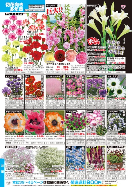 チョコの香り強健アガパンサスツイスター※(登録名:AMBIC001)1株1,190円602-2128放任栽培OKで栽培も簡単な美麗花!!(夏)7.5cmポット苗40〜70cm庭・鉢・切花6〜7月強チョコレートコスモス別名「白蝶草」フリーフォークロージー602-21132株○○○○りの葉と覆輪入りの花が美しい。全国栽培可能。強4〜10月10.cmポット苗0.4〜1m強春〜秋20〜0cm庭・鉢・切花庭・鉢切花990円イメージ7月お盆やお彼岸の切花に!!F1さきがけ雷山602-19605株1,290円F1雷山2号セレクト602-19745株1,290円F1雷山3号セレクト3,390円602-19895株1,290円一般的な鉄砲ユリの開花が終わった頃から開花する新鉄砲ユリ。中でも少しずつ開花がずれる3品種をセットにしました。新鉄砲ユリセット602-1993上記3種15株1組8月9月強庭・鉢・切花エキナセア放任栽培可130cm宿根アリウム(花色無選別)タチアオイ八重咲ミックス602-1940602-19556〜7月980円1,750円5株10株1.5〜2m花は下から上へと咲き進み、約2か月も楽しめます。中庭・鉢・切花花材に重宝!花材に重宝!ミューレンベルギアアネモネハロー602-1902契2株880円契タイム602-19172株880円ピアフ契602-19212株よく分枝するタイプ。花後に切り戻すと次々新しい芽が上がり、長く開花します。880円暑さに負けない強庭・鉢・切花キク花もち抜群!ヤツシロソウスカディ契602-19366〜11月2株880円50〜60cmバージン1,390円602-20592株鮮緑色の芯と白い花弁が美しい。次々開花します。10.5cmポット苗50cm庭・鉢・切花6〜8月強強6ミレニアム1,490円602-20442株細長い茎の先端に球状の花をコロニー状に咲かせます。10.5cmポット苗40〜50cm庭・鉢・切花〜8月霧島ヤツシロソウ1,050円602-2006花もちが良い無花粉の大輪花。大型種で毎年よくふえる。2株紅花団子菊1,500円3株602-2010真夏の暑さに負けずに咲く。花もちよく、切花に最適。赤色ミューレンベルギア980円602-2025スモーク状の穂をつけ、花材にすると華やかに。2株スプリングビューティーピンク1,190円602-2030鮮やかなピンクの花が美しい。丈夫で次々に花をつける。1株50〜80cm強6〜8月庭・鉢・切花80〜120cm7〜8月庭・鉢・切花強10〜12月90cm強庭・鉢・切花4〜10月20〜40cm強庭・鉢・切花切花向き多年草スプレーカーネーション発送開始:4月上旬より注文締切:4月末日9cmポット苗(一部除く)多年草タチアオイ巨大!!巨大!!イメージ新鉄砲百合ガウラ多花性スカビオサオリエンタルポピー2株サマーソルベット990円602-2151斑入葉が美しい。暑さ寒さに強く丈夫で育てやすい!!強庭・鉢・切花8〜10月80cmアトロパープレアボジョレー1,290円602-21663株銀葉と花弁のワインレッドのコントラストは見応え抜群。4〜6月40cm強庭・鉢・切花チョカモカ(登録名:KIECH1)2株880円602-2170暑さに強く開花期も長い。摘芯すると分枝し、花数もアップ!30〜40cm庭・鉢・切花春〜秋中60〜100cm40〜80cmフェスティバルピンク1,390円602-2132従来種に比べ草丈が低く株がまとまりやすいので、花壇でも美しい花姿を楽しめます。切花・アレンジにも大活躍!フェスティバルホワイト602-21471,390円2株2株多年草6〜8月強庭・鉢・切花花苗42本誌39〜45ページは数量に関係なく※上記以外のページの商品と送料取り合わせできません。※追加注文の場合は、荷造送料をご加算ください。荷造送料900円()北海道・沖縄便は1,500円代金引換をご利用の場合(離島不可)は、さらに代引手数料330円をご加算ください。栽培簡単!リシマキア華やか段菊!宿根カスミ草切花やアレンジに!段菊フラメンコ1,200円602-20631株数あるオリエンタルポピーの中でもずば抜けて大輪花。発色抜群で花壇等に植え付けて迫力ある演出に。プレスピガール602-2082ボレロ602-20781,200円1,200円1株1株素掘苗多年草5〜7月50〜100cm強庭・鉢・切花ジェラートブルーベリー1,290円602-2109四季咲き性高く、多花性で次々と花が咲きます。2株4〜10月20〜40cm強庭・鉢・切花