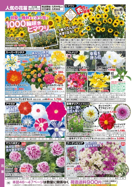 お届け苗はポットに入っておりません。お届け時は裸苗で長さ30〜50cm、3枝付きの大株です。葉も大株サイアムレッド開いていませんが、2〜3か月すると葉が出て観葉1株1,890円602-3183植物としても楽しめます。南国の花の代名詞。ハワイでは首飾りで知られるレイに使われる花として有名。現地では身に付けると幸福をもたらすとも。花にはとてもよい香りがあります。寒さには弱いので鉢植えにし、晩秋に上部を切り戻して管理します。弱(乾燥条件下:0℃)接木1年生裸苗大株カナリーイエロー1,890円602-31986〜10月50cm以上半常緑樹1株鉢数か月後の栽培イメージ大株カーニャホワイト602-31791株1,890円大株ハワイアンホワイト602-31641,890円1株皇帝ダリアハイブリッド※短日植物なので、電灯などで夜間も明るい所では花をつけません。寒さに強く開花も早い!!ガッツァリアダブルピンク(登録名:ミヨダリインペHSL)※1,190円602-32481株ガッツァリアダブルクリーム※ガッツァリアレッド※(登録名:ミヨダリインペEKD)(登録名:ミヨダリインペHDK)602-32291株1,190円皇帝ダリアより草丈がコンパクトで、花は1か月以上も早く咲き長期間の開花が楽しめます。寒冷地での栽培も可能!!602-32331株8〜12月中1,190円1.5〜2m庭・鉢皇帝ダリアガッツァリアセット602-3252上記3種3株1組3,290円トピカルな雰囲気満点!!栽培イメージブーゲンビリアブルーハワイ602-32862ポット1,290円サンデリアーナホワイトとサンデリアーナパープルの二色植えでお届け!斑入葉も見応え抜群!!サンデリアーナは小輪小型種で、花つきがよい希少な品種です。非多寒性多年草5〜9月50〜300cm荷造送料900円()北海道・沖縄便は1,500円代金引換をご利用の場合(離島不可)は、さらに代引手数料330円をご加算ください。弱鉢1株でこんなに大きくなる!!真夏の厳しい暑さに強く、種がつかないため初夏から晩秋まで長〜く咲き続けます。上手く育てれば1シーズンに花径10cm程の小さなヒマワリを1,000輪も咲かすことが可能!無花粉なので手や衣類も汚しません。切り花や、ドライフラワーにしても趣があります。今話題の1,000輪咲ヒマワリにぜひ挑戦してみてください♪プルメリア!幸福を呼ぶ花人気の花苗ポット苗多年草(一部除く)発送開始:5月中旬より注文締切:5月末日ヒマワリ初心者にも♪初夏〜晩秋まで次々咲く1000輪咲きヒマワリサンビリーバブルブラウンアイガール(登録名:SUNBELIV01)602-31071年草1,690円2株初夏〜晩秋80cm庭・鉢・切花スーパーランタナムーンホワイト(登録名:LAN14901)602-31112株880円休みなく咲き花つき抜群!サニーイエロー(登録名:LAN15104)602-31262株880円レインボーオレンジ(登録名:LAN10005)トロピカルサンセット(品種登録出願中:LAN17302)2株602-3130従来のランタナと比べ非常に分枝が良く、圧倒的な花つきを誇ります。こんもりと自然に丸くまとまり花が途切れることなく、次々と開花します。602-31452株880円880円5〜11月スーパーランタナセット50cm中(-3℃)庭・鉢602-3150上記4種4株1組1,700円アサガオ育てやすく!人気!イメージご当地朝顔お任せミックス(無選別・名称付)3株6株602-3200602-3214とても育てやすく、開花期間が長い品種です。巨大輪でくっきりとした色合いのご当地朝顔を集めました。990円1,890円※アサガオは短日植物なので、電灯等で夜間も光が当たる所では花をつけません。1年草7〜9月つる性弱庭・鉢マツバボタン休みなく花を咲かせる!!46本誌46〜47ページは数量に関係なく※上記以外のページの商品と送料取り合わせできません。※追加注文の場合は、荷造送料をご加算ください。2株4株リトルマーメイド602-3267602-3271豪華な八重咲きで、夏の花壇を彩る代表的なお花です。葉や茎は多肉質で、枝分かれしながら咲き続けます。乾燥・高温・病気に強いので、育てやすいです。庭・鉢880円1,680円非多寒性多年草10〜20cm6〜9月弱花苗