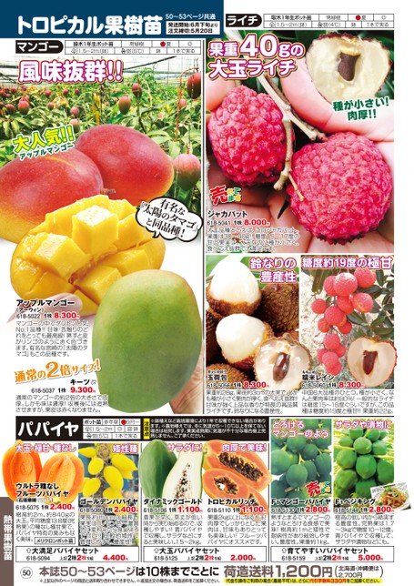 トロピカル果樹苗発送開始:6月下旬より50〜53ページ共通注文締切:5月20日マンゴー接木1年生ポット苗1.5〜2m(鉢)常緑樹弱(5℃)夏鉢1本で実る風味抜群!!果重40gの大玉ライチライチ取木1年生ポット苗1.5〜2m(鉢)常緑樹弱(4℃)夏鉢1本で実る大人気!!アップルマンゴー種が小さい!肉厚!!鈴なりの豊産性糖度約19度の極甘ぎょくかほう1株8,300円玉荷包618-5056果重約28g、果径約3cmの大実で、しかも種が小さく果肉が厚く、食べ応え抜群!!甘味が強く上品な香りが特長の高品質ライチです。鈴なりになる豊産性。もちごめ1株8,300円糯米レイシ618-5060中国6大品種のひとつ。種が小さく、なんと果肉率は約80%!一般的なライチは糖度15〜18度ぐらいですが、この品種は糖度約19度と極甘!!果重約22g。サラダや漬物にとろけるマンゴーのよう※鉢植えなど栽培環境により1年で収穫できない場合があります。※露地植えでは、冬に気温が5〜10℃以上を保てない場合は枯死します。果実成熟期に気温が不十分な場合樹上完熟しません。ご了承ください。注意点ジャカパット1株8,000円618-5041大玉品種といえば、このジャカパット。果重は30〜40g!!糖度15〜17度の甘い果実は、大玉なのに種が小さく、食べ応え抜群で大満足です。アップルマンゴー(アーウィン)1株8,300円618-5022マンゴーの中でダントツ人気No.1品種!!甘味・舌触りのどれをとっても最高級!熟すと皮がリンゴのように赤く色づきます。有名な宮崎の『太陽のタマゴ』もこの品種です。通常の2倍サイズ!キーツ9,300円618-50371株通常のマンゴーの約2倍の大きさで肉厚。しかも味は濃厚!収穫後には追熟させますが、果皮は赤くなりません。パパイヤ大玉・極甘・種なしポット苗多年草.15〜2m弱(5℃)9月〜庭・鉢1本で実る矮性種サラダに!肉厚で美味!調理例ゴールデンパパイヤ1株2,400円618-5080果長約15cmの細長い果実は、レモン色〜濃黄色に変わったら食べごろで甘い!!比較的矮性で管理しやすく、豊産性!ダイナミックゴールド1株1,100円618-5106着果が早く、草丈が低い時から実り始めるので、収穫しやすい!青パパイヤで収穫し、サラダなどにすると美味しい。1.5〜2kg。トロピカルリッチ1株1,100円618-5110果重2kg以上になる大玉!肉厚でしっかりとした果肉は、甘味もありとっても美味しい!フルーツパパイヤにオススメです。F1マンゴーパパイヤ1株2,800円618-5130熟すとまるでマンゴーのようなとろける食感で美味!樹高約1mと矮性で耐病性があり栽培しやすい。豊産性。果重約1kg。F1ベジキング1株2,800円618-5144樹高の低い内から結実する豊産性。完熟果は1.7〜3kgで糖度10〜12度。青パパイヤで収穫して、サラダや漬物などにも。大満足パパイヤセット618-5094上記2種2株1組4,400円大玉パパイヤセット上記2種2株1組618-51252,000円50本誌50〜53ページは10株までごとに※上記以外のページの商品と送料取り合わせできません。※追加注文の場合は、荷造送料をご加算ください。育てやすいパパイヤセット上記2種2株1組5,000円618-5159荷造送料1,200円()北海道・沖縄便は2,700円代金引換をご利用の場合(離島不可)は、さらに代引手数料330円をご加算ください。ウルトラ種なしフルーツパパイヤ(石垣珊瑚)PVP※1株2,400円618-5075樹高約2m。約840gの大玉。平均糖度13.8度(完熟果)の種なし極甘果で、パパイヤ特有の臭みもなく美味。メリクロンポット苗熱帯果樹苗