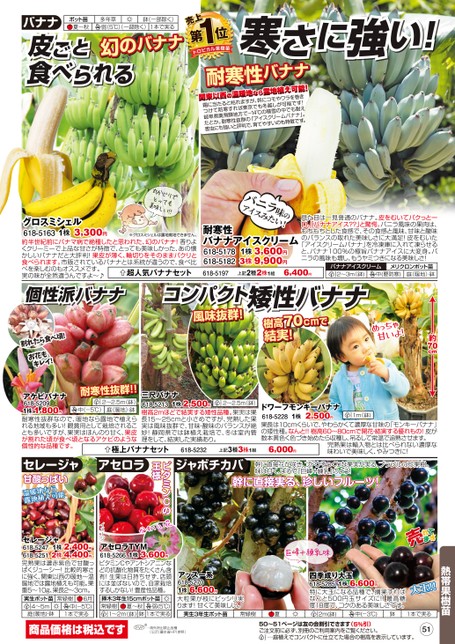 多年草弱(5℃)一部除く)鉢(一部除く)1本で実る幻のバナナバナナポット苗夏〜秋皮ごと食べられる売上1第位ロピカル果樹苗ト寒さに強い!耐寒性バナナ関東以西の温暖地なら露地植え可能!霜に当たると枯れますが、幹にコモやワラを巻きつけて防寒すれば東京でも冬越しが可能です!岐阜県奥飛騨地方で-14℃の積雪の中でも耐えたとか。耐寒性抜群の「アイスクリームバナナ」。害虫にも強いと評判で、育てやすいのも特徴です。バニアイスラ味のい!たみ1株3,300円グロスミシェル618-5163約半世紀前にパナマ病で絶種したと思われた、幻のバナナ!香りよくクリーミーで上品な甘さが特徴で、とっても美味しかった、あの懐かしいバナナだと大評判!果皮が薄く、輪切りをそのままパクリと食べられます。市販されているバナナとは系統が違うので、食べ比べを楽しむのもオススメです。実の味が全然違うんですよ〜♪超人気バナナセット※グロスミシェルは露地栽培できません。耐寒性バナナアイスクリーム618-5178618-5182618-51971株3,600円3株9,900円上記2種2株1組6,400円見た目は一見普通のバナナ。皮をむいてパクっと一口、バナナアイス??」と驚愕。バニラ風味の果肉は、もちもちとした食感で、その食感と風味、甘味と酸味のバランスの取れた美味しさに大満足!皮をむいた「アイスクリームバナナ」を冷凍庫に入れて凍らせると、バナナ100%の極旨バナナアイスに大変身。バニラの風味も増し、もうヤミつきになる美味しさ!バナナアイスクリーム2〜3m(鉢)メリクロンポット苗庭(暖地)・鉢中(要防寒)0約7cmコンパクト矮性バナナ風味抜群!樹高70cmで結実!個性派バナナ割れたら食べ頃!お花もキレイ!耐寒性抜群!!2〜2.5m(鉢)アケビバナナ618-52091株1,800円中(-5℃)庭(暖地)・鉢耐寒性抜群なので、暖地なら露地で植えられる地域も多い!観賞用として栽培されることも多いですが、果実はほんのり甘く、果皮が割れた頃が食べ頃となるアケビのような個性的な品種です。1株2,500円三尺バナナ2〜2.5m(鉢)618-5213樹高2mほどで結実する矮性品種。果実は果長15〜25cmと小さめですが、完熟した果実は風味抜群で、甘味・酸味のバランスが絶妙!静岡県では鉢植え栽培で、冬は室内管理をして、結実した実績あり。極上バナナセット618-5232上記3種3株1組1株2,500円ドワーフモンキーバナナ618-5228果長は10cmくらいで、やわらかくて濃厚な甘味の「モンキーバナナ」の矮性種。なんと!!樹高60〜80cmで開花・結実する優れもの!皮が数本黄色く色づき始めたら収穫し、吊るして常温で追熟させます。完熟果は輸入物とは比べられない濃厚な味わいで美味しく、やみつきに!6,000円1m(鉢)ジャボチカバ幹に直接花が咲き、ブドウそっくりな果実が実る、ブラジルの珍果樹。味は甘く、まるで「巨峰+練乳」のよう!幹に直接実る、珍しいフルーツ!ビタミンCの王様アセロラセレージャ甘酸っぱい温暖地なら露地植え可能熱帯果樹苗アッスー系618-52701株6,600円大粒果が枝にビッシリ実ります!甘くて美味しい。1株6,600円四季成り大玉618-5285特に大玉になる品種で、摘果すればなんと500円玉サイズに!!最高糖度18度で、コクのある美味しさです。大玉!!実生3年生ポット苗常緑樹夏2m(鉢)中(-3℃)鉢1本で実るアセロラTYM1株3,600円618-5266ビタミンCやアントシアニンなどの抗酸化物質をたくさん含有!生果は日持ちせず、店頭には並ばないので、自家栽培するしかない!豊産性品種。挿木3年生15cmポット苗常緑樹夏〜秋鉢弱(5℃)1本で実る1〜2m(鉢)イメージセレージャ1株2,400円618-52472株4,400円618-5251完熟果は濃赤紫色で甘酸っぱくジューシー!比較的寒さに強く、関東以西の暖地〜温暖地では露地植えも可能。果重5〜10g、果長2〜3cm。実生ポット苗6月中(-5℃)4〜5m常緑樹庭(暖地)鉢1本で実る商品価格は税込ですPVP※…海外持出禁止品種(公示(農水省HP)参照)50〜51ページは友の会割引できます(5%引)ご注文前に必ず、別冊のご利用案内をご覧ください。…庭植えでコンパクトに仕立てた場合の樹高を表示しています。51