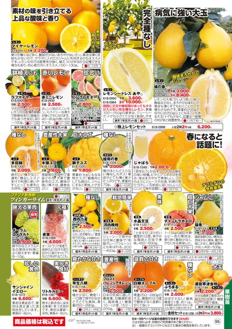 フィンガーライム※極晩生のため寒害に注意が必要。1〜4月1〜1.5m大玉※極晩生のため寒害に注意が必要。※極晩生のため寒害に注意が必要。病気に強い大玉完全種なし丈夫で育てやすい農研機構C酸味まろやかでジューシーレモンりか農研機構Cレモン3,600円1株3株10,000円レモンシードレスあや618-0950618-0964周囲に文旦や雑柑類があってもタネが入らない完全種なしレモン。果重100〜150gの果実は、ジューシーで、トゲも小さくて少なく栽培しやすい。接木1年生ポット苗9月〜※PVP1株3,000円3株8,400円璃の香618-0979618-0983レモンの大病「かいよう病」に強い!酸味は少なく、まろやかな味わいで、果皮も薄く手でもむくことができ、種も少なめです。果重約200gで、なかには250g以上になることもある大玉!トゲも少なく、収量は一般種の約2倍と超豊産性。11月下旬〜極上レモンセット618-0998上記2種2株1組6,200円寒さに強く育てやすいレモン1株2,200円マイヤーレモン618-0911果汁が驚くほど多く、酸味が少ないまろやかなレモン。果皮は薄く苦味も少ないので、サラダに入れたりジャムに利用するのもオススメです。レモンの中では耐寒性が強く、植えつけ2年目から収穫できる場合もあり、初心者の方にオススメ。100〜130g。9〜12月鉢植えにも赤いレモン珍しいレモンラフマイヤー618-09261株2,500円マイヤーレモンとラフレモンの交配種。強健で耐寒性あり。鉢植えでも実つき良好。80〜120g。9〜3月レモン赤ミニレモン618-09301株2,500円オレンジ色のミニレモン。スパイシーな香りが強くクセになります。40〜60gの使い切りサイズ。12〜3月レモンピンクレモネード618-09451株2,800円葉だけでなく、果皮にも斑が入る珍品レモン!果肉はきれいな桃色で、果汁も多い。80〜110g。10〜11月接木1年生ポット苗接木1年生ポット苗接木1年生ポット苗素材の味を引き立てる上品な酸味と香り種なし豊産性大果巨大ユズ種なし春になると話題に!ナリルチンの含有量多!じゃばら618-10491株2,000円「邪を払う」が由来といわれる縁起の良い柑橘。ビタミン・ミネラルを含み、味はまろやかで美味しい。ユズのようにジュースやお酒、料理の香りづけに。「花粉症に良いらしい」と口コミで毎年話題に。11月下旬〜※柑橘類を近くに植えると種が入る場合があります。ジャムに広島県C超巨大果美味種なし栽培簡単カボス祖母の香618-10341株3,000円種がほとんど入らない種なしカボス!果皮がとても薄く果汁たっぷりです。果重約70g。8〜10月接木1年生ポット苗ユズ獅子ユズ618-10201株1,800円果重約1kgにもなる特大ユズ!観賞用としても面白く、ジャムにすると美味。トゲが少ない。9〜12月イメージ1株1,600円徳島県旧木頭村で選抜された、大果で豊産性のユズ。酸味が強い果汁は、鍋物などに!8〜12月ユズ木頭ユズ618-10158〜12月元祖!※柑橘類を近くに植えると種が入る場合があります。ユズ多田錦618-10001株2,000円煩わしい種がない、通称「種なしユズ」!多汁で料理に使いやすくとっても便利と大評判。10〜1月プチプチ新食感!フィンガーライム映える果肉日向夏西内小夏618-11031株2,500円果肉はジューシーでやわらか。ほぼ種なし!豊産性で200g。※柑橘類を近くに植えると種が入る場合があります。また、極晩生のため寒害に注意が必要。5月上旬〜接木1年生ポット苗文旦系河内晩柑618-11181株2,000円ジューシーで爽やかな甘味と酸味で「和製グレープフルーツ」とも呼ばれる。200〜400g。3〜5月文旦水晶文旦618-11221株2,500円「土佐文旦」より甘い糖度約12度。爽やかな風味と甘味で美味。450〜600g。12月下旬〜文旦チャンドラポメロ618-11371株2,500円1〜1.5kgの超巨大果!ルビー色の果肉は、香り良く酸味少なく、クセになる美味しさ。1月下旬〜接木1年生ポット苗接木1年生ポット苗みずき瑞季618-1141PVP※文旦系1株3,300円風味抜群の甘い果肉は、苦味少なく美味。種が非常に少なく、隔年結果も少ない。400〜500g。3月中旬〜4月上旬爽やかな甘さ豊産性抜群の甘さ※金柑は年2〜3回開花します。第1回目の果実を残して、あとは摘果すると肥大よくなります。果樹苗にんぽう選抜寧波金柑618-1194キンカン1株2,200円十分な摘果で果径3cm越えの巨大果に!糖度10〜19度で美味。接木1年生ポット苗種なし※PVPキンカンぷちまる618-11801株2,000円ほぼタネなし!最高糖度21度、約11g。※柑橘類(金柑含む)を近くに植えると種が入る場合があります。金柑セット618-1206上記2種2株1組3,800円ハッサク早生八朔618-11561株2,500円種が少なく、糖度11〜13度で爽やかな甘さでとても美味。果重250〜280g。12月上〜中旬接木1年生ポット苗オレンジフロストバレンシアオレンジ618-11601株2,500円日本の気候に適した豊産種。甘酸調和良く、風味極上!糖度10〜12度、150〜200g。6〜7月接木1年生ポット苗ネーブル白柳ネーブル618-11751株2,200円果重250〜280gの大玉。糖度約12.5度で酸味少なく抜群に甘くて旨い!2月中旬〜3月中旬接木1年生ポット苗ダーラムエメラルド618-10531株6,600円鮮やかなエメラルド色の果肉が料理によく映えます!果重8〜10g。珍しい黄色赤実618-10681株4,000円オーストラリア原産