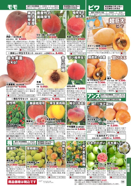 モモ接木1年生根巻苗落葉樹.25〜3m(一部除く)庭・鉢強1本で実る発送開始:3月上旬より注文締切:3月末日ビワ発送開始:3月上旬より注文締切:3月末日極早生で超大玉中(-5℃)大きさ比較!↑クイーン長崎↑玉子2.5〜3m1本で実る超巨大ビワ富士野生桃朱夏1株4,500円608-2687極早生の超大玉品種。最大400g(平均300〜350g)と玉揃いよい白肉桃。早生桃としてはかなり甘く糖度12度になり、栽培次第でそれ以上になることも!7月上〜中旬(山形)クイーン長崎2年生苗1株5,500円618-1607十分肥大すると100〜200gにもなる巨大ビワ!今までのイメージを打ち破る素晴らしい食べ応え!6月豊産性の美味早生R1株富士野生桃R4,500円ひとつ紅608-2668実つき抜群で、いっぱい実る豊産性!!果重270〜300g、糖度13〜16度と早生種としては、大きくて甘い百点満点の美味モモです。早生のモモは果実の管理期間が短く、初心者の方でも育てやすい!7月上旬(山形)甘さ濃厚美味早生こうき※1株富士野生桃4,500円昂紀608-2653糖度約13度、果重約280gと、早生種とは思えない濃厚な甘さと大きさ!開花から収穫まで日数が短いので、初心者でも育てやすい。しかも、無袋栽培可能で鮮やかな紅色に着色!7月上〜中旬(山形)美味しい早生モモセット608-2672上記2種2株1組8,400円甘い大玉※実つきが悪い場合は、異品種を混植すると実つきが安定します。甘い極早生!糖度約14度冬に収穫最大果重1kg!だいじゅみつとう1株富士野生桃大寿蜜桃608-2691最大果重1kg(平均450〜550g)!果肉は良く締まり繊維が少なく、糖度は16〜18度の甘さで美味!5,000円10月中旬〜寒冷地では追熟が必要5,000円冬桃608-27031株冬に収穫する超極晩生!果肉は緻密で硬く、甘い香りと平均糖度20度の甘さで美味。有袋栽培で美しい白桃に仕上がります。果重約250g。11月下旬〜晩生モモセット608-2718上記2種2株1組9,300円はなよめ1株3,600円608-2722最高糖度15度と甘くて多汁な極早生モモ。果重約250gと極早生モモとしては立派な大きさ。無袋栽培可能。6月下旬矮性桃無袋栽培可早生黄肉桃稀少!珍品!※なつたより1株3,300円618-1611糖度約14度と甘い果肉は、やわらかくジューシーで美味。果重約53g。5月下旬れいげつ麗月1株3,300円618-1626ビワの中で最も甘い、糖度14〜17度!大変甘くて食味抜群。果重50〜60g。がんしゅ病に強く育てやすい豊産種。5月中旬〜アンズ発送開始:3月上旬より注文締切:3月末日生で旨い!※2,200円おひさまコット608-42061株糖度約12度と甘くとても美味。巨大果(果重110〜120g)で、裂果少なく豊産性!6月下旬※2,200円ニコニコット608-42101株超豊産性!糖度約13度で酸味少なく生食にピッタリ!果重約90g。6月下旬生食向きアンズセット上記2種2株1組4,000円608-4225タネが小さい花も美しい農研機構C果樹苗※5,000円麗和(大梅)608-25501株果重30g以上と大きく、ヤニ果の発生が少ない!八重咲きの白花も楽しめます。1本で実る6月下旬農研機構C※和郷(大梅)1株608-25465,000円種が小さい30g以上の大果。ヤニ果の発生も少ない!梅干しや梅酒におすすめ。6月中旬1本で実るばんとうR千年蟠桃富士野生桃1株3,600円608-2760扁平で凹んだユニークな形。とろけるような食感で甘くて美味!果重約250g。9月上旬〜1本で実る南高梅薫南高(大梅)608-25311株3,000円1本で実る「南高梅」!!種が小さく、果肉歩合が高い。着果多く豊産性。梅干しに最適!6月中旬1本で実るようかひ陽夏妃1株5,000円608-2741やや硬めの果肉は、糖度12〜13度と甘くてとってもジューシーで香りよく美味しい!日もち性良く、無袋で栽培可能。果皮は赤色に染まり、果重は約350g。8月中旬米倉金桃【ネクタリンの変異種】1株4,000円608-2756糖度11〜13度で甘味が強く酸味・苦味がほぼない極旨の黄肉桃。やわらかな果肉から、果汁が溢れ出すほどジューシーで最高!果重200〜240g。7月上〜中旬(山梨)旨味たっぷり発送開始:3月上旬より注文締切:3月末日受粉樹に2,000円小粒南高(中梅)608-25121株果重16〜25g。南高梅として出荷できるため、和歌山県の南高農家では定番の受粉樹。紅さし(大梅)608-25271株2,200円種が小さく、果肉歩合が約94%!旨味成分が多く梅干し・梅酒に最適。果重約30g。みきドワーフ1株3,600円608-2737果重約200gで、上品な甘さで食味もすこぶる良い。花も楽しめる矮性種。接木1年生ポット苗1.5〜2m7月下旬〜8月上旬梅豊産性1,800円藤五郎(大梅)608-25081株果重20〜30gの大粒梅。豊産性で品質よく、梅酒・梅干し作りにピッタリ!薄桃色花は花粉多く、受粉樹にも。商品価格は税込ですPVP※…海外持出禁止品種(公示(農水省HP)参照)58〜59ページは友の会割引できます(5%引)ご注文前に必ず、別冊のご利用案内をご覧ください。…庭植えでコンパクトに仕立てた場合の樹高を表示しています。59