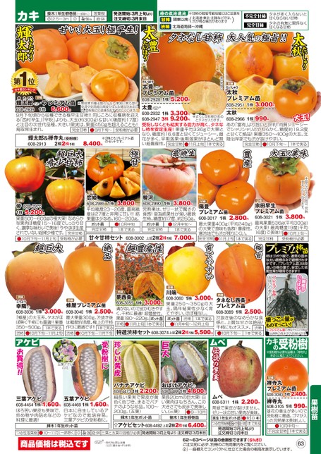柿苗柿はゴボウ根で、通常の苗木は太い直根のみで細根がわずかです。「プレミアム苗」は段違いの根の量で、安定した初期生育が期待できます!!極旨※肩の辺りの渋味は、完熟するとなくなります。甘柿甘柿陽豊プレミアム苗608-30171株最大果重400g(平均240g)の大果で食味も抜群!豊産性。寒冷地でも渋が残りにくい。完全甘柿2,800円1本で実る11月上旬宗田早生プレミアム苗608-30211株最高果重536g(平均300g)の大果!最高糖度19度(平均16度)で美味!!10月上旬〜3,800円完全甘柿受粉樹が必要育てやすい甘柿甘柿1株恋姫608-2985平均糖度23〜26度、最高糖度は27度と非常に甘い!!結果量は少なめ。160〜200g。3,800円1株駿河608-2990完熟果は、ゼリー状で驚きの食感!単為結果性が強い最晩生柿。糖度約17度、約250g。3,800円ポット苗完全甘柿10月中旬1本で実るポット苗完全甘柿12月中旬〜1本で実る甘々甘柿セット608-3002上記2種2株1組7,000円超豊産性絶品たいしゅう太秋タネなし甘柿大人気の極旨!!※甘柿の栽培可能地域にはご注意を)不完全甘柿完全甘柿タネが多く入らないと甘くならない甘柿タネの有無に関係なく甘くなる甘柿渋柿北海道南部〜沖縄接木1年生根巻苗(一部除く)強※.25〜3m落葉樹庭・鉢発送開始:3月上旬より注文締切:3月末日柿の栽培適地柿の栽培適地関東以南甘柿(太豊たいほう甘い!大玉!極早生!C※※1株5,200円太豊プレミアム苗608-2928太豊608-2932※近くに受粉樹がある608-2947とタネが入ります。受粉しなくとも結実する能力が高く、タネなし柿を安定生産!果重平均336gで大果となり、糖度約16.6度と甘くてジューシー。雌花が多く、早期落果・後期落果がほとんど無い超豊産性。完全甘柿1本で実る1株3,300円3株9,200円11月上旬甘柿たいしゅう1株3,000円太秋プレミアム苗608-2951太秋大玉!608-2966あの「富有」より旨いと評判!肉質ジューシーでシャリシャリとやわらかく、糖度約19.2度と甘くて絶品!果重350〜400gの大玉。北陸沿岸部でも渋が抜けやすい。10月下旬〜1株990円1本で実る完全甘柿農研機構甘柿たいほう大玉&美味豊産最晩生極甘きたろう甘柿※1株6,600円プレミアム苗輝太郎※無核果や種子数の少ない果実に果芯部の空洞や空洞部の黒変が生じる場合があるた608-2909め、受粉樹との混植をおすすめしています。9月下旬頃から収穫できる極早生甘柿!!同じころに収穫期を迎えると注目の次世代品種。大きい果実は、果重450gを超えることも!鳥取県生まれ。受粉樹が必要「西村早生」「早秋」よりも、大玉(約300g)&甘い(糖度約17度)9月下旬〜完全甘柿輝太郎&禅寺丸(受粉樹)608-29132種2株1組超巨大希少甘柿※2株ともプレミアム苗のセットです。8,400円カキきたろう輝太郎1第位カキ苗ランキング細根がいっぱい!プレミアム苗のお届けの根の様子根っこの量がものすっごい!※プレミアム苗の表記がない商品は通常の苗木でのお届けです。カキの受粉樹※受粉樹が必要な品種は、禅寺丸」を近くに植えつけてください。果樹苗甘柿1株2,400円禅寺丸プレミアム苗608-3093禅寺丸1株990円608-3105雄花の着生が多いので受粉樹に最適。ゴマが入った完熟果は美味しい。10月中旬〜不完全甘柿1本で実る渋柿1株蜂屋プレミアム苗2,500円608-3040最大果重300g。渋抜き後は糖度約18度。極上の干柿作りに最適です!!1本で実る10月下旬〜11月下旬渋柿渋柿1株夢西条3,000円608-3055溝がないので皮がむきやすく、干柿に最適!超豊産性。果重180〜220g。渋柿ポット苗1本で実る11月上旬渋柿1株川端3,000円608-3060果重250〜350gの大玉。隔年結果性少なく育てやすい。ほぼ種なし。ポット苗1本で実る渋柿11月中旬〜12月上旬特選渋柿セット608-3074上記2種2株1組5,500円渋柿1株タネなし西条プレミアム苗2,500円608-3089渋抜き後のなめらかな食感と、上質な甘さは絶品!干柿にもオススメ。渋柿1本で実る10月下旬〜三葉アケビ1株1,600円608-4454ほろ苦い果皮も美味で、炒め物や肉詰めなどの料理に最適!五葉アケビ1株1,600円608-4469日本に自生しているアケビなので栽培容易。三葉アケビの受粉樹に。バナナアケビ1株2,200円608-4473細長い果実で果皮が黄色く色づき、まるでバナナのような珍品。100〜200g。(五葉)挿木1年生ポット苗おばけアケビ1株4,600円608-4488果長20cmの巨大果!白い果肉はもちろん、この大きさでも皮まで美味しい。(三葉)9〜10月接木1年生根巻苗アケビセット608-4492上記2種2株1組6,400円つる性落葉樹10〜11月(一部除く)強庭・鉢三葉と五葉の混植が必要発送開始:3月上旬より注文締切:3月末日1株ムベ2,200円608-5311常緑で果皮が裂けません。ゼリー状の甘い果肉が美味。実生1年生ポット苗つる性常緑樹秋1本で実る庭・鉢中発送開始:3月上旬より注文締切:3月末日ムベ伝説の果実巨大珍しい黄皮受粉樹に五葉アケビの花アケビお買得!!商品価格は税込ですPVP※…海外持出禁止品種(公示(農水省HP)参照)62〜63ページは友の会割引できます(5%引)ご注文前に必ず、別冊のご利用案内をご覧ください。…庭植えでコンパクトに仕立てた場合の樹高を表示しています。63甘柿帝608-29701株5,200円果重500〜600gの極大果!なめらかな果肉は糖度15〜16度でしっかり甘く、