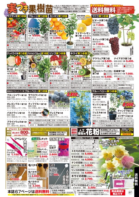 ※色づいた果実は輸送中に落果することがあります。植え替えは、収穫後に行ってください。※写真はイメージです。苗木には個体差があり、樹形も異なります。発送開始・注文締切:各商品ごとに記載実つき果樹苗(67ページ掲載商品)は※北海道・沖縄便は1商品ごとに別途1,00円が必要です※他のページ商品とは取り合わせ不可↓お届け苗見本(樹高約60㎝)ブドウ実つき苗ピオーネ実つき608-55601株7,500円巨峰より大玉の人気種。8月下旬〜挿木3年生21cm鉢発送開始:7月中旬よりタノレッド実つき608-55741株7,500円甘くて美味!赤紫色果。8月下旬挿木3年生21cm鉢発送開始:7月中旬よりデラウェア実つき1株6,600円608-5589甘い小粒の赤ブドウ。家庭で栽培容易。8月ナイアガラ実つき1株6,400円608-5593香り良く甘い白ブドウ。強健。8月下旬〜カベルネソーヴィニヨン実つき9月中旬6,400円608-5605超有名赤ワイン用品種。1株巨峰実つき7,000円608-56101株濃厚な甘さとコクで美味。8月下旬〜9月上旬※収穫物からアルコール濃度1%以上の製品を無許可で醸造すること、及び混成酒(果実酒)を作ることは、酒税法で禁止されています。発送開始:7月上旬より注文締切:5月20日(一部除く)ブルーベリー実つき苗8,000円ハイブッシュ系609-1422チャンドラ実つき世界最大級粒。エリザベス実つき甘い&大粒。609-1437↑お届け苗見本(樹高40〜60cm)サザンハイブッシュ系オニール実つき609-1391甘い大粒で豊産性。サンプソン実つき609-1403大〜極大粒の豊産性。ジュエル実つき609-1418甘くて美味しい大粒。↓お届け苗見本(樹高〜1m)0.8サクランボ実つき苗プルーン実つき苗カンキツ実つき苗←お届け苗見本キンカン:40〜50cmレモン:約50cm福寿キンカン実つき618-22041株3,000円大実金柑。生食は不向きで、ジャムや砂糖漬けに。接木2年生15cm鉢3〜5月上旬9〜12月中庭・鉢1本で実る発送開始:8月下旬より注文締切:5月20日マイヤーレモン実つき618-22191株4,400円一般種より酸味少なくまろやか。球形果。接木2年生15cm鉢2.5〜3m1〜1.5m常緑樹リンゴ実つき苗↓お届け苗見本0㎝)(樹高約6スタンレイ実つき608-55171株香り良く、ジューシーで甘い!40〜50g。接木3年生18cm鉢6,600円9月上旬〜落葉樹2.5〜3m庭・鉢1本で実る発送開始:6月上旬より注文締切:5月20日強↓お届け苗見本(樹高約60㎝)暖地桜桃実つき608-55021株暖地で1本で実る小粒種。鉢植えにも。接木3年生18cm鉢4,500円落葉樹5月下旬強3〜4m1本で実る発送開始:4月中旬より注文締切:3月末日庭・鉢びっくりぐみ実つき苗パッションフルーツ実つき苗キウイ実つき苗スーパーゴールド実つき608-55401株3,300円10月下旬〜ヘイワード実つき608-55551株3,300円10月下旬〜お届け苗見本↑(樹高約30㎝)※各オス木は本誌60頁でお買い求めくださいつる性落葉樹接木2年生15cm鉢各々オス木が必要発送開始:6月中旬より注文締切:5月20日中庭・鉢↓お届け苗見本(樹高約40〜60㎝)アルプス乙女実つき608-55361株5,800円果重25〜30gのミニリンゴ。美味!接木3年生18cm鉢落葉樹25〜3m1本で実る発送開始:6月中旬より注文締切:5月20日9月下旬〜強庭・鉢↓お届け苗見本0㎝)(樹高約3エデュリス実つき618-22231株3,300円トロピカルな果実と花も楽しめる。挿木1年生18cm鉢つる性常緑樹中(-2℃)鉢1本で実る発送開始:6月中旬より注文締切:5月20日夏↓お届け苗見本0㎝)(樹高約6びっくりぐみ実つき608-55211株4,500円完熟果は甘い。生食や果実酒に。挿木3年生18cm鉢落葉樹6月中〜下旬2.5〜3m強庭・鉢ジベレリン処理が必要発送開始:5月下旬より注文締切:3月末日暖地向けラビットアイ系ブルーベリー実つき苗ブルーシャワー実つきサウスランド実つき609-1315609-1300強健で初心者向け。大粒。暑さに強い豊産性。中粒。5,800円オレゴンブルー実つき609-1320甘くて美味しい中〜大粒。ティフブルー実つき609-1334甘い中晩生。暑さに強い。パウダーブルー実つき609-1349甘い最晩生。中粒、豊産性。バルドウィン実つき609-1353甘くて風味良い中〜大粒。T-100実つき609-1368果汁たっぷりで美味。大粒。プレミア実つき609-1372大変育てやすい。甘い大玉。ブライトウェル実つき609-1387甘く、美味中粒。豊産性。ジベレリン荷造送料まとめて人工授粉資材800円下記の商品は、数量に関わらず1回のご注文につき送料800円で取り合わせ可能です。他商品とは取り合わせできません。※果樹苗とは同梱不可です。友の会割引はできません。発送開始:3月上旬より注文締切:4月20日人工授粉用(全国共通)花粉発送開始:5月下旬より注文締切:4月20日発送開始:3月上旬より(キウイの花粉は3月下旬より)注文締切:4月20日※果樹苗とは同梱不可です。また、友の会割引はできません。代引き不可【花粉使用について(共通)】キウイの人工授粉作業風景めしべに花粉をちょんちょん●郵便(常温便)でのお届け予定です。●商品到着後は冷凍庫で保管してください。●使用前には冷蔵庫で解凍してください。●使用当日に必要量の花粉と増量剤を混ぜ合わせ、その日のうちに使い切ってください。●各1組で約4〜5年生樹1本に交配可能な量です。1組5,500円スモモの花粉【花粉2g、増量剤10g】618-9109モモの花
