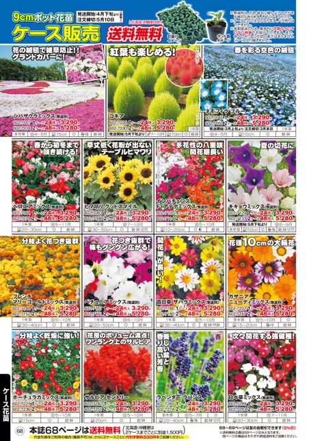 ※無選別は、花色・草丈に偏り・バラつきがある場合があります。予めご了承ください。※ケースでのご注文となります。バラ売りはできません。※早期発送のため、基本的に花芽のついていない若苗でお届けいたします。また、各々のポットに花色の表示はありません(ラベルは付属しません)。お届けイメージポット苗イメージ(一部除く)発送開始:4月下旬より注文締切:5月10日イメージ1年草庭・鉢ネモフィラブルー602-7045602-70501ケース24株入2ケース48株入3,290円5,280円発送開始:3月上旬より注文締切:3月末日4〜5月10cm※秋の様子イメージ1年草庭・鉢コキア602-7026602-7030発送開始:5月下旬より1ケース24株入2ケース48株入3,290円5,280円7〜10月70cmイメージ強庭・鉢シバザクラミックス(無選別)602-7007602-7011多年草1ケース24株入2ケース48株入4〜5月15cm3,290円5,280円※一重咲が混ざることがありますキキョウミックス(無選別)602-7129602-71331ケース24株入2ケース48株入発送開始:5月下旬より庭・鉢多年草50cm強イメージ3,290円5,280円6〜9月庭・鉢・切花イメージインパチェンスF1アテナミックス(無選別)602-7100602-71141年草10〜20cm1ケース24株入2ケース48株入3,290円5,280円5〜10月ヒマワリグッドスマイル602-7083602-70981年草30〜50cm1ケース24株入2ケース48株入3,290円5,280円7〜10月庭・鉢・切花イメージベゴニアミックス(無選別)602-7064602-70791年草20〜30cm1ケース24株入2ケース48株入3,290円5,280円5〜11月庭・鉢68〜69ページは友の会割引できます(5%引)※送料無料企画は68ページのみとなります。他ページの商品はそれぞれ荷造送料をご加算ください。イメージ日々草ミックス(無選別)1ケース24株入602-72892ケース48株入602-72931年草20〜30cm3,290円5,280円7〜11月庭・鉢3,290円5,280円庭・鉢・切花イメージガザニアニューディミックス(無選別)602-7202602-72171ケース24株入2ケース48株入3,290円5,280円多年草15〜20cm5〜10月中庭・鉢イメージ百日草ザハラミックス(無選別)602-7186602-71901年草30〜40cm1ケース24株入2ケース48株入3,290円5,280円庭・鉢・吊鉢5〜10月イメージペチュニアミックス(無選別)602-7167602-71711年草20〜50cm1ケース24株入2ケース48株入6〜10月3,290円5,280円庭・鉢サルビアセントリー1ケース24株入602-72402ケース48株入602-72551年草20cm3,290円5,280円5〜10月庭・鉢ラベンダーラバンス1ケース24株入602-72602ケース48株入602-7274多年草5〜7月20〜40cm強68本誌68ページは送料無料()北海道・沖縄便は2ケースまでごとに別途1,500円代金引換をご利用の場合(離島不可)は、さらに2ケースごとに代引手数料330円をご加算ください。イメージフレンチマリーゴールドミックス(無選別)3,290円602-71485,280円602-71521年草30〜40cm1ケース24株入2ケース48株入6〜10月庭・鉢ポーチュラカミックス(無選別)602-7221602-72361年草15cm1ケース24株入2ケース48株入5〜10月3,290円5,280円庭・鉢イメージケース花苗