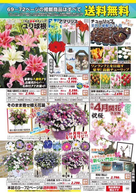 強4月開花予定株今年祝桜花芽つき苗でお届けします入学や入社、新生活新しい門出に!高級感あふれる陶器鉢に植付け済※写真はイメージです。掲載の品種が入るとは限りません。お届け苗イメージ↑化粧箱入りポットイメージフレーミングパロットグリーンランドマウントタコマ←球根イメージポットアマリリスの開花イメージ栽培簡単69〜72ページの掲載商品はすべて送料無料※69〜72ページ以外の商品には、それぞれ荷造送料をご加算ください。※北海道・沖縄便は1商品ごとに別途1,500円が必要です。(一部除く)※代金引換の場合は1商品ごとに別途代引き手数料【330円】が必要です。※写真はイメージです。掲載の品種が入るとは限りません。これが最後のチャンスユリ球根アマリリスチューリップ芽出し球根ポット苗芽出球ポッ苗まだまだ間に合う!間に豪華な八重咲きを品種見計らい・名称付きでお届け!特選八重咲花ユリ詰合せ601-750410球2,990円(品種見計らい・名称付)送料無料球根庭・鉢・切花6〜7月50〜150cm強発送開始:1月中旬より注文締切:2月末日球根アマリリス福袋601-3501601-35164球1組12球1組4,490円12,900円(品種見計らい・名称付)化粧箱入ポットアマリリス福袋(品種見計らい・名称付)601-3520601-35354箱1組12箱1組5,590円15,980円球周約26cm送料無料おたのしみ送料無料ストロングゴールドサンネガボタ豪華!高級芽出しチューリップセット2,690円601-3619上記7種28ポット1組ニューサンタ送料無料3〜6月30〜50cm中鉢・切花9cmポット苗発送開始:1月中旬より注文締切:3月末日3〜5月庭・鉢・切花発送開始:2月下旬より注文締切:2月末日20〜50cmおうちでお花見お届け苗イメージそのまま寄せ植え花苗栽培イメージ姫小菊のお届け苗見本にだ鉢る号え7替でけえ植1ポットに3色の苗が入っているので、そのまま植え替えるだけで、オシャレで華やかな寄せ植えが楽しめます!2か月後にはモリモリに!!パープルホワイトピンクバスケットホワイトミッドナイトブルーライトブルーローズクールホワイトバイオレット送料無料※鉢のデザインは変更する場合があります祝桜(旭山)1鉢604-26052,790円送料無料陶器鉢入り強落葉樹庭・鉢発送開始:3月上旬より注文締切:3月末日4月下旬小輪栽培イメージ春〜秋0〜20cm中1姫小菊栽培イメージ4〜6月0〜30cm弱23色花苗カラーズセット上記3種3ポット1組602-30042,290円送料無料栽培イメージ春、秋0〜20cmロベリアバコパ園芸初心者でも華やかな寄せ植えが作れちゃう♪10.5cmポット苗庭・鉢多年草または1年草中1発送開始:4月上旬より注文締切:4月末日本誌69〜72ページは送料無料()北海道・沖縄便は1商品ごとに別途1,500円代金引換をご利用の場合(離島不可)は、さらに代引手数料330円をご加算ください。※送料無料企画は69〜72ページのみとなります。他ページの商品はそれぞれ荷造送料をご加算ください。商品価格は税込です69