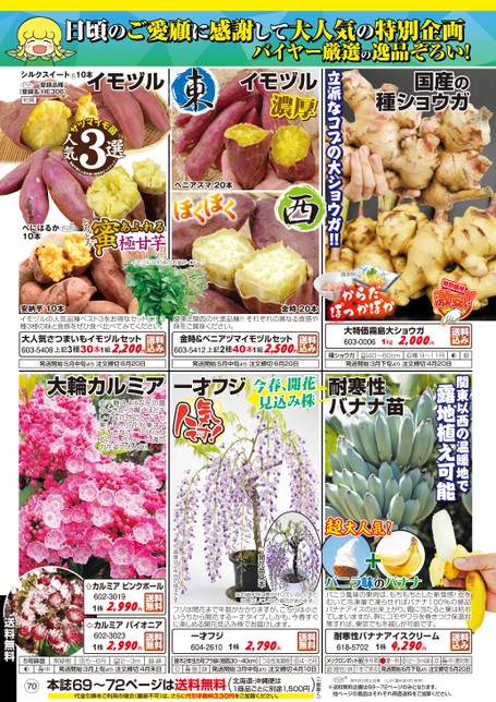 日頃のご愛顧に感謝して大人気の特別企画バイヤー厳選の逸品ぞろい!国産の種ショウガイモヅル濃厚濃厚立派なコブの大ショウガ!立派なコブの大ショウガ!!!ベニアズマ20本極甘芋イモヅル100本のお届けイメージとろとろべにはるか10本※PVPシルクスイート10本PVP※登録品種(登録名:HE306)イモヅル苗ツマイモ3選気の高い商品を人!ピップッアク特にサ人気当店で粘質安納芋10本イモヅルの人気品種ベスト3をお得なセットに!!3種3様の味と食感をぜひ食べ比べてみてください。大人気さつまいもイモヅルセット送料込み603-5408上記3種30本1組2,200円金時20本関東と関西の代表品種!!それぞれの異なる食感や味をご賞味ください。金時&ベニアヅマイモヅルセット603-5412上記2種40本1組2,500円送料込み発送開始:5月中旬より注文締切:6月20日発送開始:5月中旬より注文締切:6月20日調理例からだぽっかぽか大特価霧島大ショウガ603-00062,000円1kg送料込み種ショウガ40〜60cm収穫9〜11月畑発送開始:3月下旬より注文締切:4月20日超大人気!関東以西の温暖地で露地植え可能大輪カルミア金平糖のような形の蕾のときから、驚くほどキレイな花色でとっても美しい。小花が集まって大きなボール状になるので、ボリューム満点の花姿で大人気!一才フジ今春、開花見込み株耐寒性バナナ苗+バニラ味のバナナバニラ風味の果肉は、もちもちとした新食感!皮をむいて冷凍庫で凍らせればバナナ100%の絶品バナナアイスの出来上がり。霜に当たると葉は枯れてしまいますが、幹にコモやワラを巻きつけ保温対策すれば、東京でも冬越しが可能です。耐寒性バナナアイスクリーム618-5702送料込み4,290円1株メリクロンポット苗庭(暖地)鉢多年草1本で実る夏〜秋2〜3m(鉢)中(要防寒)発送開始:6月下旬より注文締切:5月20日PVP※…海外持出禁止品種(公示(農水省HP)参照)※送料無料企画は69〜72ページのみとなります。他ページの商品はそれぞれ荷造送料をご加算ください。開花苗見本画像は2年目の様子ですカルミアピンクボール602-3019送料無料1株2,990円カルミアパイオニア602-3023送料無料1株2,990円※お届け時に蕾が付いていない、または開花していない場合があります。フジは開花まで年数がかかりますが、こちらは小さいうちから開花する一才タイプ。しかも、今春すぐに楽しめる開花見込み株でお届けします。一才フジ604-26101株2,790円送料無料常緑樹庭・鉢発送開始:3月上旬より注文締切:4月末日5〜6月2〜3m中接木2年生5号プラ鉢(樹高30〜40cm)4〜5月発送開始:3月中旬より注文締切:4月10日つる性落葉樹鉢強(一部除く)本誌69〜72ページは送料無料()北海道・沖縄便は1商品ごとに別途1,500円代金引換をご利用の場合(離島不可)は、さらに代引手数料330円をご加算ください。705号鉢苗送料無料