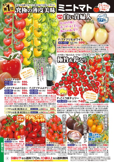 売上1第ミニトマト位まるで高級フルーツ!驚くほど美味しく美しい。究極の薄皮美味ミニトマト白い貴婦人甘味が強く、育てやすく美しい期待の新星!!大玉・中玉は4・5ページに掲載!!スタッフイチおしF1TYプリモホワイト606-49211袋(6粒)500円白皮が目を惹く極上のミニトマト!やや大きめの実は旨さと食べ応えを兼ね備え、酸味をほぼ感じない極上の甘味が舌を楽しませてくれます。試食スタッフは「こんなに美味しいなんて…!」とびっくり。糖度10度前後、花数が非常に多く収量性に優れ、複合耐病性を持つので育てやすい!20gコク深い「味の良さ」でリピート率ダントツ!!極旨&鈴なりてんもでめ初れ穫くさ。たビックリ性て)女代02(甘味と酸味のバランスが見事!一番好きな品種F1こくうまチェリー606-49361袋(30粒)すっごい甘さ(糖度9〜10度)と絶妙な酸味で、コクと旨味がたっぷりの濃厚な味わい!ミニの中では粒が大きめで、ゼリー部が少なく肉厚。しかもブドウを想わせるほどの実つきの良さで、食べ応えも抜群!裂果少なく、萎凋病・ネマトーダ・TMV・葉カビ病に複合耐病性を持ち栽培簡単!!初めてのトマト栽培にもぜひ選んで欲しい品種です。20g740円(50代男性)超豊産性!!食べきれ実る♪ないほど1袋(10粒)F1ゴールデンハニー580円606-4989暑さに強く、食べ切れないほど実る!甘味がとっても強く、酸味をあまり感じないため、食べた瞬間「これがトマト?」と疑うほど甘〜い!20g高リコピン黒トマト51袋(10粒)F1ブラックナイト70円606-4974葉緑素やリコピンを一般品種より多く含有し栄養満点!!熟すと黒みがかった赤茶色になる、甘くコク深い美味品種。生育旺盛で育てやすい!25g極甘の美味トマト0年をかけて開発に2辿り着いた【最高傑作】です。食味と薄皮の絶妙なバランス、自然な甘味と濃厚な旨味をお楽しみください。にでで性す)卓族い女収穫並後ぶ取食家合0代、とり3(1袋(9粒)2袋F1CFプチぷよ550円606-4848990円606-4852F1CFプチぷよイエロー550円606-4867990円606-48711袋(9粒)2袋F1CFプチぷよグリーン550円606-4886990円606-48901袋(9粒)2袋「本当に旨いミニトマト」を求め、弊社スタッフがたどり着いた極上品種!舌の上で超薄皮がプチンと弾け、「濃くて」「甘い」味わいで口の中がいっぱいに!!イエローは、薄皮はそのままに、赤いタイプより甘味が強くまるで極上のフルーツ。昨年登場した黄緑熟果が珍しいグリーンも大好評!希少な高級品種としても知られ、極上の食味・外観は惚れ込むに値する見事な逸品!葉カビ病抵抗性があり育てやすい!!15gプチぷよ赤・黄2色セットプチぷよ赤・黄・緑3色セット606-4902606-4917上記2種2袋1組上記3種3袋1組990円1,485円最高糖度550円1袋(8粒)F1サクラハニー606-4960果皮は薄く果肉柔らかく食味抜群!美しいピンク色の果実は最高糖度12度以上となり、甘酸のバランスも抜群。苗も毎年大人気です。15〜20g定番品種1袋(10粒)F1アイコ550円606-4955可愛いプラム形の、おなじみ極甘ミニ。肉厚な果肉はシャキッと食感良く、酸味は少なく食味抜群!!鮮やかな果皮は割れにくく、作りやすい♪18〜25g1袋(8粒)F1豊産あま娘600円606-4940糖度は簡単に11度を超え、最高糖度は驚きの14度、うまくいけばそれ以上にもなっちゃう超高糖度ミニトマト!!1房に18〜50粒も実る超豊産性。とにかく甘い、定番の人気品種です!15〜20g野菜たね29袋以下なら送料170円、10袋以上なら送料無料たねのご注文に代金引換はご利用いただけません。播種や植え付け後の栽培条件、天候等によりその結果が異なることがありますが、弊社の責と考えられる結果不良の責めはお買い上げ代金の範囲内とさせていただきます。また、果重・糖度などはおよその数字です。