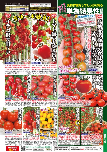 受粉作業なしでしっかり実る単為結果性品種ラクラクっさりど!結実!※2〜5ページのトマト共通<栽培型例>播種×定植98収穫1020〜30℃果重または果径(約)1mlあたり約60〜80粒※発芽させるには播種床を上記の温度にしてください。※標準発芽率:80%※入り数は目安です。品種により差があります。1袋(6粒)F1トマトベリー1038660円606-5006イチゴ形で糖度9度と甘味強く、1花房に20〜30果も着果する豊産性ミニトマト。実の品質も安定しており、キュートで美味しいミニトマトがたくさん収穫できます!!16g550円F1アップルベリー606-50101袋(8粒)珍しいベル形ミニトマト。甘味が強く酸味は少なく、特有の青臭さがほぼなくメチャ旨!複合耐病性があり、豊産性で栽培容易!!育て甲斐のあるちょっと大きめミニトマト♪20〜25g欠けのない見事な房成り!!18〜20gトマト嫌いも唸る旨さ※空中栽培例イメージ234567×移植栽培直播栽培イチゴ形で甘~い高糖度で極上の食味と素晴らしい実つき実の品質・揃いが抜群の豊産性で、糖度高く食味に優れた、バイヤー注目の新品種!裂果少なく、葉カビ病に強く、花が咲くだけで結実する、大変育てやすいミニトマトです。単為結果性って?トマト栽培では、実付きをよくする為にホルモン処理などの受粉作業を行いますが、手間やコストがかかってしまいがちです。しかし「単為結果性品種」は、受粉作業をしなくても果実が大きくなる性質を持つので、虫が少ない場所やベランダなどでもお手軽・簡単に栽培を楽しむことができます。ヘタまで美しい美味品種F1エコマッチ606-50781袋(8粒)550円めちゃくちゃ強健!味で勝負野菜たね600円1袋(10粒)F1べにすずめ606-5109自然着果するので授粉作業不要。複合抵抗性がある極早生の豊産性品種です。肉質がしっかりしており、甘酸のバランスもよく食味抜群!!濃赤で球形の果実は揃いよく美しい!15〜20g鈴成り!!600円1袋(8粒)F1CFネネ606-5097受粉なしでも実ができる美味トマト。糖度8〜9度で、ゼリー部がしっかり感じられ濃厚な味わいです。葉カビ病・モザイク病に耐病性があり栽培容易。美味しいミニトマトをたくさん収穫しましょう!12〜18gF1かむり600円1袋(8粒)品種登録出願中(登録名:ET-1807)606-5082人工授粉なしでも着果・肥大する、裂果しにくい省力多収ミニ。甘酸のバランスが絶妙でとっても美味しい!黄化葉巻病に耐病性がある極早生で、ヘタが肉厚なため、収穫後の巻き上りが少なく美しい果姿に。葉カビ病に強い1袋(8粒)F1プラレ606-5030糖度8〜10度で、果汁が多くジューシーで美味!葉カビ病・モザイク病に抵抗性を持ち育てやすいのも嬉しい!プラム形の美味品種をお試しください♪12〜18g600円酸味が行方不明!!甘い!!とろける甘さ!!とびっきりの甘味1袋(10粒)F1クリスタルキャンディ550円606-5025最高糖度13度のとっても甘いミニトマト!房状にびっしり艶やかなトマトが実る姿は壮観。栽培しやすく、甘くて美味しいミニトマトがいっぱい楽しめます。17g食味抜群!!F1スイートルビー606-50441袋(10粒)550円味わい深い大きめのミニ!ボリューム満点でコクがあり、他品種とは一味違う旨さ!!病気にも強く育てやすい、家庭菜園に一押しの品種です。25〜30gF1シュガー606-50591袋(15粒)638円大人気のロングセラー!!その名の通り、すごく甘くて舌の上でとろけちゃいそう!!糖度はなんと約9.5度。たわわに実る豊産性で、裂果しにくく日持ちも抜群。16gF1ゴールドスイート606-50631袋(10粒)550円肉厚でジューシーな果肉は、と〜っても甘くて美味しい!生育旺盛で耐暑・耐病性に優れ、育てやすい。15g商品価格は税込ですオンラインショップからも購入できます!限定商品も!PCからは野菜たね発送開始:2月より注文締切:4月末日2〜3ページは友の会割引できます(5%引)ご注文前に必ず、別冊のご利用案内をご覧ください。3