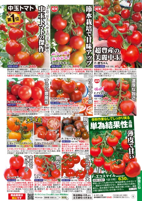 節水栽培で甘味アップゴルフボール大病気に強く栽培容易!F1CFドルチェ606-52541袋(10粒)600円超豊産の美麗中玉F1愛ちゃん606-52691袋(8粒)451円露地栽培で平均糖度8度に。甘酸のバランス絶妙でコクもあり、糖度以上に旨味を感じられます。まさにミニの甘さと大玉の旨さのいいとこどり!1房に8〜12個も着果する豊産性で、草勢強く作りやすい!30〜40g葉カビ病など複合抵抗性あり!節水栽培で糖度8度以上も狙える、コク深くジューシーな美味品種。草勢が強く、病気になりにくいので育てやすく、食味も抜群のオススメ中玉トマトです。35〜50g超豊産性で秀品率が高い、発色の美しい中玉。ツヤツヤの果皮は美しく、しっかり締まった果肉は食べ応え満点!!暑さに強く、裂果もしにくいので、美味しい完熟果がザクザク収穫できますよ〜♪35g強健!580円F1TYマリオ606-52921袋(10粒)糖度7〜8度と高く、甘酸味のバランスがよく非常に美味。肉質がしっかりしており、食べ応えも抜群です。黄化葉巻病耐病性があり、疫病、青枯病等にも複合耐病性があり育てやすい!50〜60gリコピン2倍すごい豊産性F1フルティカPVP(登録名:タキイミディ195)550円1袋(10粒)F1甘熟むすめ606-5273濃厚な甘味と絶妙な酸味で素晴らしいコク!果肉が厚くゼリー部分が少なく、まるでフルーツを食べているような感覚で大人気。ゴルフボールサイズの果実が1株に約200果も実る超豊産性!45g638円1袋(16粒)606-5288リコピンを従来品種の約2倍含有!群を抜く甘さで、果皮は薄くて口に残りにくく、ゼリーの飛び出しが少ないです。劣果しにくく、葉カビ病(Cf9)にも耐病性があり育てやすい!40〜50gミニの「甘さ」と、中玉の「コク」が融合。中玉トマトの傑作中玉トマト売上1第中玉トマトたね位F1けっさく606-52401袋(15粒)595円濃厚な旨さ薄皮で甘い受粉作業なしでしっかり実る単為結果性品種旨い!↓セレブスイート一般的な中玉↑80〜100gF1セレブスイートオレンジ606-5304ただ甘いだけではない、濃厚な旨味が口で弾ける極上トマト。赤・オレンジともに、中玉トマトの中では大振りで食べ応え満点。草勢が旺盛で、家庭菜園で育ててもプロ級の出来栄えに!!F1セレブスイート606-53191袋(8粒)1袋(6粒)451円580円100g690円F1フルーツゼブラ606-53231袋(8粒)旨味成分・グルタミン酸や、即効性のエネルギー源アスパラギン酸、リコピンを一般中玉種より豊富に含みます。酸味少なく濃厚な旨味がたまらない!25〜30g鈴なりまるでフルーツ発送開始:2月より注文締切:4月末日4〜5ページは友の会割引できます(5%引)ご注文前に必ず、別冊のご利用案内をご覧ください。5野菜たね1袋(6粒)F1エコスマイル品種登録出願中606-5361受粉しなくても実がなる「単為結果性」の中玉トマト。薄皮ながら裂果が少なく、果実は白色から赤色に変化し、節水栽培では特に果実の揃いが良い。糖度が高く酸味が少ないので食べやすい。630円35〜45g520円1袋(12粒)F1レッドオーレ606-5338フルーティな食味が特長。極甘で酸味が抑えられた粘質な食感は、これまでの常識とはかけ離れたレベル!萎凋病、ToMVに耐病性があり高品質。40〜50g商品価格は税込です550円1袋(1ml)F1こくうまミディ606-5342ミニトマトみたいな鈴なり!味が濃く甘く、旨味が凝縮!豊産性で裂果しにくく、家庭菜園にも最適。豊産性で、夏〜秋にかけてトマト三昧!30〜35gオンラインショップからも購入できます!限定商品も!PCからは野菜たね550円F1フルーツボール606-53571袋(6粒)ゴルフボールサイズで甘〜い!完熟果で裂果が少なく、甘味も食味も申し分なしの逸品。萎凋病・ネマトーダ等に耐病性を持ち育てやすい!露地でも育てやすい品種です。50g