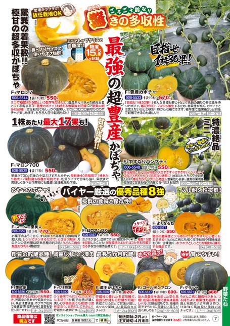 特濃絶品ミニいK!這O地もorち中空っどF1豊産カボチャ606-55331袋(9粒)570円「目指せ1株30果!!」そんな目標も夢じゃない、名前の通りの多収性を持つカボチャ。雌花が50〜70%も着生するため、着果性が高く、カボチャとは思えないほどの実が1株から収穫できます。極早生で着果後35日前後で収穫できるのも嬉しい!!700g〜1kg35〜37日最強の超豊産かぼちゃ甘さ抜群!!食べきりサイズで使いやすさ抜群!ミニでトップクラスの高糖度!!糖度を記録管理がラクラク!放任栽培OK調理例驚異の着果数!極甘の超多収かぼちゃ!1袋(10粒)F1マロン7606-5514ミニで糖度15.5度という数字を叩きだし、豊産系カボチャの絶対王者として君臨する「F1豊産カボチャ」を超える着果数を記録した驚異の超多収品種!!放任栽培でもしっかり着果し、まさにゴロゴロ鈴なりのカボチャが楽しめます。もちろん空中栽培もOK!500〜600g43〜45日550円1株あたり最大17果も!1袋(7粒)F1すずなりパンプティ606-5548放任栽培でも700g程度の大きすぎず小さすぎない、ベストサイズのカボチャがゴロゴロ鈴なり状態に!地這はもちろん空中栽培もOK!雌花が50〜70%も着生し着果性も抜群。濃黄の果肉は強粉質で甘味も強く、肉厚で食べ応えも抜群!550円500〜700g35〜37日ツル耐久性抜群!8調理例抜群の食味と保存性!調理例おやつカボチャ!F1マロン700606-5529果重が700g前後の中型えびす系カボチャ。受粉後40日程度で1株あたり最大17果程度も収穫が可能です。粉質タイプで甘味も強く、果皮まで美味しく食べられ煮物にも最適!放任栽培も可能。40日1袋(7粒)550円700g770円F1スーパー栗美人606-55521袋(8粒)お菓子のように甘く、ずば抜けた高糖度の強粉質で超人気。レンジでチンするだけで、とびきり美味!カロテンの含有量は従来品種の約3倍!うどんこ病の発生が少ない豊産性!2kg40〜50日1袋(7粒)F1虹ロマンDX606-5567ホクホク甘く、追熟でさらに糖度はアップし、糖度15度を記録したことも!保存環境がよければ3か月も貯蔵できる多収性の優秀品種です。45〜50日1.7〜1.8kg580円粉質の貯蔵品種!綺麗なオレンジ果肉最長5か月貯蔵!めちゃ旨っ!空中栽培!OK!F1よくなるね606-55711袋(10粒)驚きの着果性とツル持ちで、育てやすく初心者にもおすすめ!うどんこ病にも強く空中栽培や抑制栽培もOK!甘味強く、ホクホクとしっとりが絶妙に調和する逸品です。2kg40〜50日550円育てやすい!野菜たね468円1袋(9粒)F1グラッセ606-5621うどんこ病に耐病性があり、つる持ちよく着果性も抜群!粉質と粘質のよさを併せ持つ、甘味強く風味良い美味カボチャです。50日1.7〜1.9kg1袋(10粒)F1栗政宗550円606-5586抑制栽培すると約3か月も貯蔵でき、貯蔵中の色あせや腐敗が少ない。果皮は濃緑色。ホクホク粉質で食味抜群!草勢が強く着果も安定し育てやすい。50日1.8〜2kg!ホクホク甘い!F1くり将軍473円606-55902・3番果でも約2kgの大果になる早生!粉質で肉色が濃く美しく収穫直後でも糖度10度程度あり、追熟なしでも旨い!貯蔵性も抜群です。2kg50日1袋(7粒)620円1袋(7粒)F1蔵王かぼちゃ606-5602貯蔵性に優れた多収品種で、最長5か月もの貯蔵が可能!熟成させるほどに甘味が増し、ホクホク美味しい最高のカボチャに!50日1.8〜2kg1袋(10粒)F1ゴールデンマロン600円606-5617味と収量性を追求した早生品種!粉質&高糖度で食味は最高レベル。抑制栽培もでき、播種時期をずらせば、美味しい南瓜が長く楽しめる♪2kg45〜50日商品価格は税込ですオンラインショップからも購入できます!限定商品も!PCからは野菜たね発送開始:2月より注文締切:4月末日6〜7ページは友の会割引できます(5%引)ご注文前に必ず、別冊のご利用案内をご覧ください。7