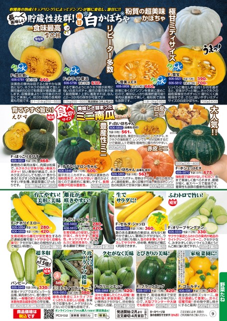 390円700円1袋(5粒)1袋(10粒)F1雪宝606-5827606-5812じっくりと糖化し貯蔵約1か月を過ぎると、甘味がグッと増し、ホックホクの超粉質極甘カボチャに!!腐りにくく長期保存でき、さらに扱いやすいミディサイズの白皮かぼちゃ。700g40日極甘ミディサイズリピーター多数粉質の超美味かぼちゃ極甘貯蔵性抜群!白かぼちゃ長~く美味しい収穫後の熟成(キュアリング)によってデンプンが糖に変化し、激甘に!!収穫後の熟成(キュアリング)によってデンプンが糖に変化し、激甘に!!食味最高雪化粧R440円1袋(8粒)F1雪化粧606-5781淡黄色の果肉は茹でると鮮やかな黄色になり、ホクホクの強粉質で旨い!開花後約50日で粉質度が最高潮に達します。収穫直後より1か月後の方が甘くて美味しく、約3か月間の長期貯蔵も可能です。2.1〜2.4kg50〜55日630円1袋(8粒)F1ホワイト栗浜606-5796まるで栗のようにホクホク感が非常に強い白皮カボチャ。雌花の着花率が良く栽培簡単♪上手に風乾すれば、なんと2〜3か月の保存が可能です。2.5kg55〜60日発送開始:3月上旬よりF1雪美人EX606-58081袋(10粒)660円非常に多くのデンプンを果実に溜めこむので、極甘&しっかり長期貯蔵可能!!果肉は濃黄色で美しく、極粉質で食味も抜群です。45日1.8〜2kg大人気!!調理例白皮ミニ561円(品種名:白坊)F1白い坊ちゃん606-58501袋(6粒)果肉は黄金色、果皮が灰白色のミニカボチャ。ホクホクの強粉質で、レンジで5〜8分加熱するだけで美味しい!貯蔵性・耐病性に優れ作りやすい。400g40日赤皮ミニ豊産性ミニ食べサイズ切り1袋(10粒)F1すずなりマロンちゃん600円606-5846扁平形ミニカボチャ。果肉は濃黄色の強粉質系で、ホクホク甘い!雌花がよく咲くので連続的に着果しやすく、長期収穫が可能な豊産性。40日500g1袋(6粒)F1赤い坊ちゃん(品種名:赤坊)606-5865赤皮ミニカボチャ。草勢はやや強く、雌花の発生がよく連続着果し、長く収穫が可能。果肉はオレンジ色の粘質系で甘味が強く美味!300g40〜45日561円35〜40日500gF1ポシェットEX606-5870強粉質で味付けなしでも甘い!皮まで美味しく食べられます。節間が短く、省スペースで栽培でき、着果性も抜群の豊産性品種です。1袋(5ml)675円育てやすく旨い!えびす468円F1ほっこりえびす606-58311袋(9粒)黄橙色の果肉は厚く、肉質は粉質で、ホクホクと甘味が強い美味カボチャ!甘い煮物が絶品で、ホクホク天ぷらにしても旨い!!昔からある「えびす」の改良品種で、作りやすい早生種。家庭菜園にぴったりです。.5〜1.6kg40〜45日1育てやすい!美形・美味雌花が咲きやすい!生でサラダに!ふわトロで旨い!野菜たね家庭菜園に!※果皮に緑色の部分が現れることがありますが、品種特性で病気ではありません。食味に影響は出ません。クセがなく美味とびきりの美味!1袋(10粒)F1グリーンエッグ420円606-5968次々と着果したくさん収穫!耐病性強く家庭菜園に。柔らかい果肉はクセがなく、炒め物など幅広く活躍。200g3〜5日1袋(10粒)F1ブラックエッグ420円606-5972豊産性で、栽培後期まで安定収穫できる!ツルが伸びないので、大型プランターや大鉢でも栽培OK!200g3〜5日1袋(10粒)F1ゴールディ420円606-5987黄金色の卵形ズッキーニ。雌花が連続して着果し、次々と収穫可能!炒め物や蒸し焼きにすると最高!200g3〜5日珍しいストライプ模様R1袋(12粒)F1オリーブヤングマン606-5934サクサク果皮とふわトロの果肉が絶品のライトグリーンズッキーニ。クセが少なく、みずみずしく甘い!ウイルス病とうどんこ病に強く育てやすい。4〜5日330円20cm調理例360円F1ゼルダ・ジャッロ606-59201袋(10粒)艶のある濃黄色の果皮は、紋もなく鮮やかで美しい。葉柄にトゲが少なく、ウイルス病にも強い。生のまま薄くスライスしてサラダや、炒め物、煮物など幅広く利用できます。3〜5日20cm3〜5日280円420円1袋(5粒)1袋(10粒)F1グリーンスターズ606-5900606-5915生育初期より安定して雌花が咲く、作りやすい豊産性。キュウリモザイクウイルスに抵抗性あり。光沢のある濃緑で美味!18〜20cm8〜9ページは友の会割引できます(5%引)ご注文前に必ず、別冊のご利用案内をご覧ください。9(一部除く)発送開始:2月より注文締切:4月末日オンラインショップからも購入できます!限定商品も!PCからは野菜たね280円420円F1ナポリイエロー606-58841袋(5粒)606-58991袋(10粒)生育初期から雌花が安定着生するので連続収穫可能!トゲが少なく収穫も楽々♪クセがなく油との相性がよいので幅広い料理に。5〜7日20cm超多収他品種の約1.5倍!330円1袋(8粒)バンビーノ606-5949本場イタリアではポピュラーな品種。果肉柔らかく、香り豊かで美味。一般種の約1.5倍の収穫本数を誇る超多収性の早生種。10〜15cm(花ズッキーニ:5cm)3〜5日商品価格は税込です1袋(8粒)F1ストライプズッキーニ380円606-5953緑色の果皮にストライプがくっきり入る珍しい品種。多果性で収量も多く、トゲがほとんどないので収穫も容易です。