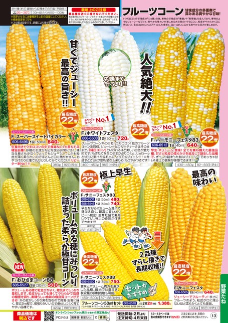 皮付重(約)播種から収穫までの日数(早晩性)25〜30℃30mlあたり約90〜100粒※発芽させるには播種床を上記の温度にしてください。※標準発芽率:75%※入り数は目安です。品種により差があります。栽培上のご注意異品種を近くに植えないでください。異品種(特にホワイトコーンやスイート種以外の品種)と交雑すると、粒の色が本来のものと異なる等、品質が低下します。風で花粉が飛んでくることもあるので注意してください。フルーツコーン甘味成分の多重奏で深みある爽やかな甘味!トウモロコシの甘味成分「ショ糖」の他、果物の甘味成分「果糖」や「麦芽糖」を含んでおり、果物のようなジューシーな甘さと、爽やかな味わいが楽しめる大注目のトウモロコシ。粒皮がやわらかく口に残りにくく、生のままかじればプチっとした食感と、口いっぱいに広がる爽やかな甘さが楽しめます。人気絶大!!先端までびっしり!!No.1ホワイトコーン甘くてジューシー最高の旨さ!!最高糖度フルーツコーン系最高糖度極上早生早生フルーツコーン系1袋(30ml)1袋(50ml)F1サニーフェスタ83480円606-6531740円606-6546早生ながらボリューム満点で見栄え良く、最高に旨いとリピート続出!生育旺盛で栽培しやすい。極上の食味が体感できます!!!430g82〜83日(早生)ボリュームある穂にみっしり詰まった柔らか極甘コーン最高の味わい最高糖度早生最高糖度No.1フルーツコーンフルーツコーン系1袋(40ml)F1ハーモニーフェスタ83640円606-6512早生・ボリューム・食味!全てを兼ね備えた最強品種。甘さと粒皮の柔らかさを追及して誕生した品種で、ぎっしり詰まった粒はジューシーでめっちゃ甘い!極上の食味が体感できます!!!430〜450g82〜83日(早生)720円F1ホワイトフェスタ1袋(30ml)606-6508フルーツコーン系の白粒トウモロコシ!他のフルーツコーン系同様、ジューシーなフルーティーさはそのままで、「純白コーン」といわれるほど美しい白色が魅力的です。もぎたてを生のままかぶりつくと、じゅわーっと甘〜い果汁が溢れ出し、とってもジューシー!火を通すとさらに芳醇な香りも楽しめ、もうやみつきです!!400〜450g86日(中早生)早生840円1袋(50ml)F1スーパースイートバイカラー606-6496生食向きトウモロコシの中で食味No.1と言われる極旨品種!砂糖の主成分などを含み非常に甘く、嫌な生臭さも少なくてとってもジューシー。しかも粒皮が薄く柔らかいのでほとんど口に残りません。おやつ代わりに畑で丸かじりしてみてください!リピーター率No.1!!82日(早生)380gスーパースイート系最高糖度2品種ずらし播きで長期収穫!!最高糖度400g86日(中早生)野菜たねフルーツコーン系1袋(40ml)F1サニーフェスタ606-6565ジューシーでフルーティ!まさにフルーツのよう。粒皮が口に残らないほど柔らかくとても美味。640円1,380円スーパースイート系500円1袋(30ml)F1おひさまコーン88606-6527ボリュームある穂で粒並びがよく、穂先までしっかり着粒します。粒皮がとっても薄くてやわらかで抜群の糖度を誇り、素晴らしい食味の極良質コーンができる!外の皮がしっかり実を包むので鳥害・虫害に強く、草丈2m程で、根張りがいいので倒伏しにくく育てやすい品種です。88日(中生)420gフルーツコーン系1袋(50ml)F1サニーフェスタ88750円606-6550食味とボリューム両方を追求した品種。暖地では夏まき、秋収穫の抑制栽培も可能。450〜500g87〜88日(中生)セットがおすすめフルーツコーン50mlセット606-6570(セット内容:F1サニーフェスタ83・F1サニーフェスタ88各1袋50ml入)上記2種2袋1組商品価格は税込ですオンラインショップからも購入できます!限定商品も!PCからは野菜たね発送開始:2月より注文締切:4月末日12〜13ページは友の会割引できます(5%引)ご注文前に必ず、別冊のご利用案内をご覧ください。13