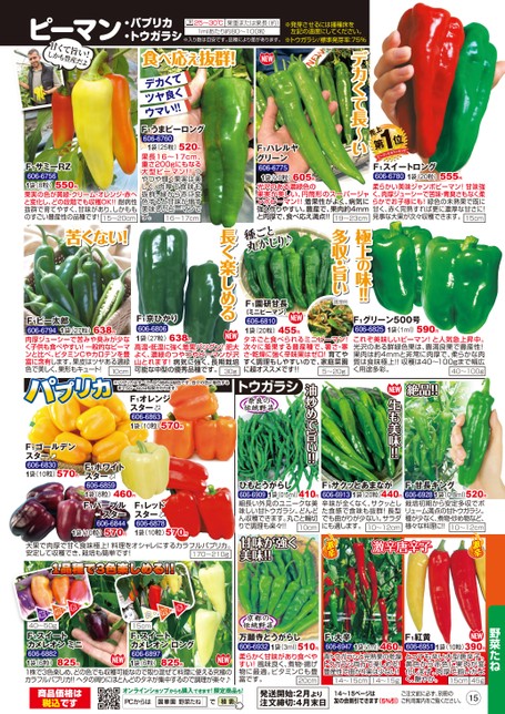 上1第マたンーピ位ねランキングデカくて長〜い売F1ハレルヤグリーン606-67751袋(20粒)605円光沢のある濃緑色の果実が美しい、円筒形のスーパージャンボピーマン!!着果性がよく、病気に強く作りやすい。豊産で、果肉約4mmと肉厚で、食べ応え満点!!19〜23cm555円1袋(20粒)F1スイートロング606-6780柔らかい美味ジャンボピーマン!甘味強く、肉厚ジューシーで苦味・青臭さもなく柔らかでお子様にも!緑色の未熟果で既に甘く、赤く完熟すれば更に濃厚な甘さに!見事な大果が次々収穫できます。15cm!極上の味!多収・旨い調理例種ごと丸かじり♪F1園研甘長(ミニピーマン)長く楽しめる590円F1グリーン500号1袋(1ml)606-6825これぞ美味しいピーマン!と人気急上昇中。光沢のある鮮緑色果は、豊満良果で豊産性!果肉は約4mmと非常に肉厚で、柔らかな肉質は食味極上!!収穫は40〜100gまで幅広く用途多彩。40〜100g絶品!!生も美味!!油炒めで旨い!!638円1袋(27粒)F1ピー太郎606-6794肉厚ジューシーで苦みや臭みが少なく子供も食べやすい!一般的なピーマンと比べ、ビタミンCやカロテンを豊富に含有します。果皮はツヤある濃緑色で美しく、果形もキュート!10cmF1京ひかり606-68061袋(27粒)高温・低温に強く着果バツグン!肥大よく、濃緑のつやつやピーマンが沢山とれます!病気に強く、長期栽培可能な中型の優秀品種です。30g638円455円606-68101袋(20粒)タネごと食べられるミニピーマン!次々に着果する豊産種で、暑さ・寒さ・乾燥に強く辛味果はゼロ!育てやすく調理もしやすいので、家庭菜園に超オススメです!!5〜20gパプリカ※パプリカはすべて、なり始めは緑色です。各々の色に着色するまで55〜60日程度かかります。F1オレンジスター606-68631袋(10粒)570円トウガラシ奈良の伝統野菜1袋(0.5ml)ひもとうがらし410円606-6909細長い外見のユニークな美味しい甘トウガラシ。どんどん収穫できます。丸ごと輪切りで調理も楽々!!10cm1袋(20粒)F1サクッとあまなが440円606-6913辛味が全くなく、サクッとした食感で食味も抜群!長型でも曲がりが少ない。サラダにも適します。10〜12cm1袋(0.8ml)F1甘長キング520円606-6928栽培初期から安定多収でボリューム満点の甘トウガラシ。種が少なく、煮物・炒め物など、様々な料理に!!10〜12cm甘味が強く美味!!激辛唐辛子野菜たね1袋(10粒)F1紅黄390円606-6951とっても辛い大型唐辛子。黄色から赤色に果肉が変化します。肉厚で揃いがよく、艶やか。45g15cm京都の伝統野菜万願寺とうがらし510円1袋(3ml)606-6932柔らかく甘味があり食べやすい!風味良く、煮物・揚げ物に最適。ビタミンCも豊富です。20cm1袋(1ml)F1大辛460円606-6947青トウガラシと完熟果の乾燥トウガラシ両方で楽しめる!豊産性で曲がり果は少ない!14〜15g14〜15cmF1ゴールデンスター606-68301袋(10粒)570円460円F1ホワイトスター606-68591袋(8粒)F1パープルスター606-6844570円1袋(10粒)F1レッドスター606-68781袋(10粒)570円大果で肉厚で甘く食味極上!料理をオシャレにするカラフルパプリカ。安定して収穫でき、栽培も簡単です!170〜210g赤橙赤橙紫40〜50gF1スイートカメレオンミニ606-68821袋(6粒)1株で3色楽しめ、どの色でも収穫可能なので取り混ぜて料理に使える究極のカラフルパプリカ!!ヘタの周りにほとんどのタネが集中するので調理が楽々♪白15cmF1スイートカメレオンロング606-68971袋(6粒)825円825円商品価格は税込ですオンラインショップからも購入できます!限定商品も!PCからは野菜たね発送開始:2月より注文締切:4月末日14〜15ページは友の会割引できます(5%引)ご注文前に必ず、別冊のご利用案内をご覧ください。15ピーマン・パプリカ・トウガラシ25〜30℃果重または果長(約)1mlあたり約80〜100粒※入り数は目安です。品種により差があります。※発芽させるには播種床を左記の温度にしてください。※トウガラシ/標準発芽率:75%甘くて旨い!しかも豊産だよ食べ応え抜群!デカくてツヤ良くウマい!!F1うまピーロング606-67601袋(25粒)520円果長16〜17cm、重さ200gにもなる大型ピーマン!!つやつや輝く果実は美しく、肉厚で食味も抜群。緑から赤に変色すると甘味が増す美味しいピーマンです。16〜17cm550円F1サミーRZ606-67561袋(8粒)果実の色が黄緑・クリーム・オレンジ・赤へと変化し、どの段階でも収穫OK!!耐病性抜群で育てやすく、甘味があり、しかもものすごい豊産性の品種です!15〜20cm苦くない!