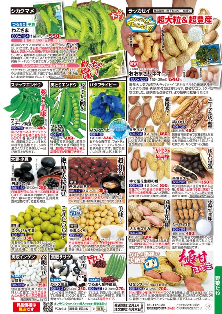 ユニークな珍品種超優秀!タチマサリ606-72461袋(30ml)660円ゆで落花生にすると最高に美味しい有名品種。収量が多い極早生品種です。縞ひかり606-72501袋(30ml)開花後75日前後で収穫適期となる極早生。薄皮のまだら模様が珍しい、小粒で美味しい落花生!1莢に3〜4粒実が入り、炒って食べると絶品。480円珍しい黒色早生の最高峰ゆで落花生郷の香550円606-7265開花70〜75日後に収穫できる極早生の最高品種。なんと夏頃に収穫!!ゆでるだけで非常に美味!1袋(30ml)1袋(20ml)黒落花生606-7270希少価値が高く注目を集める品種。殻をむくと現れる豆は黒皮!この黒皮は、アントシアニン等の栄養素を多く含有。発送開始:2月下旬より350円小粒で美味480円ジャワ13号606-72991袋(30ml)開花75日前後で収穫適期の小粒の早生種。放任栽培でもよくでき、空洞莢はほぼなし。炒り落花生に最適の逸品です。生甘落花極国内主要品種ナカテユタカ606-72841袋(25ml)素晴らしいコクと風味!高品質で、国内産落花生の主要品種。家庭で作れば美味しさも格別。550円グルメ番組で大絶賛超有名美味!超大粒&超豊産↑おおまさりネオ発送開始:3月下旬より(一部除く)ラッカセイコンパクト変わらない!!になっても↑一般品種➡草姿がコンパクトに↑おおまさりネオ↑一般品種※画像はすべてイメージです。おおまさりネオ※606-72311袋(30ml)640円毎年大人気の超巨大ラッカセイ「おおまさり」の後継品種!!大きさや収量・秀品率・食味は変わらず、草姿がコンパクトになりました。耐病性も改善され、より簡単に栽培可能に!!調理例バタフライピー春まき向き従来のシカクマメは短日にならないと開花しませんが、わこさま」は日長に関係なく開花するので、従来種より早期からの収穫が可能!!播種して2か月後くらいから、霜が降りる直前まで収穫し続けられます。従来種は大莢にすると硬くなりますが、「わこさま」は莢長14〜18cmの長さになってもやわらかいまま!天ぷら・かき揚げなど揚げ物が絶品サクサクとした食感でほのかな苦みがあり、天ぷらやかき揚げなど、揚げ物にすると絶品です!!その他にも炒め物や塩ゆでにしても美味しい。スナップエンドウ実とりエンドウ莢ごと美味シカクマメ平莢つるありわこさま606-71241袋(10ml)550円日長に関係なく開花し、収穫期長いつるなし実取豌豆606-71431袋(30ml)強健で病気に強く、節間が短く、作りやすい超極早生種。濃緑色で甘味強い極上品質の実が収穫できます。280円330円バタフライピー606-71581袋(15粒)イメージ鮮やかな青花で、フォトジェニックなハーブティ作りに!若莢も食せます。暑さに強い。ただいま人気上昇中!!野菜たね登録名:千葉P114号)Qなっつ606-7300甘さが際立つ極甘ピーナッツ!コクのある美味しい落花生は数あれど、「こんなに甘いの!?」と驚く衝撃的な食味の品種は他にありません。病気に強く、栽培しやすい豊産性で、たくさん収穫して茹でるもよし、炒るもよし。1袋(25ml)700円※(つるありパンダ菜豆350円606-7212パンダ模様が特徴の、育てやすい豊産種。ほくほく食感で、煮物・ぜんざい等の材料に!1袋(30ml)つるありつるあり金時菜豆270円606-72271袋(30ml)すじなしで揃い良く多収。若莢は柔らかく美味で、実取用にもなる両用タイプ。1袋(20ml)つるあり大福豆350円606-7208甘納豆・煮豆・和菓子等の原料として重宝。正月の豆きんとん等にも人気の高級品種。発送開始:3月上旬より16〜17ページは友の会割引できます(5%引)ご注文前に必ず、別冊のご利用案内をご覧ください。17(一部除く)発送開始:2月より注文締切:4月末日オンラインショップからも購入できます!限定商品も!PCからは野菜たね商品価格は税込です調理例小豆丹波大納言606-7177抜群の色艶と香りを併せもつ、大粒の小豆。小豆の中では一番美味しいと有名!!皮が薄くつぶあんに向き、豆自体の味は濃厚でコクがあります。1袋(40ml)350円大豆たまふくら606-71961袋(30ml)従来種丹波黒大豆を親に持つ、大粒の美味大豆!!もっちりと甘く、煮物や筑前煮にすると最高に美味!市場にも滅多に出ないレア品種です。341円たまふくらい!旨白×黒実取ササゲ高級白豆絶品!大粒黒豆こうじいらず調理例1袋(30ml)サラダスナップ豌豆480円606-7139莢ごと食べるスナップエンドウの中でも特に皮がやわらかい!春・夏・秋まきができ、収穫幅が広いつるありの極早生品種です。50秒湯がくだけで美味しい一品が出来上がります。↑3Lサイズ大豆・小豆↑通常サイズ1袋(30ml)大豆丹波大粒3L606-7162丹波黒大豆の3Lサイズの種を選抜しました。最高級の黒豆で、粒形・色合い・食味の全てが最高!!正月用煮豆の定番です。枝豆も美味。380円調理例大豆こうじいらず豆606-71811袋(30ml)長野県の在来種。「こうじがなくても美味しい味噌ができる」と言われるほど甘い!豆乳にしても美味。330円実取インゲン