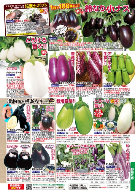 1株で100果以上!ジフィーセブン吸水させるだけで培養土ポットになるから草花・野菜の育苗、挿し芽に最適。そのまま植えられるから、根が傷みません!初期生育肥料入り。pH調整済み。とよ!げるいし揚味油で美F1鈴なりむすめお客様からも「びっくりするぐらいに実った」の声が続々!!葉やガクにトゲがなく、房どりできる小ナス。1株で100果以上も実る豊産性で、株にたくさん実った姿は圧巻です!!肉質緻密な米ナスタイプで大変美味しい。漬物や揚げ浸しなどに抜群で、直径約2.5cm程で収穫し素揚げすれば超絶品!!収穫期間が6〜10月までと長く楽しめます。F1シルクボーイ純白滑らかで光沢があり、ずんぐりとした大きな美白ナス。加熱するととろ〜り柔らかくなり、とろける旨さ!!米ナスのなかでも花数多く、たくさん果実がとれます。トゲが少ない。F1豊産むらさきナスF1とげなし縞なす鮮やかな紫色の果実にエメラルドグリーンのガクのコントラストが美しい米ナス!肉質緻密でクセがなく旨い!!皮も果肉も柔らかく、しかも豊産性の極上品種です。紫と白の対比が印象的なイタリアンタイプの米ナス。見た目と違いクセがなく美味!肉質緻密で、田楽やステーキ、グラタン、ピザなど楽しめます。F1万寿満1袋(0.5ml)果皮は弾力があり、果肉は緻密でナス特有のアクが少ないので、サラダや煮物にも最適。耐暑性に優れトンネルから露地栽培が可能。ヘタも実も鮮やかな緑色。果重250g以上いつもの料理がさらに美しく。F1美味しい水茄子F1豊天若どりから大果まで、様々な用途に応じて収穫でき、揃い良好。みずみずしく柔らかで生食でも美味!薄皮で肉質緻密で歯触りが良い!浅漬が最高に美味しい一口サイズの小ナス。着果数多く、家庭でも栽培しやすい人気の早生品種。白丸茄子F1とろーり旨なす耐暑性があり、露地栽培に適した作りやすい淡緑色の卵形ナス。品質良く、果肉はとっても柔らか!アクやクセが少なく、煮物の他に生食にサラダにもピッタリです。加熱するとねっと〜りした食感に変化!通常の白ナスより果皮が柔らかく、果肉は緻密で高品質。他のナスのように皮から色が出ないので、他の食材への色移りがなく、彩りキレイ!F1新潟黒十全なす泉州水ナスF1鈴なりホワイトF1鈴なりパープル果皮がやわらかで果肉は緻密、多汁で甘味があり、生で食べても非常に美味しい!収穫は卵大が目安。甘味が多く、浅漬は天下一品!大阪・泉州が誇るブランド水ナス。※地域によっては本来の品質特性が出にくいことがあります。草丈が高くならず、ベランダやプランターで育てることができるコンパクトサイズの小ナス!!1株あたり100果も実るので、夏の間は定期的な収穫が楽しめます。熟れると苦味がでるので、卵ぐらいのサイズを目安に収穫すると美味。炒め物や焼きナスなどに!F1長しま君白と紫のストライプ模様が特徴の長ナス。ふわとろの果肉はと〜っても美味しい!草勢強く、豊産性です。