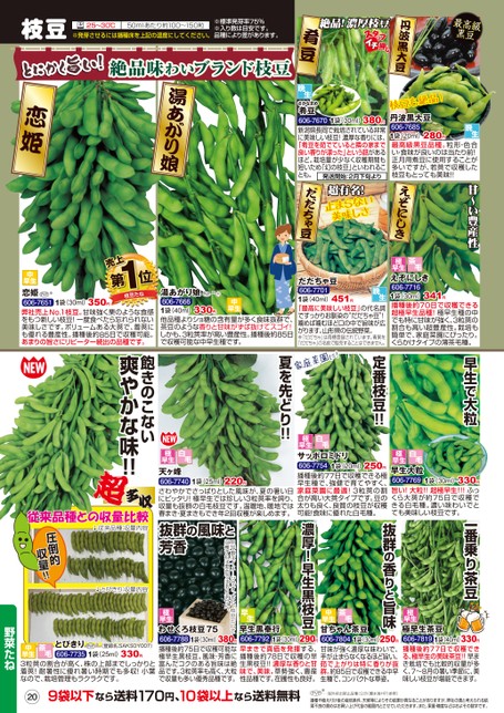 晩生さかなまめ1袋(30ml)肴豆380円606-7670新潟県長岡で栽培されている非常に美味しい枝豆!濃厚な香りには、「肴豆を茹でていると隣の家まで良い香りが漂った」という話があるほど。栽培量が少なく収穫期間も短いため「幻の枝豆」といわれることも。発送開始:2月下旬より枝豆も絶品!晩280円丹波黒大豆606-7685生1袋(20ml)最高級黒豆品種。粒形・色合い・食味が良いのは当たり前!正月用煮豆に使用することが多いですが、若莢で収穫した枝豆もとっても美味!!甘~い豊産性えぞにしき超有名!止まらない美味しさだだちゃ豆丹波黒大豆絶品!濃厚枝豆肴豆絶品味わいブランド枝豆湯あがり娘25〜30℃50mlあたり約100〜150粒※発芽させるには播種床を上記の温度にしてください。※標準発芽率75%※入り数は目安です。品種により差があります。枝豆とにかく旨い!恋姫売上1第位※1袋(30ml)生恋姫606-7651弊社売上No.枝豆。甘味強く栗のような食感をもつ新しい枝豆!一度食べたら忘れられない美味しさです。ボリュームある大莢で、着莢にも優れる豊産性。播種後約85日で収穫可能。あまりの旨さにリピーター続出の品種です。350円枝豆たね中早飽きのこない爽やかな味!!超多収従来品種との収量比較↓従来品種:収量内容↓とびきり:収量内容圧倒的収量!!中R※P330円湯あがり娘606-76661袋(40ml)他品種よりショ糖の含有量が多く食味抜群で、茶豆のような香りと甘味がずば抜けてスゴイ!しかも、3粒莢率が高い豊産性。播種後約85日で収穫可能な中早生種です。早生晩451円だだちゃ豆606-7701生1袋(40ml)「最高に美味しい枝豆」の代名詞ですっかりお馴染の“だだちゃ豆”!噛めば噛むほど口の中で旨味が広がります。山形県の伝統野菜。※「だだちゃ」は商標登録されています。青果を「だだちゃ」の名前で販売することはできません。極茶毛341円早生えぞにしき606-77161袋(30ml)播種後約70日で収穫できる超極早生品種!極早生種の中でも特に甘味が強く、3粒莢の割合も高い超豊産性。栽培も簡単で、家庭菜園にぴったり。くらかけタイプの薄茶毛種。早生で大粒定番枝豆!!!に園菜庭家極白毛1袋(20ml)早生サッポロミドリ250円606-7754播種後約77日で収穫できる極早生種で、強健で育てやすく、家庭菜園に最適!3粒莢の割合が高い大莢タイプです。豆の太りも良く、良質の枝豆が収穫可能!食味に優れた白毛種。極白毛早生早生大粒330円606-7769旨い!大粒!!超極早生!!!ふっくら大莢が約75日で収穫できる白毛種。濃い味わいでとても美味しい枝豆です。1袋(30ml)夏を先どり!!一番乗り茶豆極1袋(40ml)早生極早生茶豆330円606-7819播種後約77日で収穫できる、極早生の美味茶豆!!早まき栽培でも比較的収量が多く、7〜8月の暑い季節に、美味しい枝豆が堪能できます。抜群の香りと旨味中茶毛1袋(30ml)早生甘ちゃん茶豆250円606-7804甘味が強く濃厚な味わいで、手が止まらなくなるほど旨い。茹で上がりは特に香りが抜群。約85日で収穫できる中早生種で、コンパクトな草姿。濃厚!早生黒枝豆極白毛早生天ヶ峰606-7740さわやかでさっぱりとした風味が、夏の暑い日にピッタリ!極早生では珍しい3粒莢率を誇り、収量も抜群の白毛枝豆です。温暖地、暖地では春まき・夏まきもでき年2回収穫が楽しめます。1袋(25ml)220円抜群の風味と芳香※写真はイメージです。また、枝豆として収穫すれば黒色ではありません。209袋以下なら送料170円、10袋以上なら送料無料※…海外持出禁止品種(公示(農水省HP)参照)PVP播種や植え付け後の栽培条件、天候等によりその結果が異なることがありますが、弊社の責と考えられる結果不良の責めはお買い上げ代金の範囲内とさせていただきます。また、果重・糖度などはおよその数字です。早生極早生わせくろ枝豆75380円606-77881袋(30ml)播種後約75日で収穫可能な極早生黒枝豆。風味・芳香に富んだコクのある旨味は絶品です。3粒莢率も高く、大粒で収量も多い優秀品種です。1袋(30ml)早生黒奉行290円606-7792早まきで真価を発揮する、播種後約78日で収穫の早生黒枝豆!!濃厚な香りと甘味で、美味。草勢強く、豊産性品種です。在圃性も良好。とびきり606-7735中茶※(登録名:SAKSOY007)毛1袋(25ml)早生3粒莢の割合が高く、株の上部までしっかりと着莢!耐暑性に優れ暑い時期でも多収!小葉なので、栽培管理もラクラクです。330円野菜たね