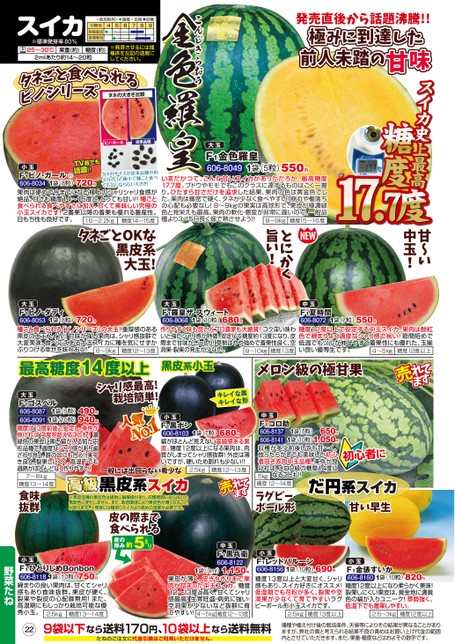 発売直後から話題沸騰!!極みに到達した前人未踏の甘味!TV等でも話題!720円小玉1袋(8粒)タネのサイズが従来品種の約4分の1と極小で種ごと食べても気にならない大きさ!F1ピノ・ガール606-8034果肉は硬めで今までにない極上のシャリシャリ食感が絶品。甘さも糖度14〜15度と、とっても甘い!!種ごと食べられる食べやすさに加え、甘くて美味しい究極の小玉スイカです!2番果以降の着果も優れる豊産性。日もち性も良好です。糖度14〜15度.6〜2.2kg1大玉F1金色羅皇606-80491袋(5粒)550円いまだかつて、こんな甘いスイカがあっただろか。最高糖度17.7度。ブドウやモモでもこのクラスに達するものはごく一握り。ひたすら甘さだけを追求した結果、果肉の色は黄金色でした。果肉は緻密で硬く、タネが少なく食べやすい!崩れや棚落ちの心配も必要なし!8〜9kgの果実は高球形で、果皮が極濃緑色と見栄えも最高。果肉の軟化・悪変が非常に遅いので、一般品種より3〜5日長く畑で熟させよう!!糖度15〜16度8〜9kgこんじきらおう金色羅皇スイカ※標準発芽率80%25〜30℃果重(約)糖度(約)2mlあたり約14〜20粒播種6定植87収穫9<栽培型例>54中間地移植栽培直播栽培※発芽させるには播種床を左記の温度にしてください。タネの大きさ比較ピノ・ガール従来品種甘~い中玉!とにかく旨い!タネごとOKな黒皮系大玉!大玉720円1袋(8粒)F1ピノ・ダディ606-8053種ごと食べられる「ピノシリーズ」の大玉!重厚感のある黒皮の大玉スイカ!!甘味が強い果肉は、シャリ感抜群で大変美味。食べ応えある大玉スイカに種を気にせずかぶりつける幸せを味わおう!!糖度12〜13度8〜9kg最高糖度14度以上シャリ感最高!栽培簡単!大玉680円1袋(10粒)F1羅皇ザ・スウィート606-8068作りやすく味も良いとプロ農家も大絶賛!コク深い味わいと強いシャリ感が特徴。安定して糖度約13度になり、皮際まで甘味がぎっしり!草勢はやや強めで着果性良く、空洞果・裂果の発生が少ない。8〜10kg糖度13度中玉550円1袋(7粒)F1夏時間606-8072糖度12度以上で安定する中玉スイカ。果肉は鮮紅色で締まりよく適度なシャリ感で旨い!節間短めで低温でもツルが伸びやすく着果性にも優れた、玉揃い良い優等生です。糖度12度以上4〜5kg黒皮系小玉メロン級の極甘果キレイな黒キレイな形大玉F1ゴスペル606-8087606-80911袋(5粒)1袋(10粒)490円940円糖度は13度前後で安定し、条件が良ければ14度を超えることも!濃緑色の果皮に黒い縞が入る短だ円形品種で、適度なシャリ感があり歯ざわり良く、誰の口にも合う!!実つき良く、裂果しにくく、高温下でも過熟がほとんどなく作りやすい!7〜8kg糖度13〜14度食味抜群一般には出回らない希少な黒皮系スイカ※黒皮品種の果皮色は緑地に縞模様があり、収穫間際にならないと黒紫色に変化しません。また、栽培環境により果皮色が薄くなることがあります。※発芽には種ありスイカより高めの温度が必要です。皮の際まで食べられる厚み約5ミ皮のリ小玉680円1袋(7粒)F1黒ポン606-8103縞がほとんど見えない高級感ある黒皮。糖度12度以上になる果肉は、肉質がしまってシャリ感抜群!外皮は薄いですが、硬いため割れも少ない!!糖度12〜13度2.5kg1袋(5粒)1袋(10粒)中玉F1コロ助650円606-81371,050円606-8141収穫が多少前後しても甘〜く、放ったらかしでも美味しい初心者向き赤肉中玉品種。条件が良ければ、メロン級の糖度14度になることも!!5kg糖度12〜14度初心者にラグビーボール形だ円系スイカ甘い早生229袋以下なら送料170円、10袋以上なら送料無料たねのご注文に代金引換はご利用いただけません。播種や植え付け後の栽培条件、天候等によりその結果が異なることがありますが、弊社の責と考えられる結果不良の責めはお買い上げ代金の範囲内とさせていただきます。また、果重・糖度などはおよその数字です。中玉F1黒兵衛606-81221袋(3ml)1,150円果皮が薄く、皮ぎりぎりまで果肉が詰まった中玉スイカ。糖度12〜13度と高く、甘くてシャリ感最高!生育旺盛・病気に強い・空洞果が少ないなど抜群に育てやすい!4〜5kg糖度12〜13度小玉690円1袋(10粒)F1レッドバルーン606-8156糖度13度以上と大変甘く、シャリ感もあり、スイカ好きにオススメ!低温期でも花粉が多く、裂果や空洞果が少なくて育てやすいラグビーボール形小玉スイカです。1袋(10粒)小玉F1金俵すいか606-8160糖度12度以上になり柔らかく美味!裂果しにくい果皮は、黄金地に濃黄色の縞が入りユニーク!草勢強く、低温下でも着果しやすい。820円.25kg糖度13度以上.2〜3kg糖度12度以上小玉F1ひとりじめBonbon606-81181袋(10粒)750円締まりの良い果肉は、甘くてシャリ感もあり食味抜群。果皮が硬く、裂果や裂皮の心配御無用!また、高温期にもしっかり栽培可能な優秀小玉。糖度13〜14度2.5kg野菜たね