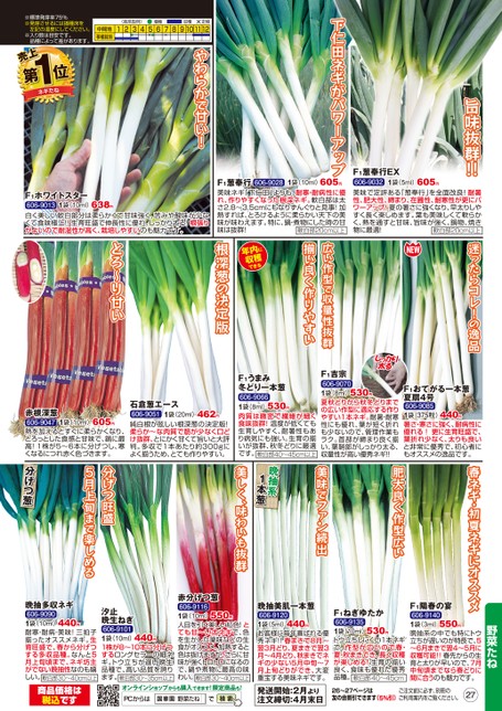 旨味抜群!!605円1袋(5ml)F1葱奉行EX606-9032美味で定評ある「葱奉行」を全面改良!耐暑性、肥大性、締まり、在圃性、耐寒性が更にパワーアップ!夏の暑さに強くなり、早太りしやすく長く楽しめます。葉も美味しくて軟らかく、熱を通すと甘味、旨味が強く、鍋物、焼き物に最適!20cm以上軟白部下仁田ネギがパワーアップ605円606-90281袋(10ml)F1葱奉行美味ネギ「下仁田」よりも、耐寒・耐病性に優れ、作りやすくなった根深ネギ。軟白部は太さ2.8〜3.5cmにもなりずんぐりと見事!加熱すれば、とろけるように柔らかい天下の美味が味わえます。特に、鍋・煮物にした時の甘味は抜群!20cm以上軟白部やわらかで甘い!〈栽培型例〉播種123456789101112収穫×定植××中間地移植栽培※標準発芽率75%※発芽させるには播種床を左記の温度にしてください。※入り数は目安です。品種によって差があります。売上1ネギたね第位1袋(10ml)F1ホワイトスター606-9013白く美しい軟白部分は柔らかくて甘味強く、苦みや酸味が少なくて食味極上!!生育旺盛で伸長性に優れ、しっかり太る!根張りがよいので耐湿性が高く、栽培しやすいのも魅力です。638円広い作型で収量性抜群揃い良く作りやすい年内に収穫できる根深葱の決定版とろ~り甘い晩抽多収ネギ606-90901袋(10ml)440円耐寒・耐病・美味!三拍子揃ったオススメネギ。生育旺盛で、春から分げつする多収品種。なんと5月上旬頃まで、ネギ坊主がでない晩抽性なのも嬉しい。軟白部30〜40cm以上商品価格は税込です赤分げつ葱606-91161袋(10ml)550円人目を引く美しい紅色!とても甘〜い太ネギで、色を生かした薬味などの生食がオススメ。加熱すると色は抜けますが、さらに甘味が強くトロトロになるので、鍋や煮物に最高の味わい。30〜40cm以上汐止晩生ねぎ606-91011袋(10ml)440円1株が8〜10本に分げつするロングセラーの細ネギ。トウ立ちが遅い晩生品種で、高い品質を誇ります。軟白部30〜35cm以上オンラインショップからも購入できます!限定商品も!PCからは野菜たね軟白部晩抽美肌一本葱606-91201袋(5ml)440円お客様に毎年喜ばれる優秀ネギ!!春まきで8月〜翌3月どり、夏まきで翌3月〜4月どり、秋まきでネギの少ない5月中旬〜7月上旬どりができ、大変重宝する美味ネギです。発送開始:2月より注文締切:4月末日F1ねぎゆたか606-91351袋(10ml)530円トウ立ちしにくい1本ネギで、作型が広いので春・夏・秋まきでき、長く収穫が楽しめる!生育の揃い良く、食味も優れた優秀品種。40〜45cm軟白部26〜27ページは友の会割引できます(5%引)ご注文前に必ず、別冊のご利用案内をご覧ください。27迷ったらコレ!の逸品F1おてがる一本葱夏扇4号606-90851袋(375粒)440円暑さ・寒さに強く、耐病性に優れる!更に生育旺盛で、葉折れ少なく、太りも良いと非常に優秀で、初心者にもオススメの逸品です。野菜たね春ネギ・初夏ネギにオススメF1陽春の宴606-91401袋(3ml)550円晩抽系の中でも特にトウ立ちが遅いのが特長で、5〜6月まきで翌4〜5月に収穫可能!!春先からの生育と太りが早いので、7月中旬頃までなら春どりに間に合うのも魅力です。肥大良く作型広い美味でファン続出530円F1うまみ冬どり一本葱606-90661袋(8ml)肉質は緻密で繊維が細く食味抜群!温度が低くても生育しやすく、耐暑性もあり病気にも強い。生育の揃いが抜群、秋冬どりに最適です。軟白部40〜45cm以上しっかり太るF1吉宗606-90701袋(8ml)530円夏秋どりから秋冬どりまでの広い作型に適応する作りやすい1本ネギ。耐暑・耐寒性にも優れ、葉が短く折れも少ないので、管理作業もラク。首部が締まり良く揃い、葉鞘部がしっかり太る、収量性が高い優秀ネギ!!晩抽系晩抽系1本葱1本葱1袋(10ml)赤根深葱606-9047熱を加えるとすぐに柔らかくなり、とろっとした食感と甘味で、鍋に最高!1株が5〜6本に分げつし、寒くなるにつれ赤く色づきます。605円462円1袋(20ml)石倉葱エース606-9051純白根が眩しい根深葱の決定版!柔らか〜な肉質で筋が少なく口どけ抜群、とにかく甘くて旨いと大評判。多収で1本あたり約300gによく揃うため、とても作りやすい。美しく、味わいも抜群分げつ旺盛5月上旬まで楽しめる分げつ葱分げ葱