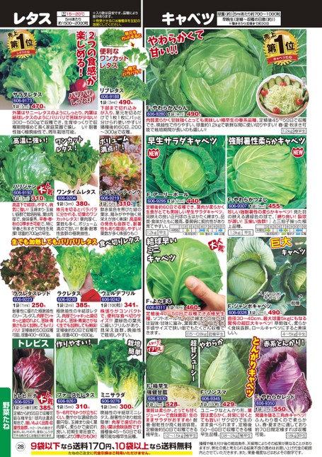 キャベツ球重(約)5mlあたり約700〜1000粒早晩生(定植〜収穫の日数(約))※種まきから定植まで約30日やわらかくて甘い!!売上1第キャベツたね位調理例F1やわらかんらん606-92801袋(4ml)肉質柔らかく甘味強くとっても美味しい極早生の春系品種。定植後45〜50日で収穫でき、晩抽性で作りやすい。球重約1.2kgで新鮮な間に使い切りやすい!春・夏・秋まき可能で栽培期間が長いのも嬉しい!極早生490円.2kg1早生サラダキャベツ強耐暑性柔らかキャベツ440円F1アーリーボール1袋(1ml)606-9295定植後約60日で収穫でき、葉肉が柔らかく生食がとても美味しい早生サラダキャベツ。見映えの良い正円球の玉はかたく締まり、品質・食味がともに最高。萎黄病に抵抗性があり育てやすい。1.2kg早生91011中間地87613452<栽培型例>種まき収穫結球早いミニキャベツ455円F1やわらかつよし606-93071袋(5ml)珍しい強耐暑性の柔らかキャベツ!見た目の映える濃緑色の球で、『締り良い!裂球が遅い!玉揃い抜群!』と三拍子揃った極上品種。19101112.3kg早生中間地345876<栽培型例>種まき収穫巨大キャベツ15〜20℃5mlあたり約1500〜2000粒※入り数は目安です。品種により差があります。※発芽させるには播種床を左記の温度にしてください。便利なワンカットレタス2つの食感が楽しめる!レタス売上1レタスたね第位470円パリパリしっとりサラダレタス606-91731袋(5ml)外葉はサニーレタスのようにしっとり、内葉は結球レタスのようにパリパリで苦味が少ない!300〜500gで収穫でき、生育ゆっくりで収穫期間極めて長く家庭菜園で嬉しい!耐暑性強く極晩抽性で、周年栽培可能。高温に強い!ワンカットレタス!490円リブレタス606-91881袋(3ml)下部まで切れ込みが入り、茎元を切るだけで1枚1枚にパッと分けられ使いやすい!播種後約60日、200〜300gで収穫。ボリューム満点!!310円パリジャン606-91921袋(5ml)高温下で結球しやすく、病気に強い!玉締まり・玉揃い抜群で栽培容易。葉は肉厚で、食味優秀。早春・春・秋の3季まき可能で、特に早春と秋まきで特性を発揮!球重約700gの早生。生でも加熱してもパリパリレタスワンタイムレタス606-92041袋(3ml)株元を切るとバラバラに分かれる、切葉のワンカットレタス!葉肉厚く、葉数も多く、ボリューム満点で旨い!!耐暑・耐寒性抜群の極晩抽性。380円310円レッドハンティング606-92191袋(5ml)鮮赤紫色を帯びた緑の葉は、縮みがやや強く見栄えが良く美味!高温期の発色も抜群で、耐暑性もあり栽培しやすい!葉数が多く株張りも◎食べ切りレタス250円ラクレタスレッド606-92231袋(1ml)耐暑性に優れた極晩抽性のリーフレタス。肉厚でシャキッと歯切れよく、苦味・青臭さもなく加熱してもパリパリ!定植後約50日収穫可能。球重400〜600g。トレビス385円ラクレタス606-92381袋(2ml)極晩抽性の半結球レタス。肉厚でシャキッと歯切れよく、苦味・青臭さがなく生でも加熱しても美味!定植後約50日で収穫可能。球重400〜600g。作りやすい!341円ヴェルデフリル606-92421袋(100粒)株張りがコンパクトで、便利な食べ切りサイズ!!濃緑色の葉先に細いフリルがあり、見栄え抜群。晩抽性で栽培しやすい。栽培簡単460円1袋(4ml)F1よかまる606-9311定植後40〜50日で収穫できる極早生種。ソフトボールサイズで締まりの良い球は旨味・甘味に富み、葉質柔らかく旨い!お手頃サイズで狭い畑でもたくさん収穫できます。0.5〜0.kg超極早生ジャンボキャベツ一般種490円1袋(2ml)F1ジャンボキャベツ606-9326直径30〜40cm、最大球重5kgにもなる驚愕の超巨大キャベツ!草勢強く、柔らかく食味抜群。ロールキャベツにすると美味しい。4〜5kg中生赤系とんがり!とんがりキャベツやわらか超甘ジューシー289袋以下なら送料170円、10袋以上なら送料無料たねのご注文に代金引換はご利用いただけません。播種や植え付け後の栽培条件、天候等によりその結果が異なることがありますが、弊社の責と考えられる結果不良の責めはお買い上げ代金の範囲内とさせていただきます。また、果重・糖度などはおよその数字です。528円F1極早生強健甘藍606-93301袋(2ml)葉質は柔らか、とっても甘くジューシーで食味最高!生のままサラダがおすすめ!耐暑・耐乾性が高く栽培容易。定植後約50日で収穫できる極早生。1.2〜1.5kg極早生F1ソンスマ429円606-93451袋(100粒)ユニークなとんがり形。葉質は柔らかく、非常に甘くとても旨い!ザク切りで生のまま食べられます。定植後50〜60日で収穫できる極早生品種。0.〜2kg極早生F1やわらかレッド550円606-93501袋(2ml)常識を破る三角赤キャベツ!ふんわり巻くので柔らかい。春・夏まきに適しており約70日間定植すれば収穫可能。1.8kg中生310円ファーストレタス606-92611袋(5ml)5〜6月でもトウが立ちにくい。艶やかな濃緑色の豊円型。玉締まり良く葉肉厚く、柔らかで歯切れ良い。初期生育旺盛で、地域により3季どりもOK!300円ミニサラダ606-92761袋(3ml)晩抽性の半結球ミニレタス。耐暑性があり栽培簡単!肉厚で歯切れの良い葉は食味抜群です!播種後45〜50日で収穫可能な極早生品種。トレビーナ606-9257385円1袋(コート種子30粒)定植から約55日で