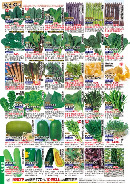 甘味強い濃い紫!!甘味強い濃い紫!※茹でると緑色になります。高温期の栽培向き高温期の栽培向きクセなし!!クセなし!!小松菜418円F1夏の甲子園606-98201袋(8ml)高温期もじっくり生育し、多収で環境変動に強い。極濃緑色でおひたしにぴったり。ジャムやジやお菓子にお菓子に食用ホオズキ※キャンディーランタン606-98531袋(14粒)完熟果の香りはまるでマンゴーのよう。着果性に優れ、節成りで多収性。509円太茎!!茎!!話題騒然!!話題騒然!!育てやすい!!育てやすい!耐寒・耐暑性抜群耐寒耐暑抜群紫が濃い!!紫が濃い!!※茹でると緑色になります。美味新野菜!美味野菜!!!暑さに強い!!さに!!歯切れよくサラダに歯切くラダ強健で大葉肉厚!!強健大葉厚!!肉厚!!肉厚!!風味豊か!!味豊果形の揃いが抜群!!果形揃が群!!葉もの他※法蓮草のべと病レースとは、べと病の「病原菌の系統」のことです。多くのレースに抵抗性を持つ品種ほど病気にかかりにくいことを示し、抵抗性を持たないレースにはかかる場合があります。法蓮草法蓮草420円春まきこくうまほうれん草606-96051袋(50ml)食味良く、ボリューム満点な濃緑の大葉!!とう立ちしにくく、春〜夏まき可能。耐病性あり栽培容易。べと病レース1〜5抵抗性390円F₁グリーンスワロー606-96101袋(40ml)春から夏播きに適し、生育早く濃緑の広葉でとう立ちも遅く、高温期の栽培でも作り易い。べと病レース1〜7抵抗性法蓮草F1うまくろホウレンソウ606-96241袋(30ml)草姿は立性で、株張り・揃い優秀。大葉で肉厚の極濃緑葉で、耐暑・耐寒性も優秀。べと病レース1〜7抵抗性250円アスパラガス恋むらさき816-86261袋(20粒)濃い紫色で収量性の良い、全雄系の高品質アスパラガスです。発送開始:2月中旬より1,925円アスパラガスウェルカムアスパラ606-97841袋(0.5ml)太茎の鮮緑色アスパラガス。病気に強く揃いよく、ご家庭でたくさん穫れる優秀品種です。440円アスパラガスパープルタワー606-97991袋(10粒)鮮やかな紫アスパラガス。グリーン種より甘味も強く太く柔らかで食味良い。530円耐病性抜群耐病抜群人気の赤茎気の赤茎収穫簡単収穫単甘味・旨味◎味・味ツルムラサキツルムラサキ紫茎606-96811袋(4ml)茹でるとぬめりが出るのが特徴。このぬめり成分で夏バテ対策に!275円430円アスパラッチェ606-98341袋(2ml)茎葉と花蕾を摘んで収穫。一度摘んだ後も何度か収穫可能!花茎は太く柔らかく、クセがなく食味優秀。食用ホオズキスイートほおずき606-98491袋(20粒)食用ほおずき。糖度13〜15度と甘く生食にも!栄養価が高く、栽培も容易。420円花菜の仲間栄養豊富!!栄養富!!ビタミンAビタミンAミネラル豊富ミネラル豊富肉厚美味!!厚美!サラダに!!サラダに!!法蓮草法蓮草F1赤茎ほうれん草606-96431袋(50ml)柔らかくアクが少ないので生食可能!作りやすく、若苗での収穫なら周年栽培も可能。べと病レース1〜4抵抗性420円F1夏味サラダほうれんそう606-96581袋(50ml)葉肉は厚く柔らかくアクが少ないので、生食に最適。春〜夏まきに適した品種。べと病レース1〜9抵抗性420円小松菜420円F1サラダ小松菜606-98001袋(10ml)アクが少なく、サラダでも小松菜とは思えない美味しさ!お浸し・煮物に最高。生育が速い。小松菜F1ちぢみコマツナ606-98151袋(10ml)肉厚で柔らかくとても甘いと大好評!葉色は大変濃く光沢があり収穫性抜群!315円焼肉に!!焼肉に!スイスチャードスイスチャードMIX606-96771袋(4ml)茎の軸が赤・白・黄。暑い時期も収穫できる。360円法蓮草F1寒ちぢみほうれん草606-96391袋(20ml)寒さに当たると甘味がアップし、糖度は従来品種の2倍!!縮れ葉は肉厚。245円栽培容易!!栽培易!!ゴボウ360円てがる牛蒡606-96621袋(5ml)根長35〜40cmなので容易に栽培可能。白肌で香り・食味良く、家庭菜園に最適の短形ゴボウです。辛味辛味爽やか!!爽やか!!わさび菜わさび菜606-96961袋(6ml)330円爽やかな辛味で大人気!葉は縮緬状に縮み、柔らかい。サラダ・お浸し・漬物など用途多彩。包菜青チマサンチュ606-97081袋(5ml)韓国では焼肉の必須食材。下から葉をかき取るので長期収穫が可能です!231円エゴマ350円エゴマ黒種606-97121袋(10ml)独特の風味が食欲をそそります。焼肉に巻いたり、サラダや天ぷらにしても美味。チンゲンサイエンサイF1夏仙緑606-98681袋(8ml)耐暑性・耐病性に優れる夏まき専用チンゲンサイ。肉厚で食べ応え満点!420円つるなしエンサイ606-98721袋(10ml)味にクセがない。暑さに強く、つるなしタイプで育てやすい。320円エンサイ320円なつサラダ606-98871袋(10ml)暑さに強いエンサイ。若採りして7cm位残せば、その後新芽を数回収穫可能です!270円人気!人気!ブロッコリースプラウト606-99221袋(50ml)606-993710袋いつでも手軽に栽培可能!栄養豊富なサラダに。2,200円パパイヤ550円ハワイオウロ606-99561袋(10粒)果実のクボミが少なく揃いが良い。耐病性があります。果重約550g・果長約15cm、フルーツ向き品種。セロリニラF₁ミツバリアン606-99031袋(約250粒)繊維柔らかく食べやすい!生育旺盛で脇芽が少なく、多粒まきでたくさん採れます。330円タフボーイ606-99181袋(8ml)再生力早く、収穫のサイクル短く収量高い!