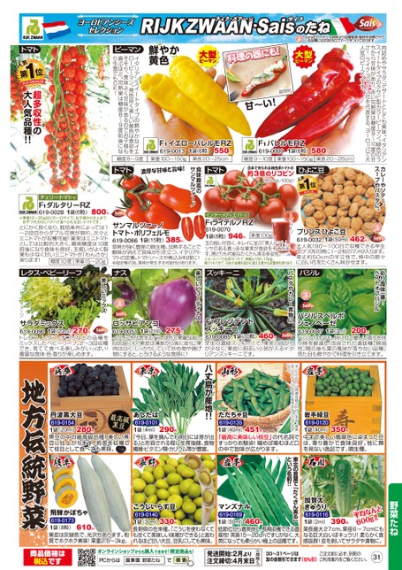 肉詰めやサラダ、デザートとしても美味。イタリアンスイートタイプのクサビ型カラーピーマン。緑色のう0度の甘ちから甘味があり、赤い完熟果は糖度9〜1さ!ライク・ズワーン社を代表する、ヨーロッパで大人気のピーマンです。カレーやソテー、スープやパスタに。彩り風味一番!ベストオブバジルSais社がイタリア政府より品種管理・維持を依頼されている品種には右記のロゴマークをつけております。鮮やか黄色料理の器にも!調理例甘〜い!ズッキーニバジルプリンスひよこ豆1袋(50ml)619-0032大人気!90〜100日で収穫できる早生で、ナス形の莢に1〜2粒のマメが入ります。草丈約50cmの半立性で、株中の節々に白い花をたくさん咲かせます。462円イメージ946円F1ライテルノRZ619-00701袋(8粒)玉の揃いが良く、キレイに並ぶ「美人トマト」。ツヤのある真っ赤な果実が食欲をそそります。房どりも可能なたくさん実る多収性。※ヨーロッパで主流のトマトで、果重は100〜150g。房どりもできて、日本の品種を遥かに超える豊かな収量性を誇ります。果重100gインターメディエイト※サンマルツァーノトマト・ポリフェルモ619-0066草勢が強く豊産の晩生種。加熱することで酸味が消えて旨味が引き立つ、イタリアトマトの定番。トマトソースや煮込み料理に!※固定種の為、異株が発生する可能性があります。1袋(15粒)385円F1イエローパレルモRZ550円619-00131袋(6粒)果重100〜150g果長20〜25cmF1パレルモRZ1袋(6粒)619-0009580円糖度9〜10度果重100〜150g果長20〜25cmひよこ豆人気1SAIS人気第位日本で作られる桃色系トマトの約3倍のリコピン(9.5mg/100g)トマト食味最高のサンマルツァーノトマト濃厚な甘味と旨味!パスタやカレー煮物に美しいビューティナス岩手緑豆619-01201袋(40ml)中まで美しい翡翠色に染まった豆は、香り豊かで食味良好。他に類を見ない逸品です。晩生種。350円※「だだちゃ」は商標登録されています。青果を「だだちゃ」の名前で販売することはできません。だだちゃ豆619-01351袋(40ml)「最高に美味しい枝豆」の代名詞ですっかりお馴染!噛めば噛むほど口の中で旨味が広がります。451円野菜たね加賀太きゅうり619-01161袋(2ml)果長最大27cm、果径6〜7cmにもなる巨大白いぼキュウリ!柔らかく食感抜群!皮を剥いてサラダや漬物に。ん均平600g!390円なと!東北の言葉で「たくさん実る」という名前!!マンズナル619-01691袋(50ml)低節位から着莢良く、長期収穫できる豊産性!莢長15〜20cmですじがなく、大莢になっても柔らかい極上の品種です。460円八丈島が産地!!あしたば619-01011袋(4ml)「今日、葉を摘んでも明日には芽が出る」と形容される程に生育強健。食物繊維・ビタミン類・カリウム等が豊富。290円丹波黒大豆619-01541袋(20ml)黒豆の中の最高級品種!美しい煮豆に仕上がります。若莢を収穫して枝豆として食べても美味。280円飛騨かぼちゃ619-01731袋(8粒)果皮は灰緑色で、光沢があります。粉質でホクホク美味!果重2.5〜3kg。610円こうじいらず豆619-01401袋(30ml)長野県の在来種。「こうじを使わなくても甘くて美味しい味噌ができる」と言われるほど甘い大豆。豆乳にしても美味。330円30〜31ページは友の会割引できます(5%引)ご注文前に必ず、別冊のご利用案内をご覧ください。31(一部除く)発送開始:2月より注文締切:4月末日オンラインショップからも購入できます!限定商品も!PCからは野菜たね商品価格は税込です1袋(20ml)サラダミックス619-0090トレビス、レタス、チコリなどの品種をミックスしたベビーリーフ。2〜3回収穫でき、育てて食べる楽しみがいっぱい!豊富な食味・色・香りが楽しめます。270円ロッサビアンコ1袋(1ml)619-0051イタリアを代表するナス。球形で果重500〜600gにも!果皮は薄紫から紫に変化。果肉は白く、しっかりしていて炒め物や揚げ物にすると、とろけるような食感に!275円F1プレジデントズッキーニ619-0085早生の濃緑ズッキーニで、果実の曲がりが少なく、果皮に明るい小斑が入るイタリアンズッキーニです。1袋(10粒)460円バジルスペルボジェノベーゼ619-0047バジルの中でも、特に甘く優しい香りを持つ株を厳選し、改良された選抜種。晩抽性。開花後も葉の風味が落ちない品種。見た目も鮮やかで料理を引き立てます。200円1袋(3ml)ピーマンイタリアンスイートタイプの鮮やかなイエローピーマン。発色良く美しい黄色は食欲をそそり、食味よく甘味があるのでお子様も喜ぶほど。完熟果は糖度8〜9度前後になり生食でもOK!糖度8〜9度トマト人気1第位RIJKZWAAN人気超多収性の大人気品種!!チェリートマト※F1ダルタリーRZ619-00281袋(6粒)800円※果重15〜20gほどの一口サイズ。お子様から大人まで、おやつ代わりにパクパク食べられる甘いトマトです。とにかく良くなり、栽培条件によっては1〜2段目からダブル花房が現れ、次々とミニトマトが収穫可能!果実はミニトマトとしては比較的大きく、最高糖度は10度前後になり食味も良好。玉揃いがよく裂果も少なく甘いミニトマトが「わんさか」実ります!果重15〜20g糖度10度レタス・ベビーリーフナス美しいミックスイメージ