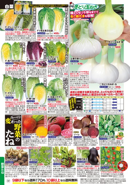 冬どり玉ねぎ種からセット球を育てて種からセット球を育てて冬に新たまを収穫!冬に新たまを収穫!※お届けするのは種子になります。冬どり玉ねぎ黄619-02951袋(5ml)605円立春の香り619-03071袋(2ml)530円葉質やわらか品質抜群質やわ抜群ビタミンA高含有ビタミンA高含有冬どり玉ねぎ白619-03111袋(3ml)550円※白は特に分球しやすいです。真冬に収穫する新玉ねぎは、とっても甘くて美味!!真冬に収穫する新玉っても甘くて鍋の季節に美味しい葉玉ねぎも食べられ一石二鳥!鍋に美味し葉玉ねぎも食べられ一石二鳥!12立春の香りはやや甲高の扁平で、美しいツヤのある白玉ねぎ!辛味がなくサラダなど、生で食べても美味で、煮物にすれば柔らかくて甘〜く旨い!セット球栽培では分球しやすいですが、分球した球でも十分な大きさになるのも魅力!白芯で繊維少なく白芯で繊維少なく食べやすい食い極小トマト生牡蠣風味調理例中まで赤い462円1袋(15粒)オイスターリーフ619-0350生牡蠣のような味の一度食べたら忘れられない新高級野菜!サラダや付け合わせにおすすめ!超マイクロトマト619-04001袋(10粒)デラウェアみたいな驚きの小粒!サラダの飾りつけなどに大活躍!甘酸適和で美味!果径7〜10mm396円495円究極の茄子619-03981袋(15粒)肉質緻密で歯切れ良く、美味すぎると人気を博す極旨ナス。漬物や焼き、煮物など様々な料理に合います。最高直径14cmにもなるドデカい大円型!倒伏しにくく栽培簡単。果重180〜350g究極の旨さ↑ミニ白菜播種や植え付け後の栽培条件、天候等によりその結果が異なることがありますが、弊社の責と考えられる結果不良の責めはお買い上げ代金の範囲内とさせていただきます。また、果重・糖度などはおよその数字です。〈栽培型例〉播種セット球収穫乾燥・貯蔵×セット球定植収穫※詳しい作り方は商品に付属の説明書をご覧ください。※寒冷高地では生育不良になります。白菜芯色の比較!!【春植えハクサイ共通】抽苔は生育時の低温(3〜13℃)が原因です。トンネル栽培を行い低温にあわせない栽培をオススメします。605円1袋(150粒)F1オレンジクイン619-0219シスリコピンを含有し、動脈硬化の予防やお肌の美白に一役買ってくれるとか!内部はカロテンを含む鮮橙系色で、生食できるほど青臭みが少なく歯切れ抜群。どんなお料理でもオススメ!!球重2.5kg中早生F1早生黄芯白菜619-0223播種後約65日で収穫できる早生品種。葉質がやわらかく、味・品質ともに抜群の黄芯系白菜!根こぶ病に強い。早生球重2.5〜3.kg1袋(3ml)455円栄養強化野菜!栄養強化野菜!F1オレンジクイン黄芯白菜420円F1食べ切り大臣619-0238お手頃サイズ!!1袋(3ml)少人数の家庭でも食べ切れるミニサイズ!甘味に富み、極早生系の中でもずば抜けた食味を誇る逸品です。球重1.5kg極早生調理例550円F1春紫白菜619-02421袋(50粒)サラダ・浅漬に!アントシアニン豊富で外葉から発色良好!抜群の食味・彩りを兼ね備えた優秀紫白菜です。球重1.5〜2kg早生500円F1オレンジミニ白菜619-02571袋(3ml)βカロテンを多く含み、切り口を日に当てると鮮やかなオレンジ色に変化する個性派白菜!色ぬけが遅く、長期収穫が可能。晩抽性強い。球重1〜1.5kg極早生大人気の紫白菜大人気の紫白菜晩抽性抽収穫まで収穫まで早い早いお好みサイズで好サズで収穫可能穫能渦巻き状の模様※気温の高い時期や個体によっては赤の模様が薄い場合があります。最速で収穫できる「最速の作型」330円F1丸味ハクサイ619-02801袋(3ml)耐暑性がある丸型のかわいい結球白菜!サラダや浅漬に向く食感です。7月上旬まきで早ければ9月上旬頃から収穫できます。球重1.5kg極早生ミネラル豊富420円F1春っ娘619-02761袋(3ml)抜群の肥大性で、低温結球性・晩抽性優秀!美しい濃い黄芯は柔らかくとっても美味しい。球重2.5〜3kg早生ビーツビーツ1袋(70粒)オレンジビーツ619-0326鮮やかなオレンジ色ビーツ。ミネラル豊富で栄養価も高く、柔らかで青臭さもなくサラダやバター炒めなどで美味しい。320円1袋(70粒)ゴルゴ619-0330断面が紅白の年輪のような渦巻模様になり、サラダやピクルスに!ゴルフボールサイズで収穫し、ほんのりした甘味で葉まで美味しい!!320円1袋(70粒)ソーレ619-0345葉柄や中まで濃赤紫色のビーツ。やわらかい肉質と甘みが特長で、酢漬けやサラダ以外に、ボルシチなど煮込み料理の具にしても美味!320円話題のスーパーフード330円F1タイニーシュシュ619-02611袋(1ml)結球始めから1.2kgほどのミニ白菜まで色々なサイズで収穫可能!耐暑、耐雨性抜群で生理障害に強く育てやすい。浅漬や鍋、生食も美味!球重200g〜1.2kg極早生ちょっぴり変わった野菜のたね935円インカナッツ619-03641袋(10粒)オメガ3脂肪酸やビタミンE、DHAなどを多く含有するスーパーフードとして話題!「インカのピーナッツ」とも呼ばれ現地では炒ったりスープなどで食されています。330円モリンガ619-03791袋(10粒)「奇跡の樹」といわれ、非常に高栄養価なスーパーフードとして話題!葉を乾燥させお茶や粉末にしたり、未成熟の莢を煮たり、成熟した種子をローストしたりと、食べ方も様