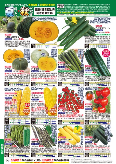 美味強健味も最高グルメキュウリ極立性で収穫しやすい夏秋キュウリの代表!!極旨&鈴なり豊産性調理例生でサラダに時期をずらし、播種することで旬をずらし、通常の収穫が終わった後にも収穫で抑制栽培きる栽培方法です。長い期間収穫を楽しむことができ、お隣の畑との差別化も!って何?後半の作型では収穫までに通常より日数が必要です。また、多肥栽培は徒長の原因になりますので、元肥は一般露地栽培の半分以下にとどめ、生育に合わせて追肥するとよいでしょう。生育後半は台風シーズンと重なるため、倒伏防止など台風対策が必要です。※九州〜関東の高冷地、東北、北海道では抑制栽培はできません。〈栽培型例〉播種収穫マルチを使用し、雨よけ、加温(施設栽培)した場合の収穫露地抑制栽培向き野菜たねに収穫蒔いてまき時期をずらすことで、長期収穫&収穫期の差別化作りやすく品質安定!!栽培が簡単で多収&病気に強いキュウリF1枝なりクイーン619-08341袋(15粒)500円べと病・褐斑病・うどんこ病に強い23456789101112地域中間地・暖地23456地域中間地・暖地栽培簡単で春〜秋まで収穫可能。高温・乾燥・芯焼けに強く実は形も良く多収。べと病・褐斑病・うどんこ病に強く育てやすい!果長20〜21cm712101189カボチャ550円F1秋どりカボチャ619-08001袋(5ml)抑制栽培でも、雌花が安定着花し果実肥大性が高い!果肉は濃黄色で、ホクホク感がとっても強く美味しいカボチャです。貯蔵性も優秀!果重2kgカボチャカボチャ550円1袋(10粒)F1マロン7619-0815栗のようにホクホク美味しいミニカボチャ。ミニでは最上級の甘さで、糖度約15.5度!!草勢強く放任栽培も可能。交配後約45日で収穫できる早生種です。果重500〜600g12711103245689440円1袋(8粒)F1雪化粧619-0820開花後50〜55日で粉質度が最高潮に達します。貯蔵性もよく3か月たってもおいしく食べられます。ホクホクの食感と甘味は、他を圧倒するおいしさです。果重2.1〜2.4kg12710113924568地域中間地・暖地地域中間地・暖地極甘バイカラー巨大コーンキュウリF1VR夏すずみ619-08491袋(13粒)638円うどんこ病・べと病・ウイルス病(ZYMV)耐病性つるもちが良く栽培後半まで秀品率が高い!べと病、うどんこ病、ウイルス病(ZYMV)に中程度の耐病性があり、大変作りやすい長期収穫に向いたキュウリです。果長20〜22cm12710113245689地域中間地・暖地キュウリF1味まっしぐら619-08531袋(2ml)580円べと病・褐斑病・うどんこ病に強い耐病性はトップクラス。なおかつ歯触り良く、食味極上!さらに、曲がり果や尻太り果が少なく、品質良く多収。果長20〜22cm12810113245679地域中間地・暖地中玉の傑作抜群の貯蔵性超豊産性&高糖度スーパースイート系コーンF1スーパースイートビッグ619-0872850円1袋(40ml)先端まで粒が詰まりやすく、食べ応え満点!!糖度約20度にまで達する極甘巨大コーン。粒皮は薄く柔らかで食味極上!88日(中晩生)最高糖度ミニトマト最高糖度皮付重春まき:450g、夏まき:400g皮付重春まき:500g、夏まき:400g34567891011地域中間地暖地地域中間地暖地234567891011740円F1こくうまチェリー619-08871袋(30粒)すごい甘さと絶妙な酸味で、コクと旨味がたっぷりの濃厚な味わい!病気に強く育てやすい、豊産性!!果重20g12101132456789地域中間地・暖地中玉トマト595円F1けっさく619-08911袋(15粒)露地栽培で平均8度に。甘酸のバランスが絶妙でコクもあり、糖度以上に旨味がが感じられる。1房に8〜12個も着果する豊産性で作りやすい!果重30〜40g12810113245679地域中間地・暖地スーパースイート系コーンF1スターダスト619-0868690円1袋(50ml)最高糖度22度にもなる極甘トウモロコシ。穂先まで実詰まりよく秀品率が高い。皮付き重約450gにも!濃厚な甘さがクセになる。86日(中早生)極上のやわらかさズッキーニズッキーニ9袋以下なら送料170円、10袋以上なら送料無料たねのご注文に代金引換はご利用いただけません。※…海外持出禁止品種(公示(農水省HP)参照)PVP播種や植え付け後の栽培条件、天候等によりその結果が異なることがありますが、弊社の責と考えられる結果不良の責めはお買い上げ代金の範囲内とさせていただきます。また、果重・糖度などはおよその数字です。インゲンうまっこインゲン619-09031袋(30ml)美しい濃緑色で曲がりが少なく揃い抜群!!柔らかくて旨味が濃く、つるなしの中では比較的長期間収穫可能です。300円インゲン霜降りささげ619-09181袋(30ml)霜の季節まで収穫できる美味インゲン。鮮緑色の平莢種で、紫色の縞模様は火を通すと緑色に。すじが少なくやわらかい!290円3456789101134567891011地域中間地・暖地360円F1ゼルダ・ジャッロ619-09221袋(10粒)葉柄にトゲが少ない為管理がしやすく、ウイルス病にも強い。生のまま薄くスライスしてサラダや、炒め物、煮物にも!開花から収穫まで3〜4日果長18〜20cm地域125中間地・暖地10113246789440円F1ラクグリーン619-09371袋(10粒)極濃緑色果は、揃い・秀品性も上々!!ZYMV(ズッキーニモザイクウイルス)耐病性があり、管理しやすい極立性です。果長18〜20cm地域中間地・暖地開花から収穫まで3〜4日12510113246789野菜たね地域中間地・
