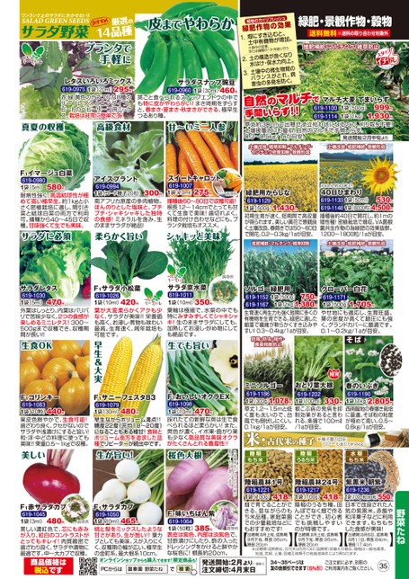 緑肥・景観作物・穀物送料無料※送料の取り合わせ対象外堆肥補給・マルチング・雑草防止1.植物の力でリフレッシュ緑肥作物の効果畑にすき込むと、土中有機物が増加。※後作の定植、または播種の1か月前に行う土の構造が良くなり水はけ・保水力向上。土壌中の微生物間のバランスがとれ、病害虫の多発を防ぐ。3.2.自然のマルチでてまいらず!!マルチ大麦てまいらず999円1,930円草丈約30cmで出穂せず立枯れ状になるので、刈り取り不要!土壌被覆力にも優れ、自然のマルチで手間いらず。.03〜0.5kg/1aが目安。1袋(500g)1袋(1kg)619-1100619-1114発送開始:2月中旬より土壌改良・雑草抑制・マルチング・センチュウ密度抑制・景観形成土壌改良・堆肥補給・景観形成緑肥用からしな619-11291袋(500g)初期生育が速く、短期間で高収量が得られます。美しい黄花で景観良く土壌改良。春蒔きでは50〜60日で開花。0.2〜0.kg/1aが目安。1,430円※50mlで約300粒入り1袋(50ml)1袋(6000粒)40日ひまわり530円619-11334,500円619-1148播種後約40日で開花し、約1mの矮性種!密植栽培で増収。VA菌根菌共生作物の為緑肥の効果抜群。1200〜1800粒/1aが目安。堆肥補給・マルチング・雑草抑制土壌改良・堆肥補給・景観形成皮までやわらか619-0960サラダスナップ豌豆460円莢ごと食べられるスナップエンドウの中でも特に皮がやわらかい!まき時期をずらすと、春まき・夏まき・秋まきができる、極早生つるあり種。1袋(30ml)プランタで手軽に1袋(20ml)レタスいろいろミックス295円619-0975赤・緑・黄色のカラフルな8種のリーフレタスとエンダイブ、ビートのベビーリーフ用ミックス。栽培は非常に簡単です!イメージ真夏の収穫高級食材甘〜いミニ人参F1イマージュ白菜580円619-09801袋(5ml)耐病性強く、高温結球性が極めて高い極早生。約1kgと小さく密植栽培に適し、間引き菜と結球白菜の両方で利用可。播種から40〜45日で収穫。甘味強くて生でも美味。アイスプラント619-09941袋(コート種子20粒)300円南アフリカ原産の多肉植物。ほんのりとした塩味と、プチプチ・シャキシャキした独特の食感!ミネラルを含み、生のままサラダが絶品!275円スイートキャロット619-10071袋(10ml)播種後60〜80日で収穫可能!根長12〜14cmでとっても甘くて生食で美味!歯切れよく、料理の付け合わせなどにも。プランタ栽培もオススメ。調理例サラダに必須柔らかく旨いシャキッと美味ミニソルゴー619-11861,078円1袋(300g)草丈1.2〜1.5mと低く茎も太いので、台風でも倒伏しにくい。.01kg/1aが目安。おとり葉大根619-1202330円1袋(100ml)根こぶ病の発病を抑制効果があると言われる。条播で100mℓ/1aが目安。※PVP春のいぶき619-11902,805円1袋(1kg)西南暖地の春播き栽培に最適。そば粉の粘度が極めて高い。0.5〜.06kg/1aが目安。米・古代米の種子※種子量の目安:10アールあたり約4kg陸稲もち米陸稲うるち米水稲もち米野菜たね】陸稲農林1号619-12211袋(100g)418円畑で育てることができる、昔ながらのもち米品種。家庭菜園での少量栽培などにもおすすめです!出穂期:8月上旬、成熟期:9月下旬、稈長:95cm、穂長:20cm陸稲農林24号619-12171袋(100g)418円陸稲のうるち種。田んぼでなく畑で作ることができ、初心者でも挑戦しやすいのが特徴です。出穂期:8月上旬、成熟期:9月下旬、稈長:95cm、穂長:20cm紫黒米朝紫619-12361袋(100g・約3,800粒)550円日本で改良された人気の紫黒米。赤飯や和洋菓子などに利用できます。もちもちした食感が美味!出穂期:8月6日、成熟期:9月11日、稈長:84cm、穂長:17.cm【】【】※出穂期・成熟期は、古代米は5月10日(滋賀県)田植えの場合。陸稲は一般地基準。地域、気候、土壌、田植え時期その他栽培条件により異なります。調理例350円サラダ京水菜619-10111袋(10ml)葉軸は極細で、水菜の中でも特にみずみずしくてシャキシャキ!生のままサラダにしても、加熱してお浸し・炒め物にしても絶品です。生でも旨い1袋(500g)1袋(1kg)ソルゴー緑肥用750円619-11521,380円619-1167生育速く再生力も強く短期に多くの有機物を生育できる。緑肥に適した細茎で繊維が軟らかくすき込みやすい!0.3〜0.4kg/1aが目安。1,705円クローバー白花619-11711袋(500g)やせ地にも適応し、生育旺盛。葉の密度が高くて踏圧にも強く、グランドカバーに最適です。.01〜0.2kg/1aが目安。防風・防虫・間作・農薬飛散防止そばオンラインショップからも購入できます!限定商品も!PCからは野菜たね発送開始:2月より(一部除く)注文締切:4月末日34〜35ページは友の会割引できます(5%引)ご注文前に必ず、別冊のご利用案内をご覧ください。35F1サニーフェスタ83480円619-10791袋(30ml)早生ながらボリューム満点!!糖度22度(平均18〜20度)になることもある極甘!食味とボリューム両方を追求した品種でリピーターが続出中です。470円F1おいしいオクラEX619-10981袋(10ml)採れたての新鮮な莢は生で食べられるほど柔らかい!また、莢色が濃く、イボ果・曲がり果も少なく高品質な美味オクラがたくさんとれる豊産性!!※品種特性として白い大根が数パーセント混じります。美しい生が旨い!桜色大根F1赤サラダカブ調理例480円619-10451袋(3ml)美し