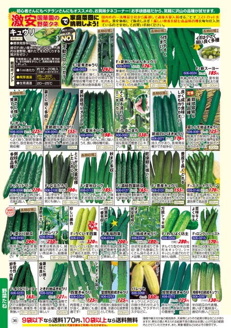 初心者さんにもベテランさんにもオススメの、お買得タネコーナー!お手頃価格だから、気軽に沢山の品種が試せます。で激安キュウリ昨年人気昨人気長期収穫可能F1ホーム節成キュウリ606-0039(1ml)225円肩張り良く、尻尖り少なくよく揃う。耐病・耐暑性があり、放任栽培でも長期収穫!21〜23cm夏節成りキュウリ606-0043(2ml)155円早生の豊産種で、草勢強く栽培簡単!歯切れ良い食感で生食、漬物に最適です。20cmF1夏秋キング606-0058(1ml)198円べと病・うどんこ病に強いうえ、長い間収穫可能。21〜22cmF1なるこまち606-0062(5粒)330円主枝・側枝ともに完全節成&房成の豊産ミニキュウリ!7〜8cm節成白いぼきゅうり606-0077(1ml)176円持久力があり、長期間収穫ができ超多収!22cm霜しらず地這きゅうり606-0081(2ml)125円耐暑性と耐病性に優れた地這い用品種。強勢で作りやすく、美味しさ満点で大人気!20cm(0.8ml)220円F1グッドワン606-0096うどんこ病・べと病に強く、耐暑性も抜群!側枝多く雌花率も高い。21〜22cmF1なるたろう606-0108(5粒)300円「超」多収キュウリ!パリッと食感が最高に美味で病気にも強い。15〜18cmF1夏秋ロング606-0112(0.8ml)185円うどんこ病・べと病に強く、肉質よく苦味なく、美味。28cmF1濃緑四葉胡瓜606-0127(1ml)165円着果性抜群!耐暑性があり草勢強く、収量安定。27〜28cmF1豊産キュウリ606-0131(1ml)155円播種期が長く楽しめる!側枝もよく出る豊産性。立作り・地這いでも作れます。28cmF1スマートグリーン606-0146(1ml)170円豊産で主枝・側枝にもよくなります。光沢があり、濃色果で高品質!22cmF1夏どり胡瓜606-0150(1ml)240円草勢強く家庭菜園向き。べと病・うどんこ病に強く育てやすい!21〜22cmF1セシリア606-0165(5粒)250円果実は発色良く、綺麗な円筒形でよく揃い秀品率◎。超豊産性。18〜20cmF1うぐいす四葉606-0170(4粒)320円珍しいうぐいす色!肉質がしっかりしていて、歯応え抜群。サラダや漬物に。24cmF1多福四葉606-0184(0.5ml)200円耐病性強く四葉系で最も豊産性!普通のキュウリと一味違った美味しさ。26cmF1極成きゅうり606-0199(0.5ml)280円ほぼ完全節成りで多収!誰でも簡単にたくさん採れるオススメ品種。20〜22cmF1わんぱく坊主606-0200(5粒)280円ずんぐり型の半白短形太キュウリ。シャキッとした歯ざわりで味わい抜群。12cmF1ロングハーベスト606-0215(1ml)170円美味しい四葉キュウリ。苦味出にくく暑さに強い。側枝の発生が多く、多収で大満足!28cm苦味なくよくなる万能シャキ旨ほぼ完全節成り四葉系で一番多収!珍しい美色激節なり!長期収穫可能相模半白節成キュウリ606-0287(1ml)130円半白胡瓜の代表種。黒いぼで風味良く、歯切れ良い。18cm珍しい!バレッセ606-0268(1ml)160円キュウリとメロンとの掛け合わせたような食味。サラダやパスタなどに。加賀節成きゅうり606-0272(1ml)125円昔ながらの黒イボ節成胡瓜。耐病性抜群の豊産性!25cmシャキシャキ旨い四葉きゅうり606-0249(2ml)125円肉質極上で歯ざわりが良く、漬物にも最適です!27cm聖護院節成きゅうり606-0253(2ml)125円肉質良く食味良好な豊産種。京都の伝統野菜として有名。23cmF1よくなりスーヨー606-0220(1ml)165円節成型の四葉。適期まきでは播種約40日で収穫開始。耐暑性・草勢強い!21〜23cmときわ地這きゅうり606-0234(2ml)121円耐暑性強く高温期でも側枝がよく発生。収量・品種に優れ美味しい!20cm野菜たね暑さに強く食味良い多収性節なり四葉369袋以下なら送料170円、10袋以上なら送料無料たねのご注文に代金引換はご利用いただけません。播種や植え付け後の栽培条件、天候等によりその結果が異なることがありますが、弊社の責と考えられる結果不良の責めはお買い上げ代金の範囲内とさせていただきます。また、果重・糖度などはおよその数字です。豊産で長くとれる乾燥期に強い!秋まで多収長期収穫可能とにかく大量収穫したい方に!側枝多い多収品種長期収穫可能イボは小さく揃い良く多種作りやすくうまい!長期収穫可能(1.5ml)F1夏秀きゅうり606-0005242円各種病害に強く、生育後半まで生育旺盛なので谷間なく長期間収穫可能です。光沢ある濃緑の実は食味最高!25cm(1ml)176円F1夏秋いちばんキュウリ606-0010果重約100gで高温期にも色ツヤが良い!主枝・側枝共に節成性が強く、照りのある濃緑果がよくとれます。うどんこ病・べと病耐病性があるので、育てやすいのも嬉しい!21〜22cmイメージ606-0024F1新スーヨー(1ml)185円耐暑・耐病性があり、夏秋栽培に最高の四葉系!尻太り果が少なく多収。28〜30cm定番栽培容易な美味品種!良く成り食味◎しかも作りやすい!長期収穫可能よく成る流行りのミニキュウリ!夏秋栽培にオススメ不動のロングセラーイメージ●標準発芽率85%歯切れ良い食感がクセになる、代表的な夏野菜。穫れたてを丸かじりする贅沢をぜひ♪定植直後には、遅霜と風対策に寒冷紗を。まき時期をずらして、長期収穫を目指しましょう。●1mlあたり約15〜20粒入※品種により差があります。●発芽適温●生育適温25〜30℃※適温を保ちましょう。20〜25℃栽培ポイントキュウリ果長(約)暑さに強く多収!長期収穫可能暑さに強く育てやすい